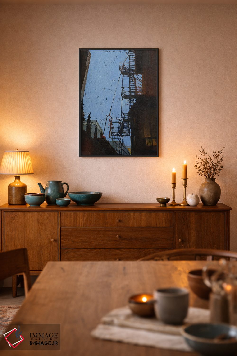 براساس پالت ترکیبی اثر، قاب تیک گرم (چوبی) پیشنهاد اول است و مشکی مات (فریم متوسط) مکمل. برای سفارشهای پروژهای با ابعاد و قابهای اختصاصی با ایماژ در تماس باشید.