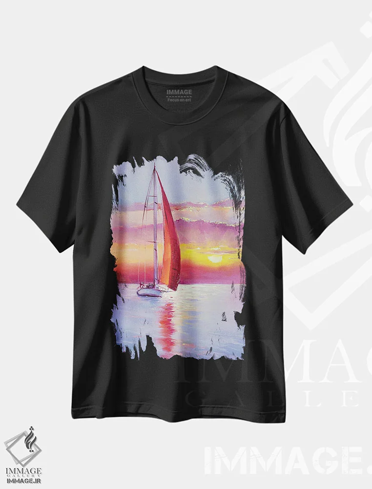 بادبان قرمز در غروب؛ تی شرت دریایی پرانرژی