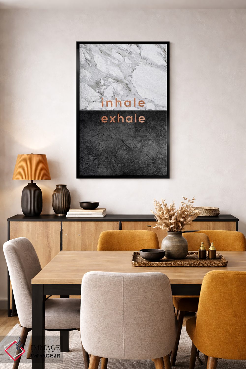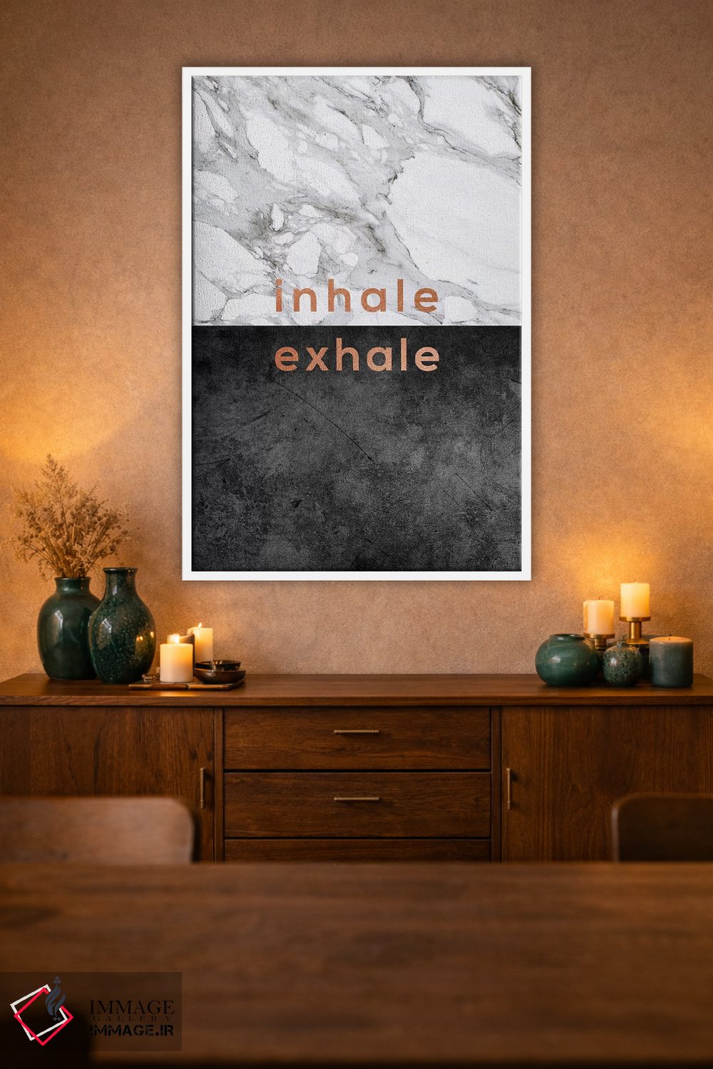 براساس پالت گرم اثر، قاب تیک گرم (چوبی) پیشنهاد اول است و مشکی مات (فریم متوسط) مکمل. برای سفارشهای پروژهای با ابعاد و قابهای اختصاصی با ایماژ در تماس باشید.