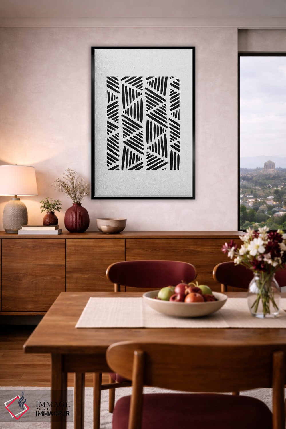براساس پالت خنثی اثر، قاب مشکی مات (فریم باریک) پیشنهاد اول است و سفید مات (فریم باریک) مکمل. برای سفارشهای پروژهای با ابعاد و قابهای اختصاصی با ایماژ در تماس باشید.