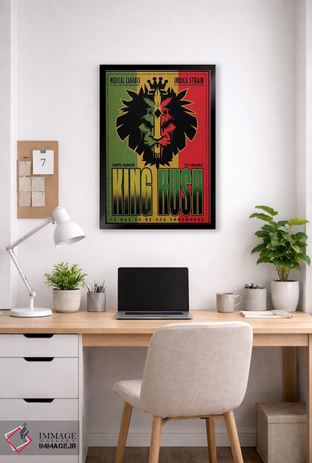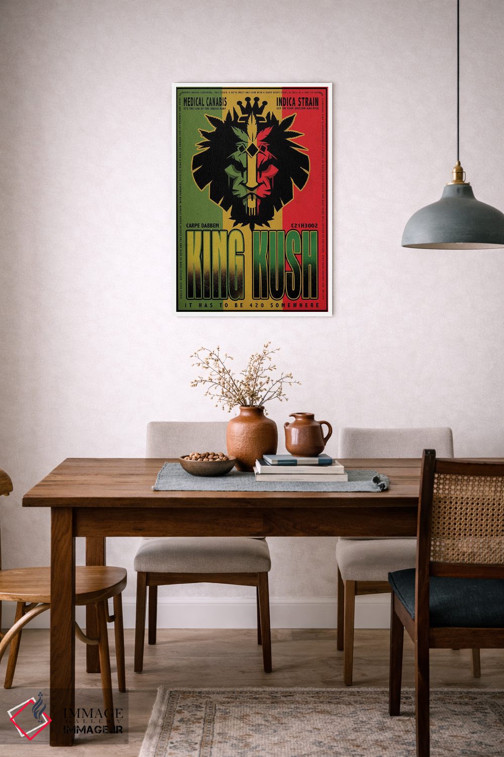 برای دیواری که میخواهید نرمتر دیده شود، «پادشاه کوش» اثرِ «اولد رد تراک (نام هنری/گروه)» در کنار چوب و پارچههای روشن، عالی مینشیند؛ برای نشیمنهای روشن انتخابی خوشسلیقه است. برای دیوار گالری هم ترکیبپذیر و خوشنشین است.