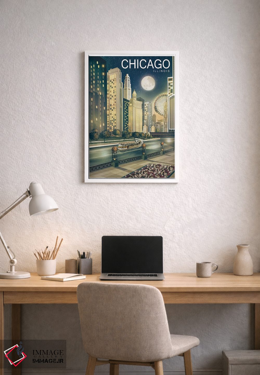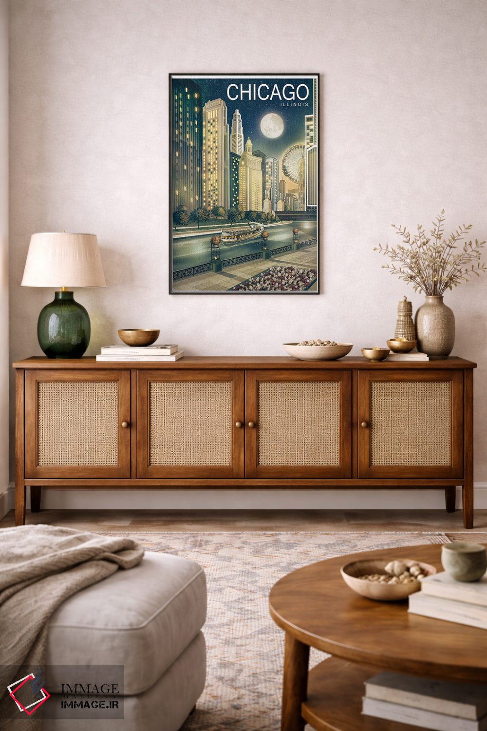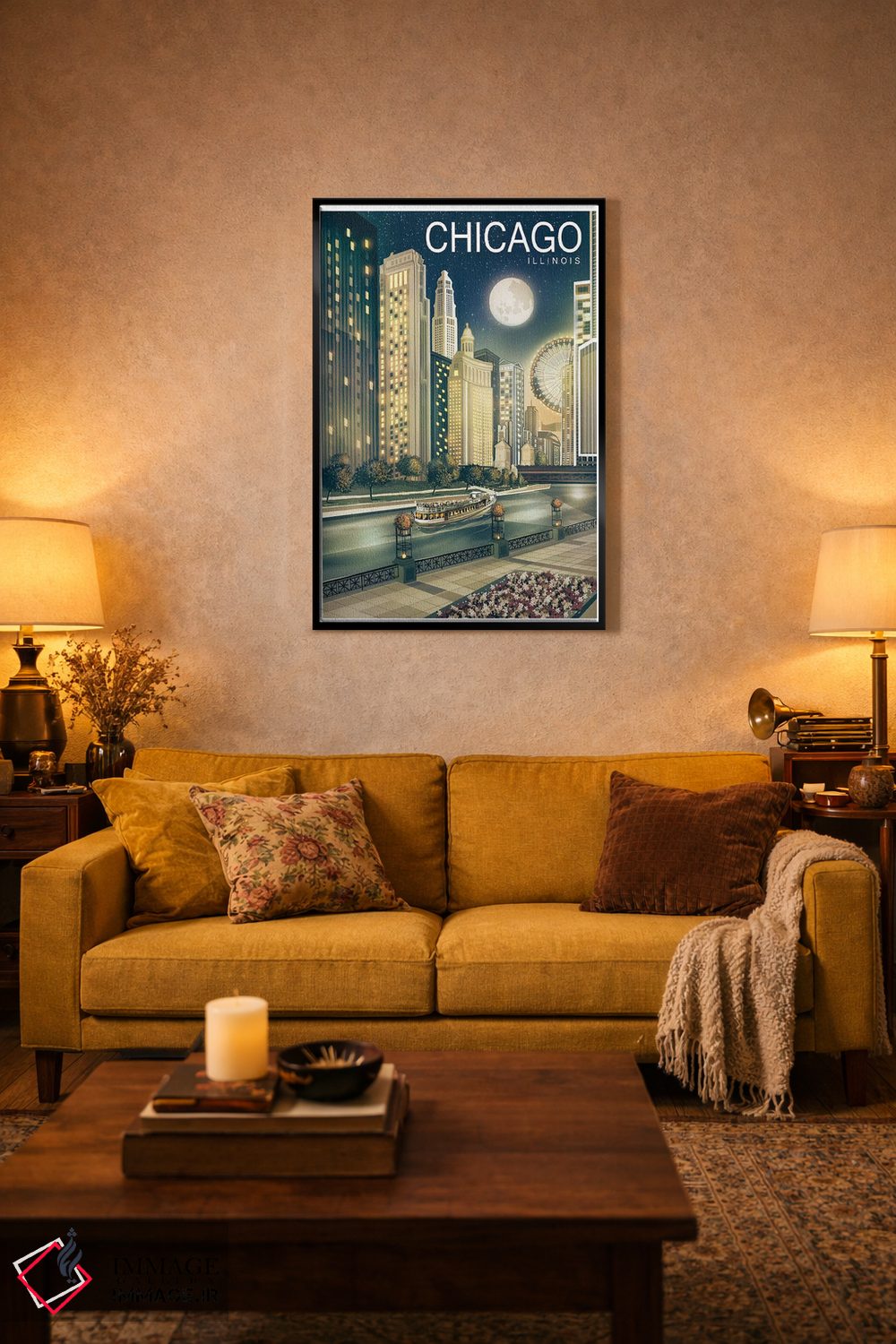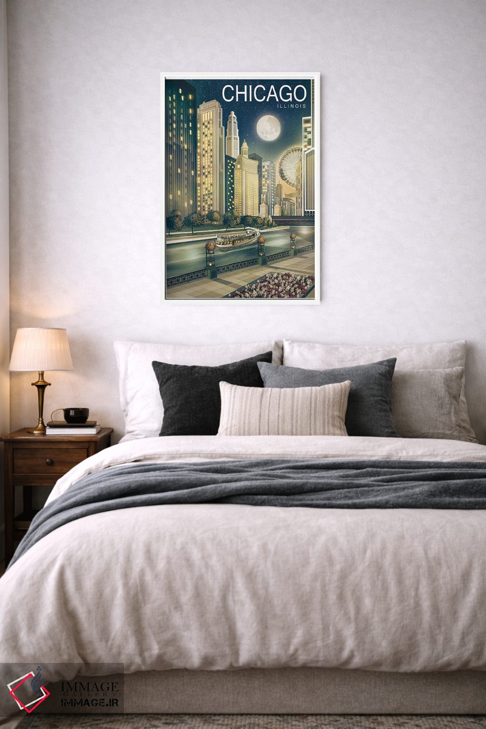 برای نشیمنهای روشن و دیوارهای سفید/طوسی، «شیکاگو دوم» اثرِ «اولد رد تراک (نام هنری/گروه)» با موضوعِ این اثر انتخابی تمیز و چشمنواز است.
