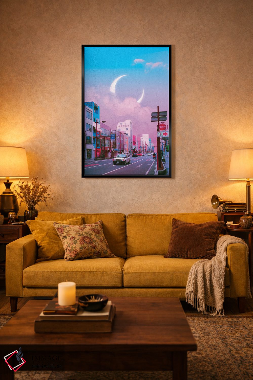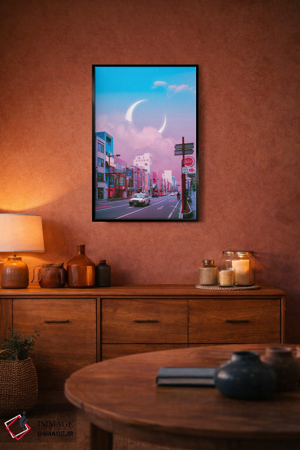 براساس پالت ترکیبی اثر، قاب تیک گرم (چوبی) پیشنهاد اول است و مشکی مات (فریم متوسط) مکمل. برای سفارشهای پروژهای با ابعاد و قابهای اختصاصی با ایماژ در تماس باشید.