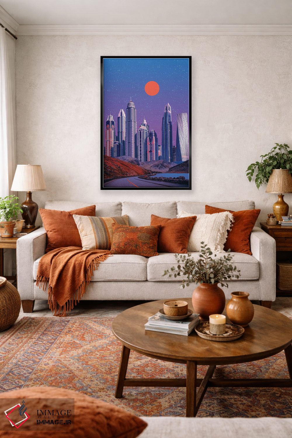 براساس پالت ترکیبی اثر، قاب تیک گرم (چوبی) پیشنهاد اول است و مشکی مات (فریم متوسط) مکمل. برای سفارشهای پروژهای با ابعاد و قابهای اختصاصی با ایماژ در تماس باشید.