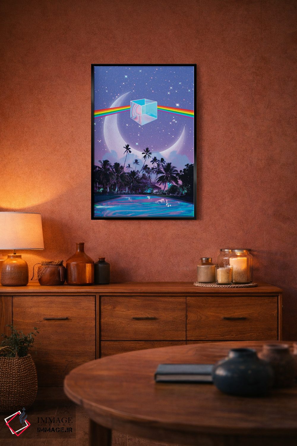 براساس پالت ترکیبی اثر، قاب تیک گرم (چوبی) پیشنهاد اول است و مشکی مات (فریم متوسط) مکمل. برای سفارشهای پروژهای با ابعاد و قابهای اختصاصی با ایماژ در تماس باشید.