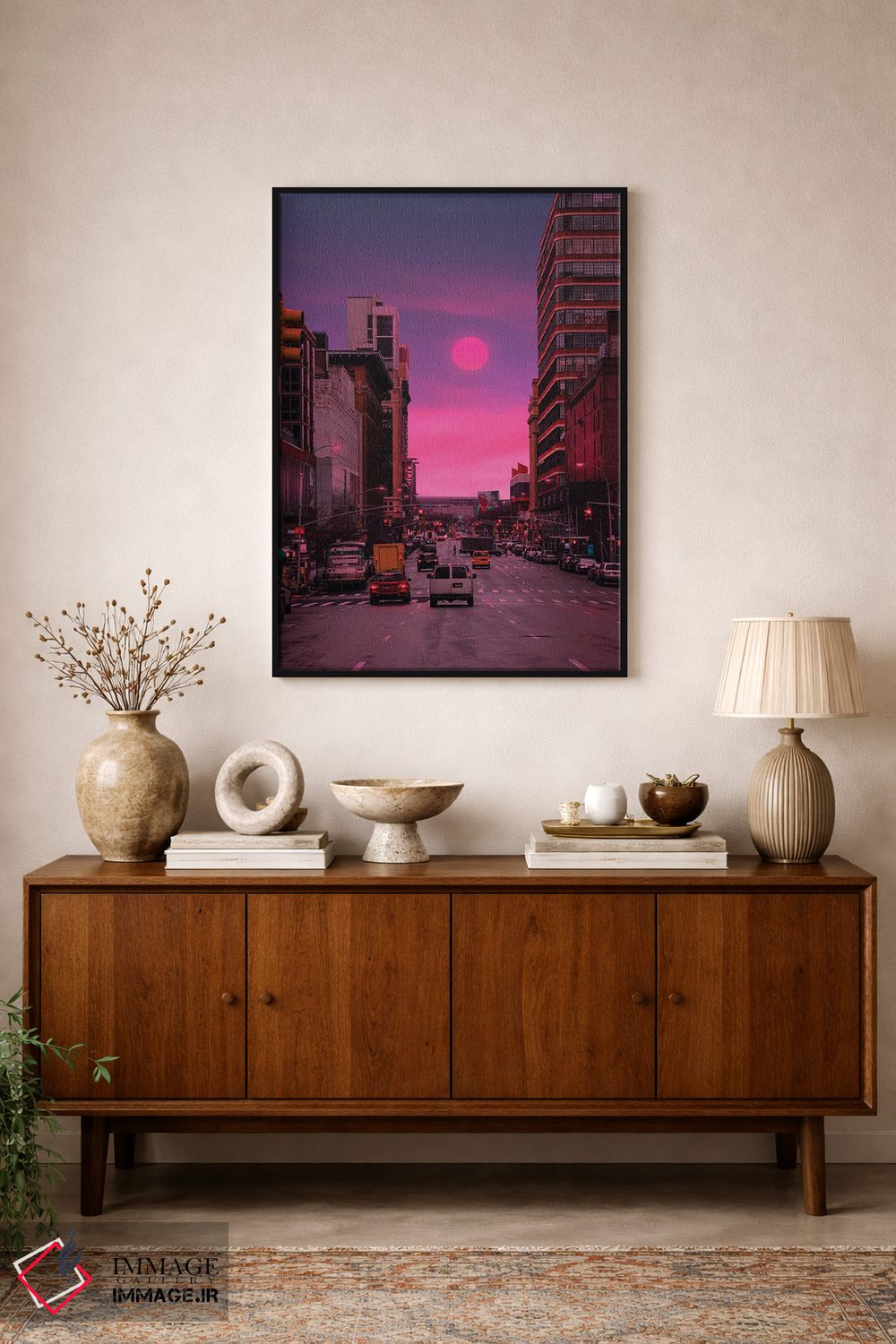 براساس پالت ترکیبی اثر، قاب تیک گرم (چوبی) پیشنهاد اول است و مشکی مات (فریم متوسط) مکمل. برای سفارشهای پروژهای با ابعاد و قابهای اختصاصی با ایماژ در تماس باشید.