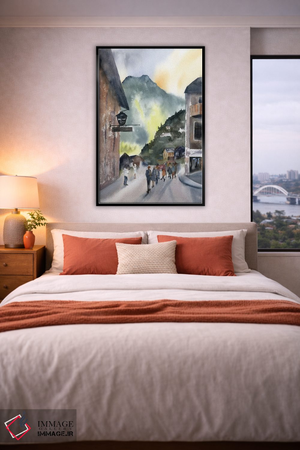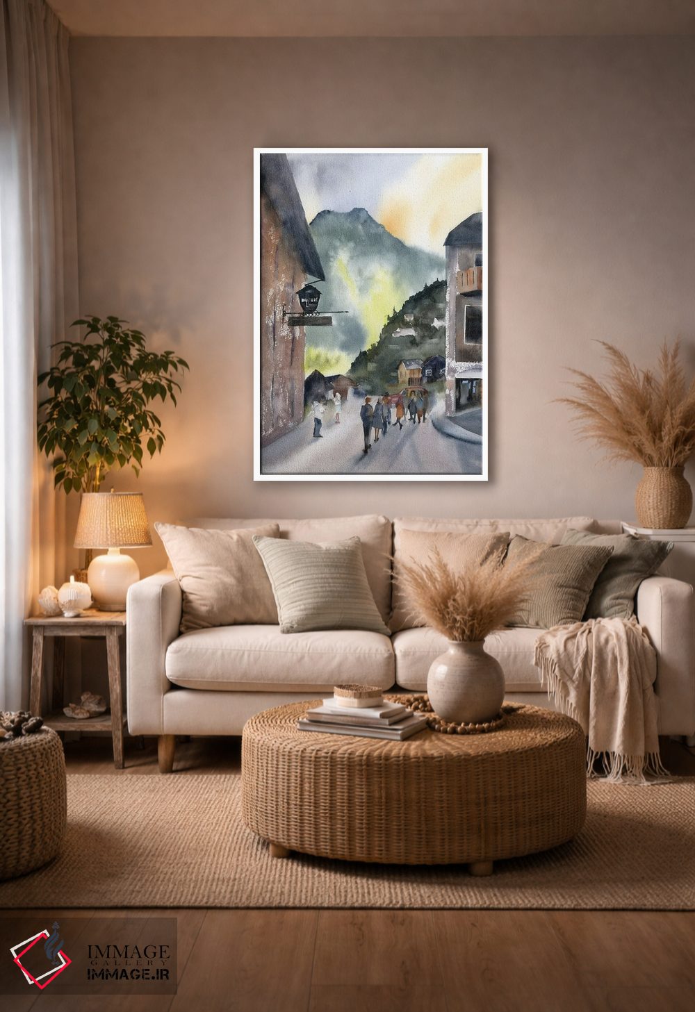 براساس پالت گرم اثر، قاب بلوط روشن (چوبی) پیشنهاد اول است و استخوانی ملایم مکمل. برای سفارشهای پروژهای با ابعاد و قابهای اختصاصی با ایماژ در تماس باشید.