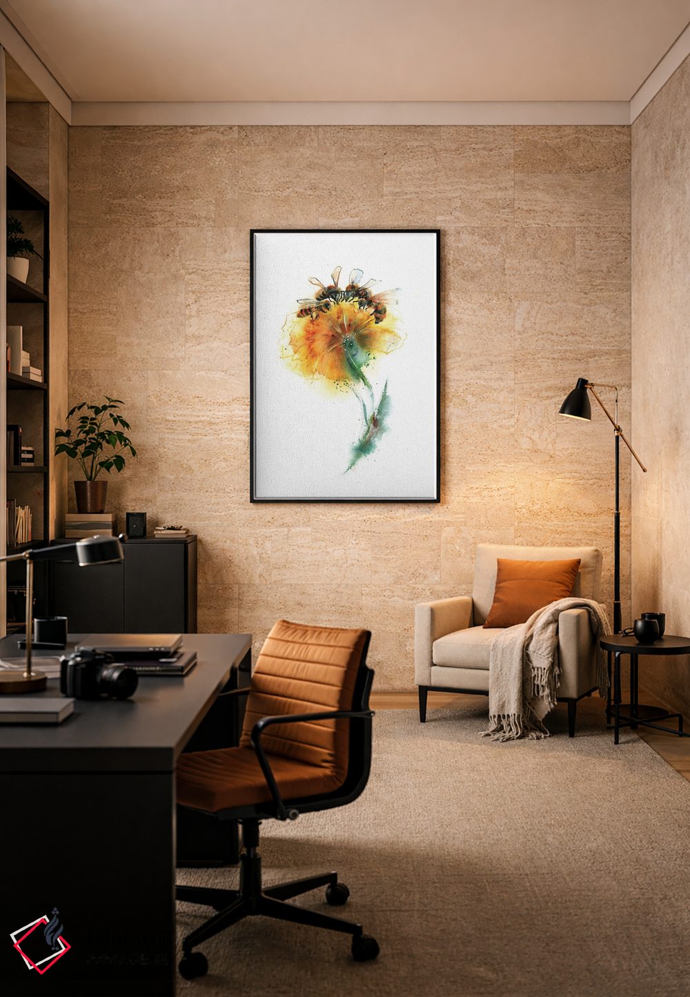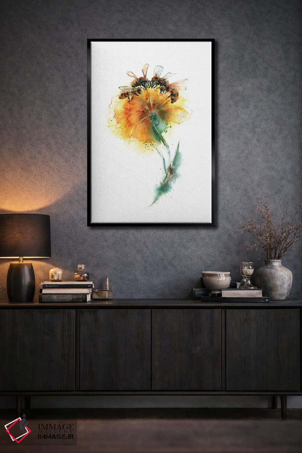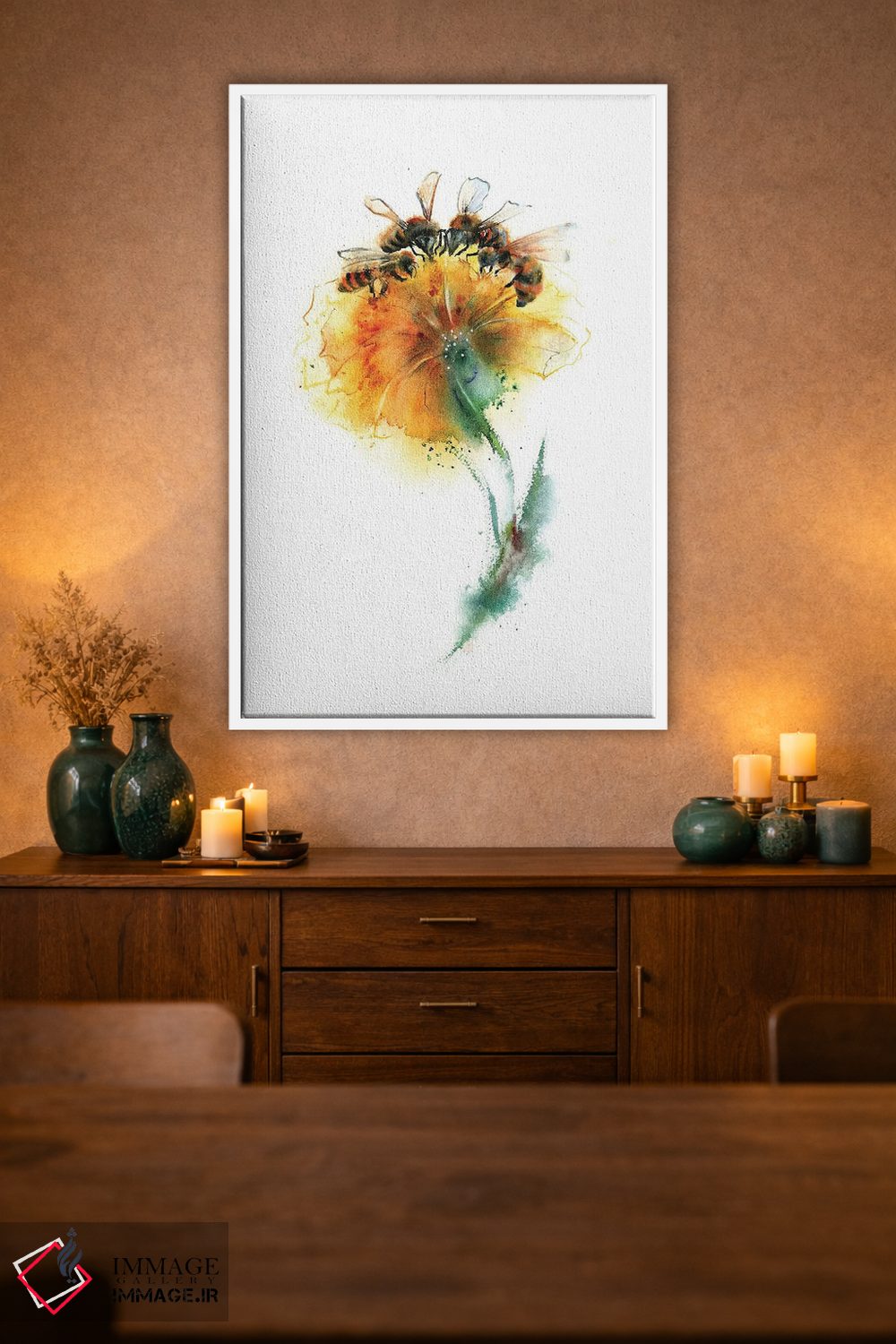 برای دیوارهای ساده، «سه زنبور و گل» اثرِ «الگا چفرانوف» بافت و جزئیات را طوری نشان میدهد که نگاه میماند؛ برای دکورهای مدرن و مینیمال انتخابی خوشسلیقه است. با نورپردازی نقطهای، جذابتر هم میشود.