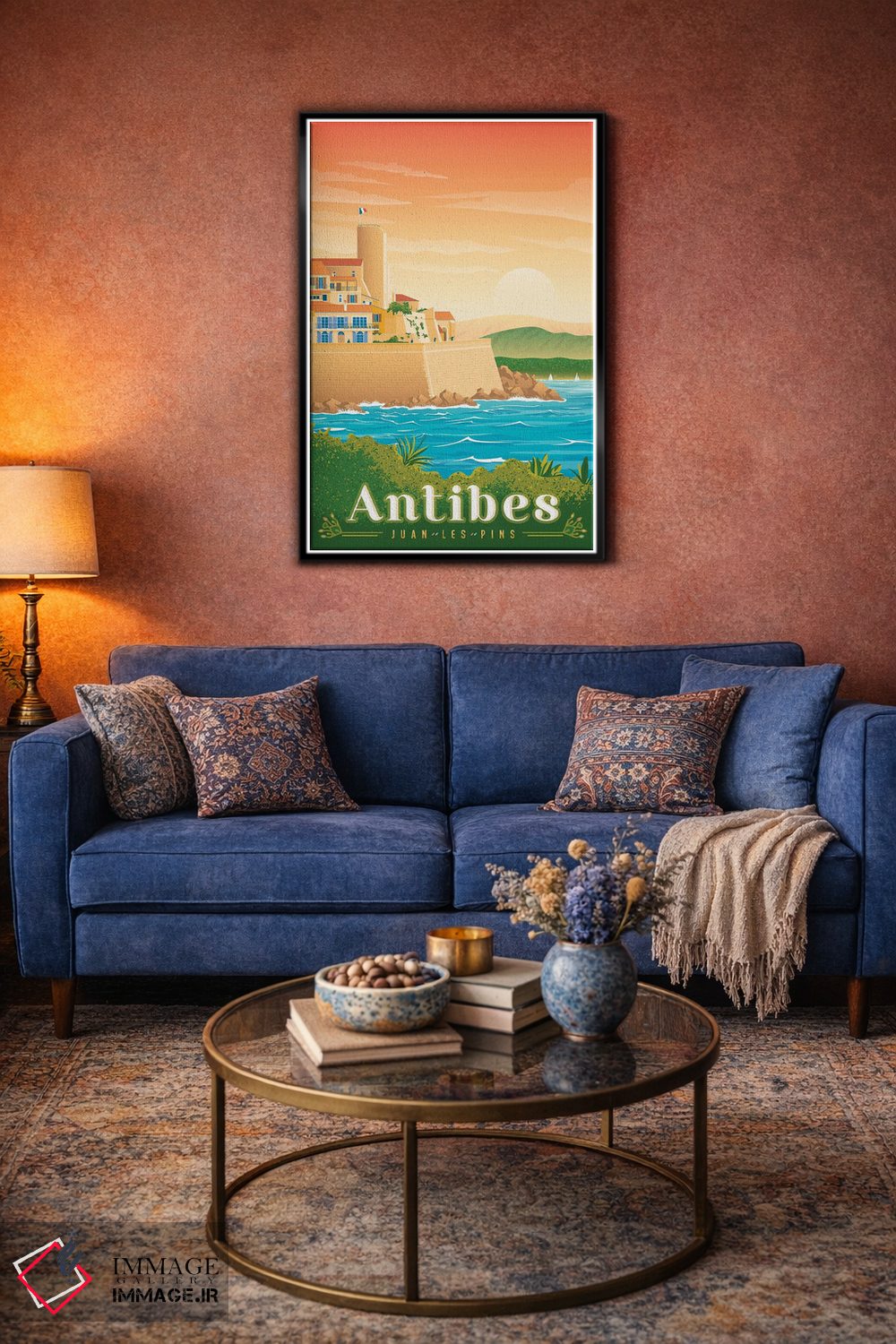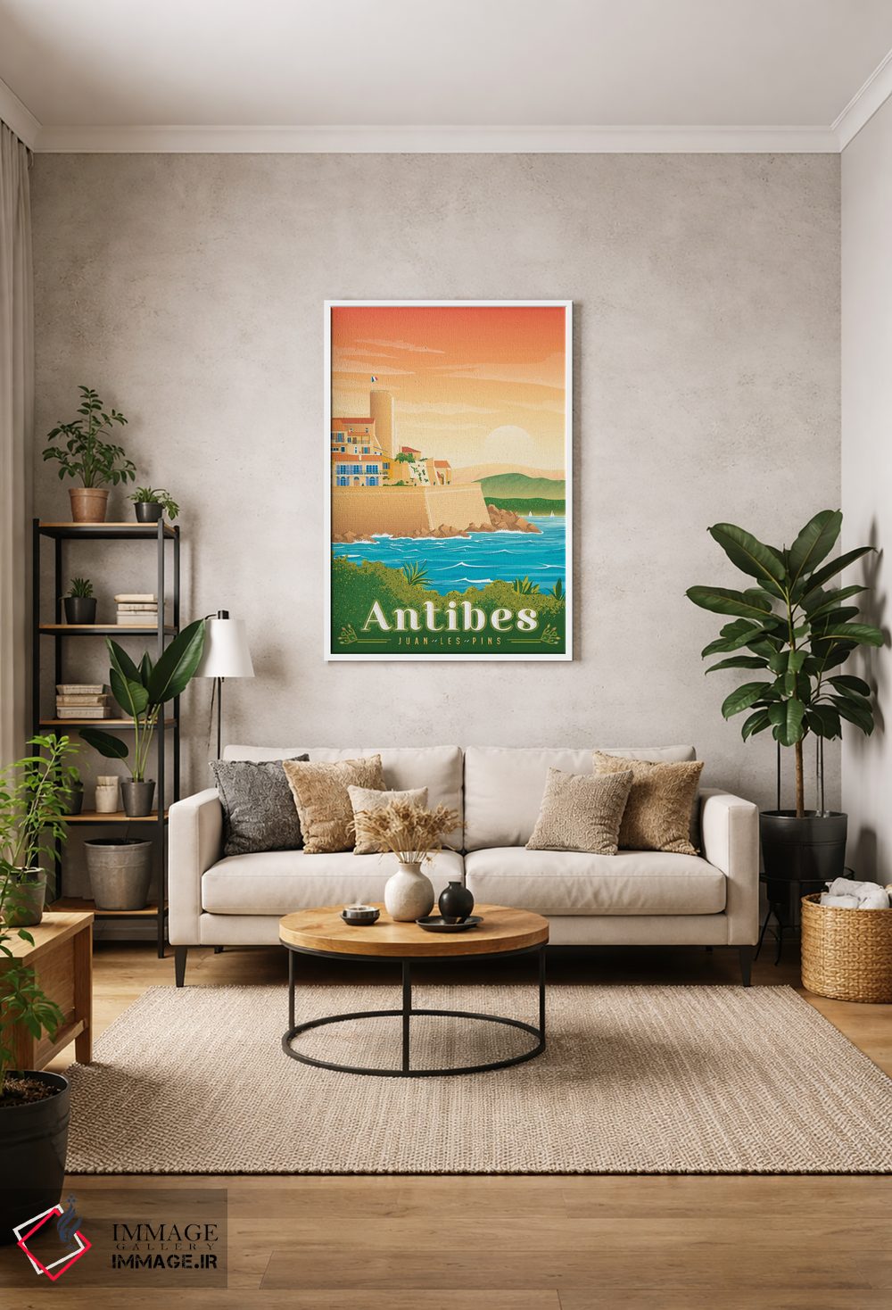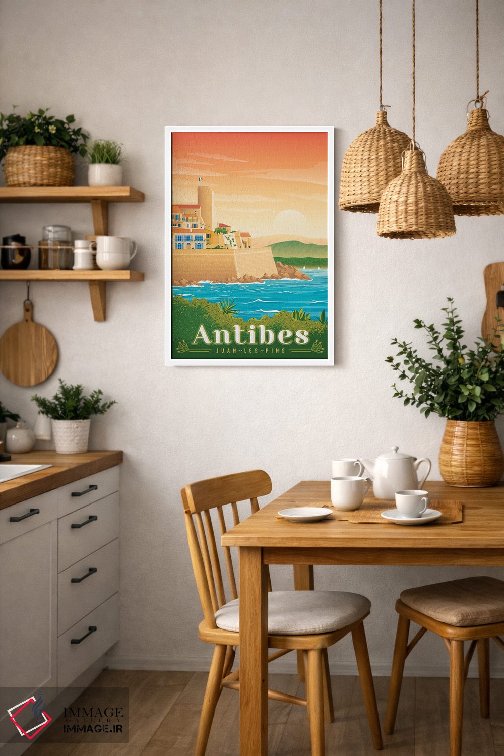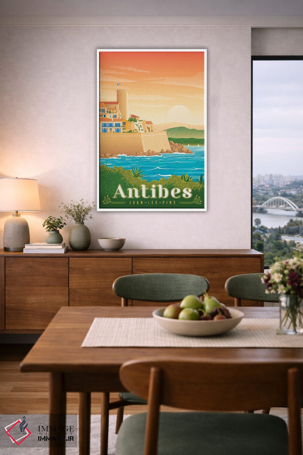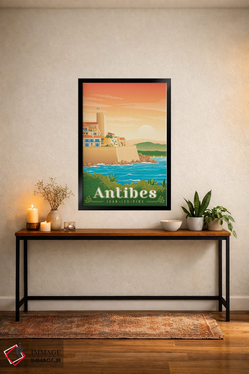 «تصویر سفر آنتیب ژوان له پین فرانسه» اثرِ «اولا هوپ تراول پوسترز (پوسترهای مسافرتی؛ استودیو هنری)» یک قاب شهری و مدرن است؛ موضوعِ این اثر با اجرای هنری، کنار مبلمان ساده خیلی خوب مینشیند.