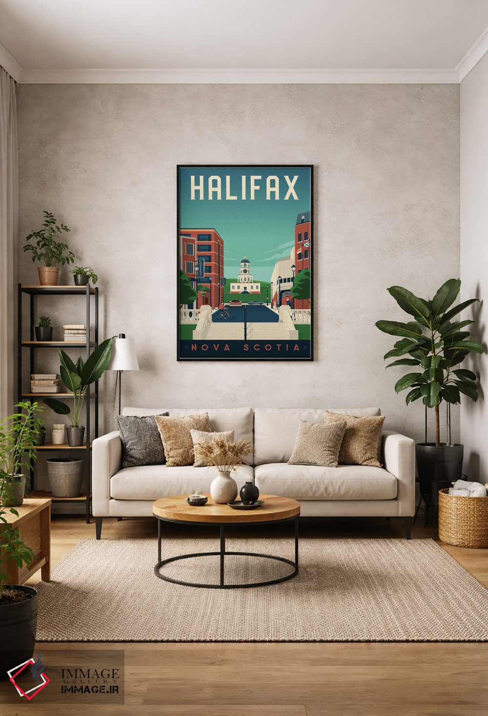 در چیدمانهای صنعتی یا مدرن، «هلیفاکس نوا اسکوشیا کانادا (تصویرسازی سفر)» اثرِ «اولا هوپ تراول پوسترز (پوسترهای مسافرتی؛ استودیو هنری)» با موضوعِ این اثر و زبان هنری خوب میدرخشد.