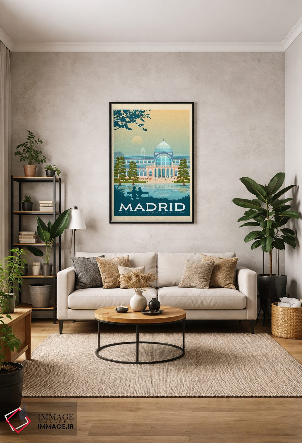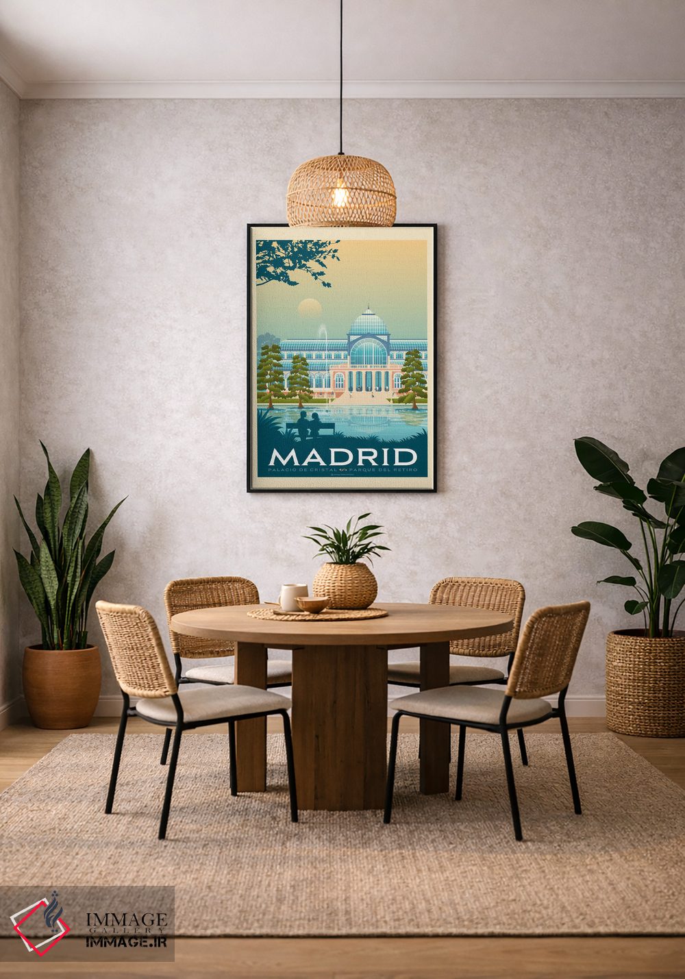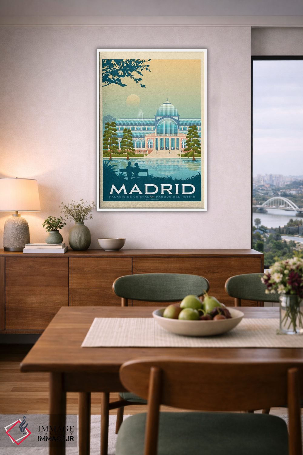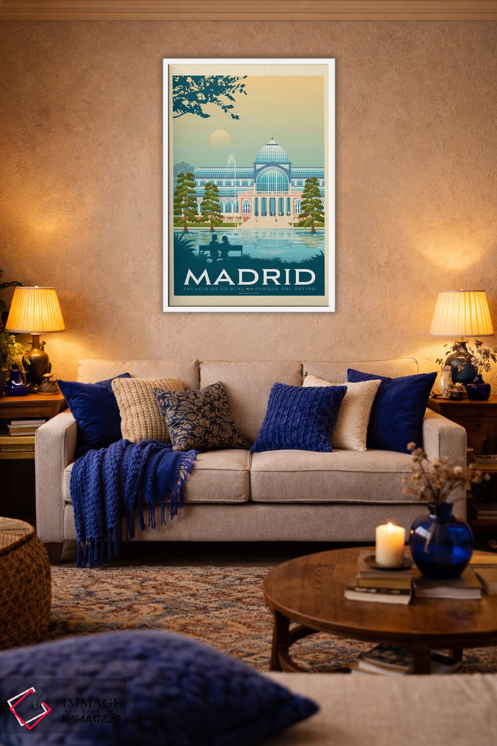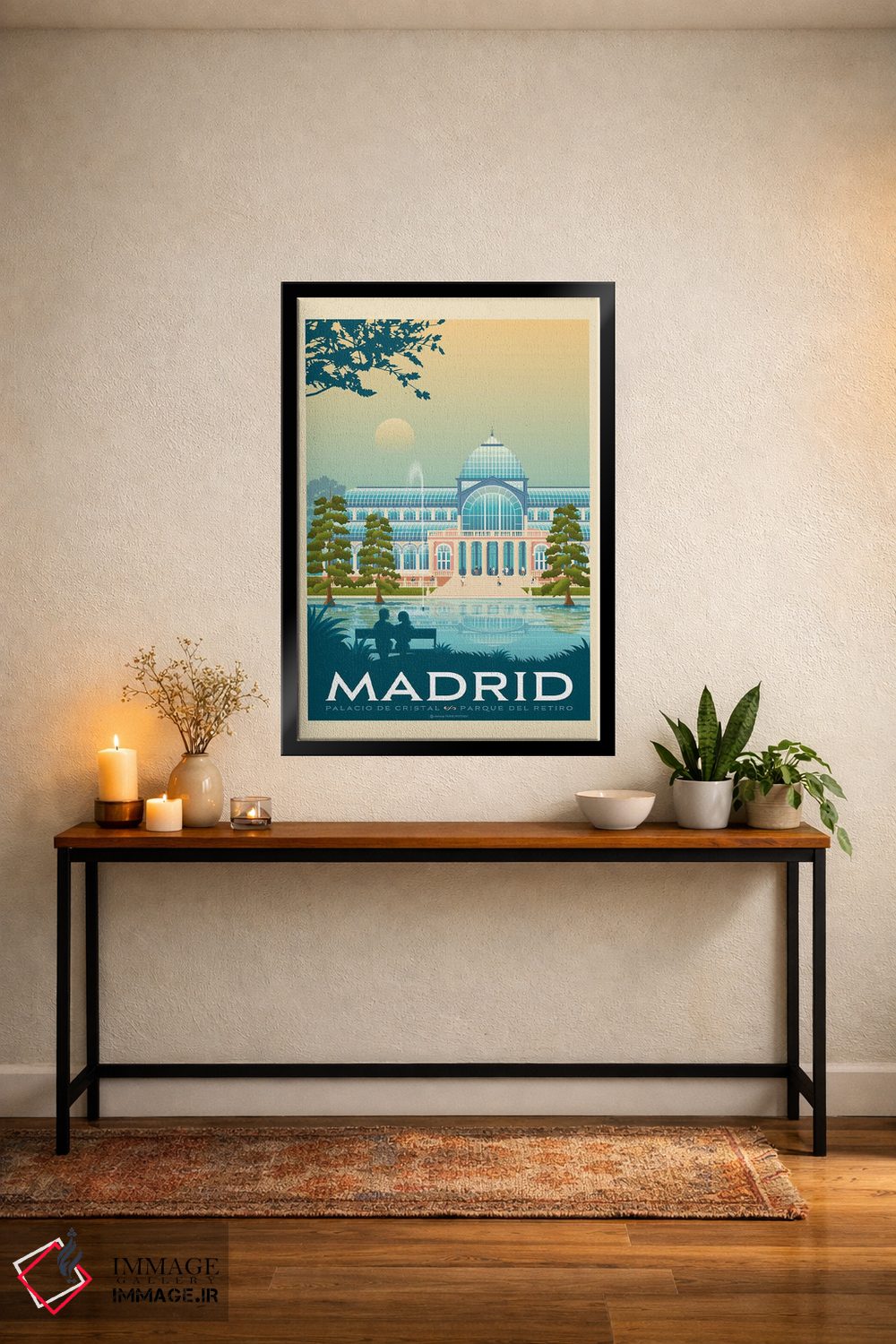 «پوستر سفر مادرید اسپانیا» اثرِ «اولا هوپ تراول پوسترز (پوسترهای مسافرتی؛ استودیو هنری)» از آن تابلوهاییست که هم لطیف است، هم دکورپذیر؛ مخصوصاًً با موضوعِ این اثر.