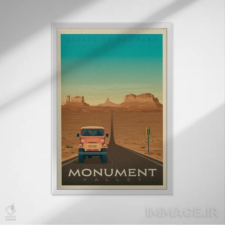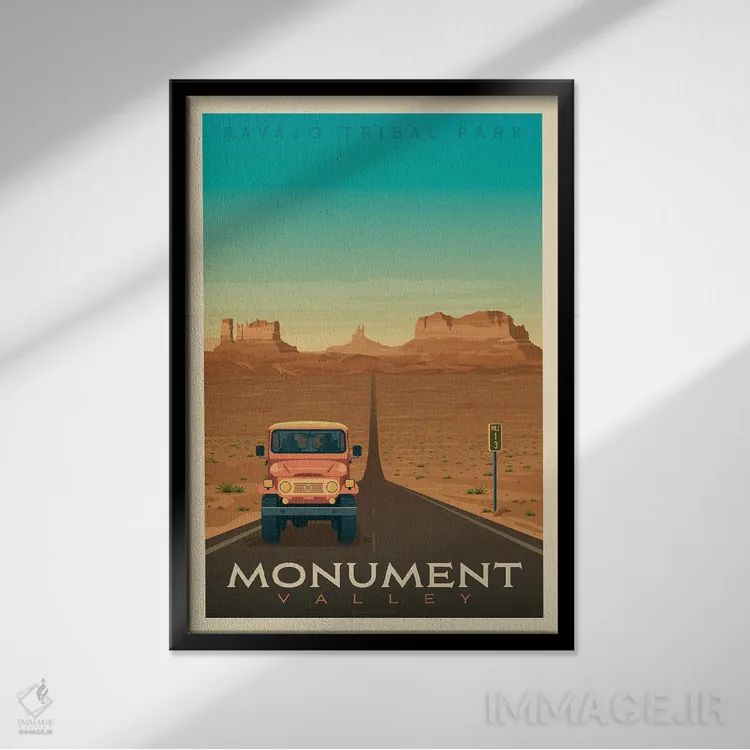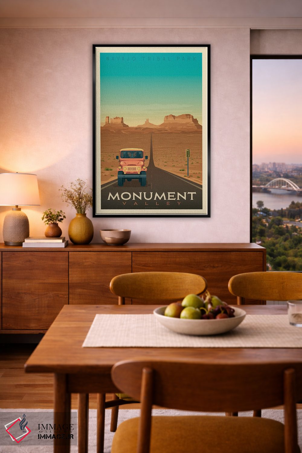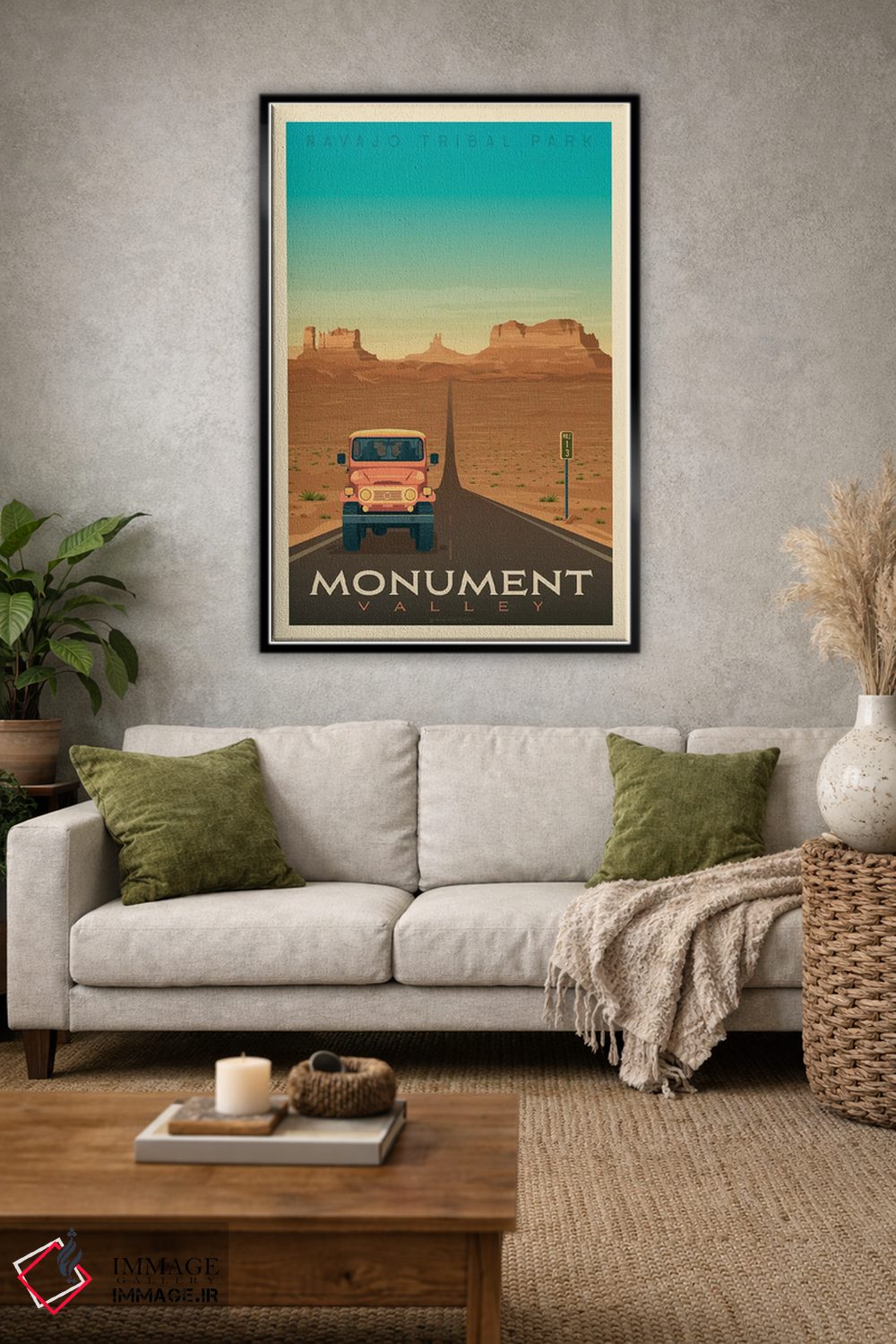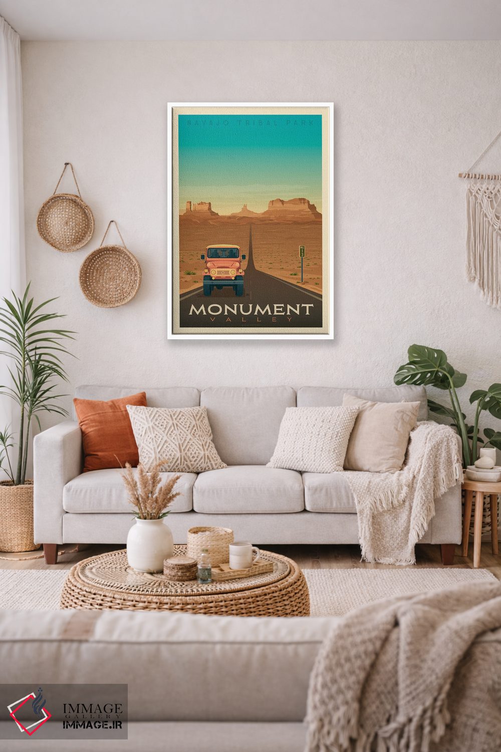 برای ترکیب با گلدانهای سبز، پارچههای ساده و نور گرم، «پوستر سفر به پارک ملی دره مونومنت» اثرِ «اولا هوپ تراول پوسترز (پوسترهای مسافرتی؛ استودیو هنری)» با موضوعِ این اثر انتخابی هماهنگ است.