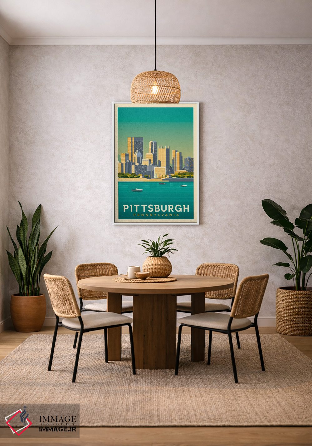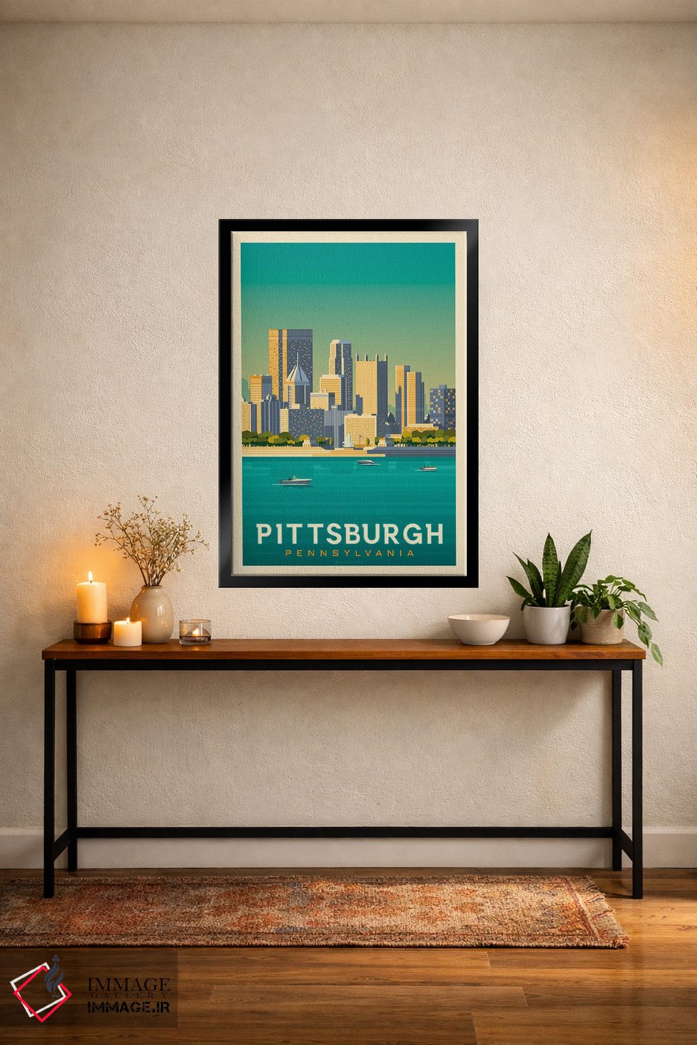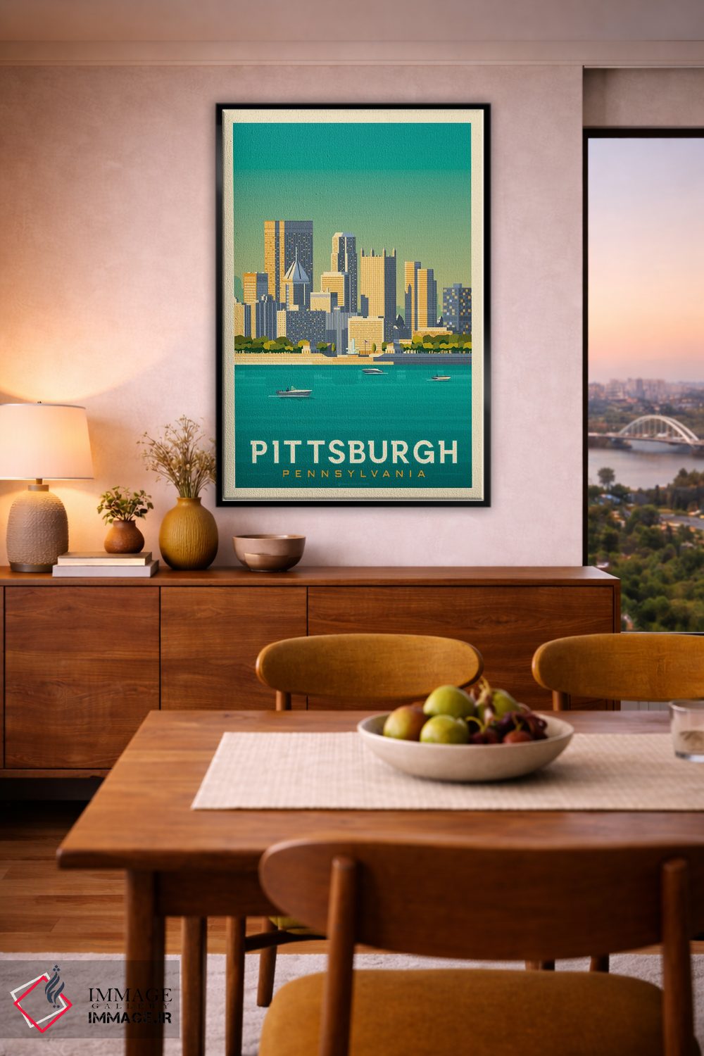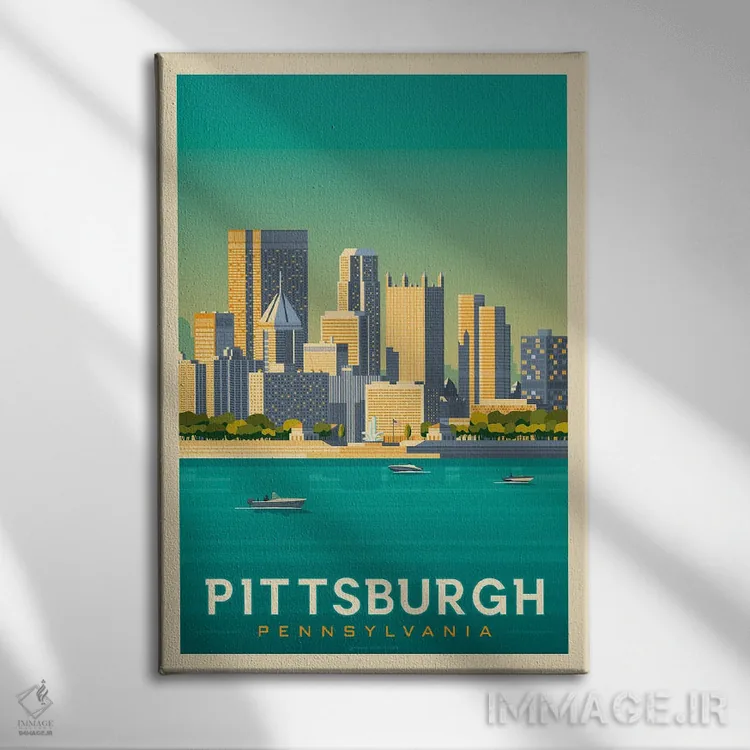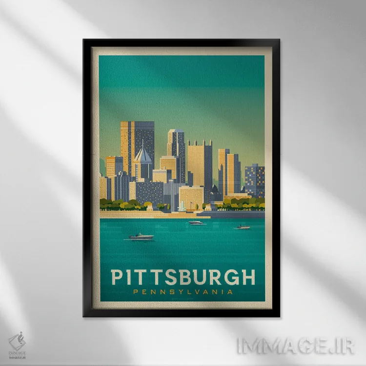 «پوستر سفر پیتسبرگ پنسیلوانیا» اثرِ «اولا هوپ تراول پوسترز (پوسترهای مسافرتی؛ استودیو هنری)» با موضوعِ این اثر، یک نقطهٔ آرام برای چشم میسازد—و با پرداختی هنری خیلی خوشنشین است.