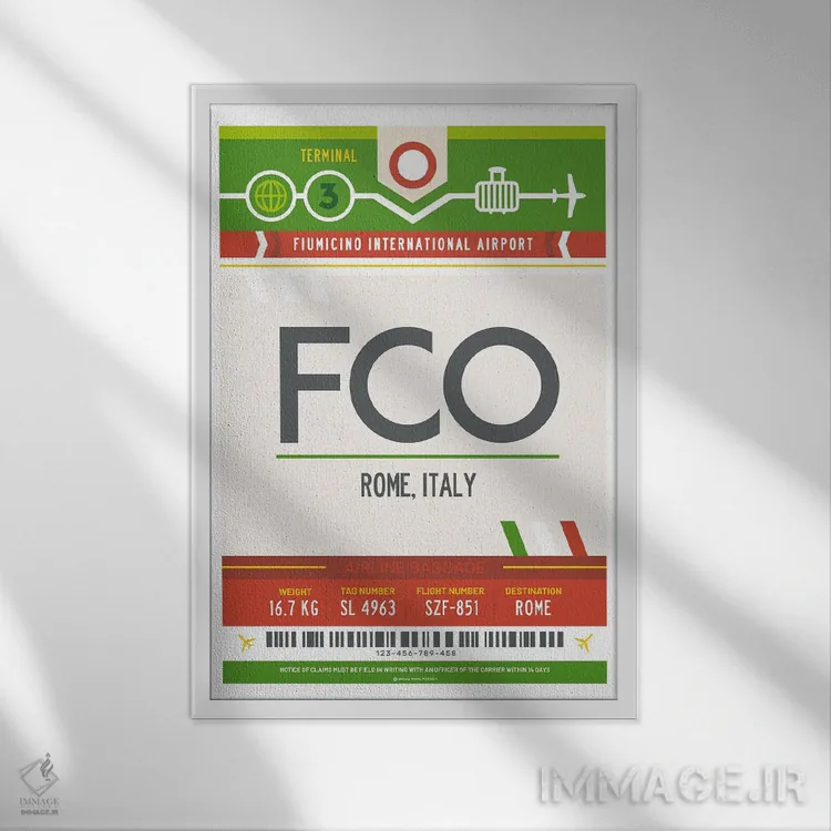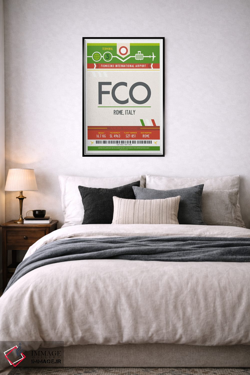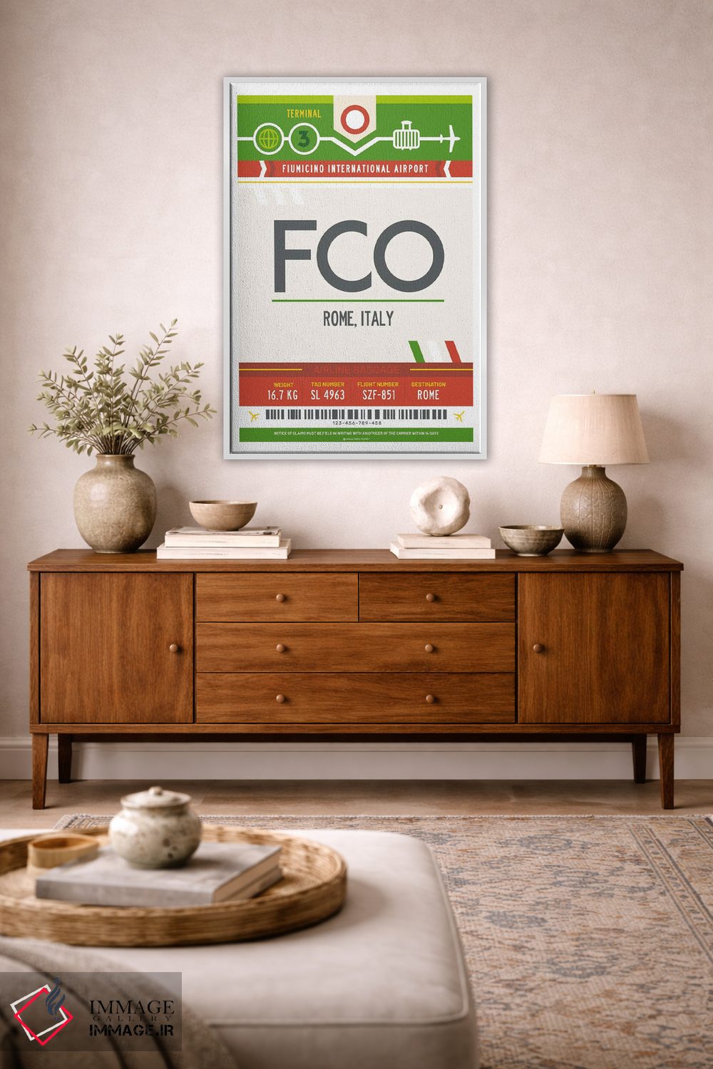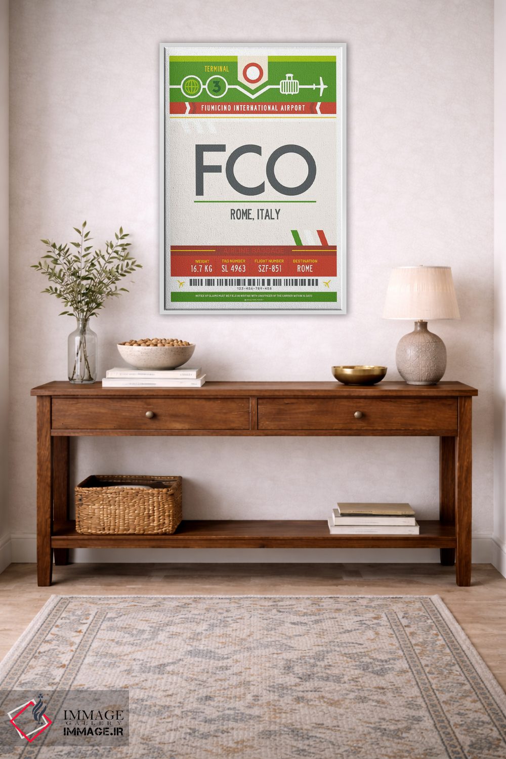 «پوستر سفر با برچسب فرودگاه رم» اثرِ «اولا هوپ تراول پوسترز (پوسترهای مسافرتی؛ استودیو هنری)» با حالوهوای این اثر، برای بالای کنسول یا کنار قابهای ساده، ترکیب چشمنوازی میسازد.