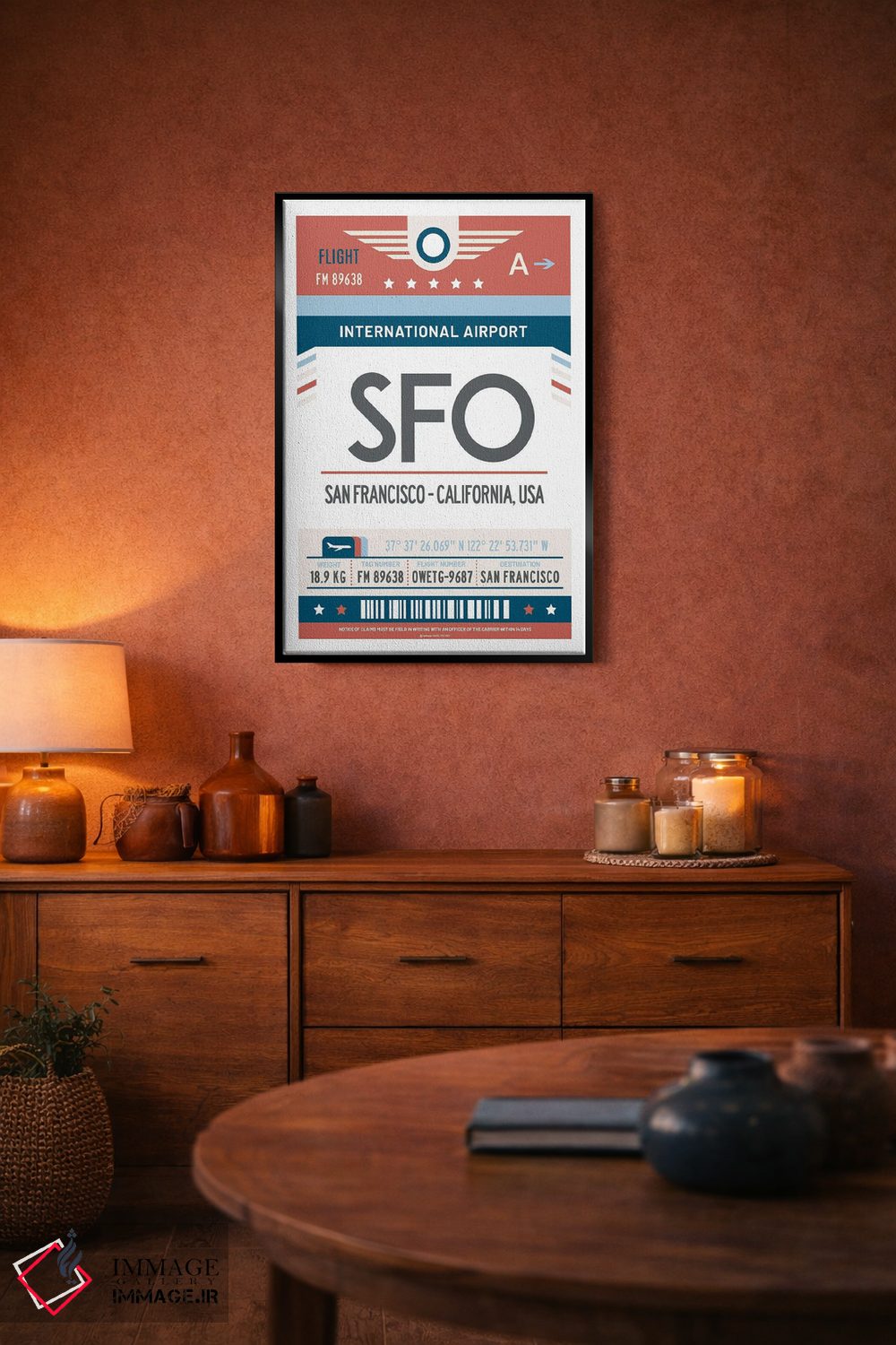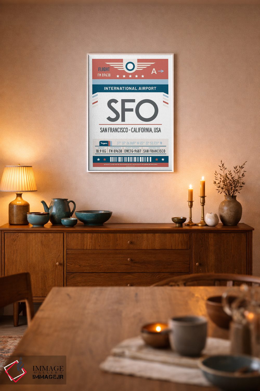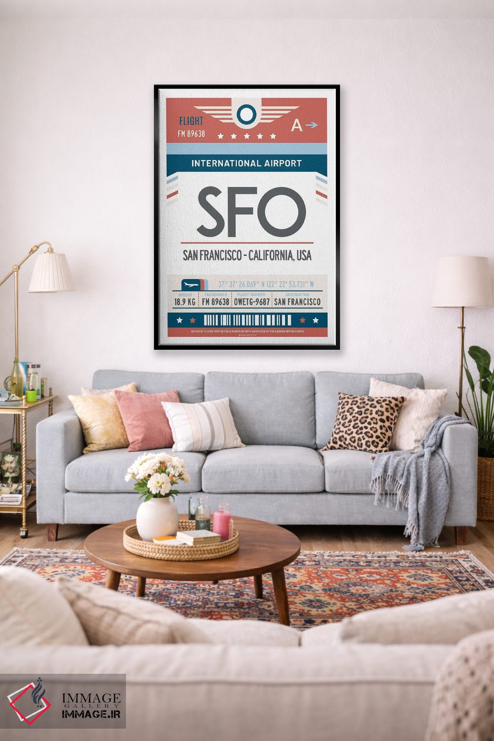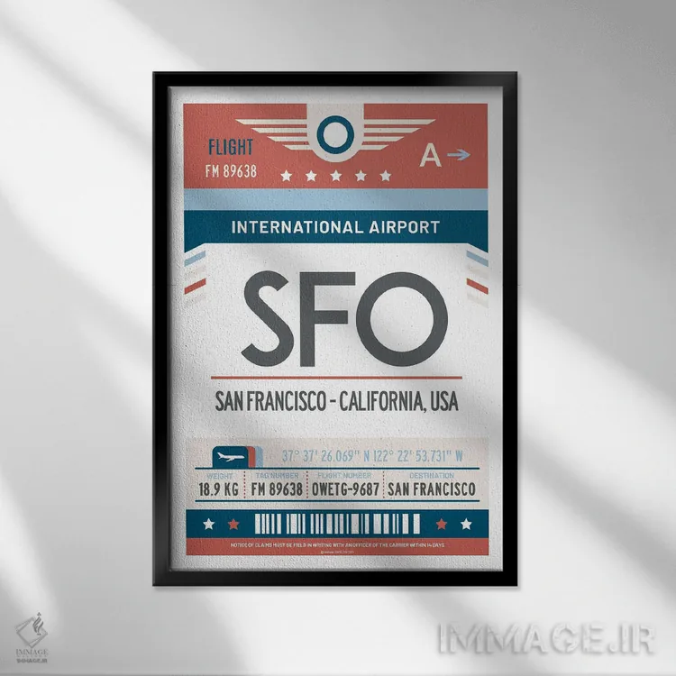 برای نشیمنهای روشن و دیوارهای سفید/طوسی، «پوستر سفر با برچسب فرودگاه سان فرانسیسکو» اثرِ «اولا هوپ تراول پوسترز (پوسترهای مسافرتی؛ استودیو هنری)» با موضوعِ این اثر انتخابی تمیز و چشمنواز است.