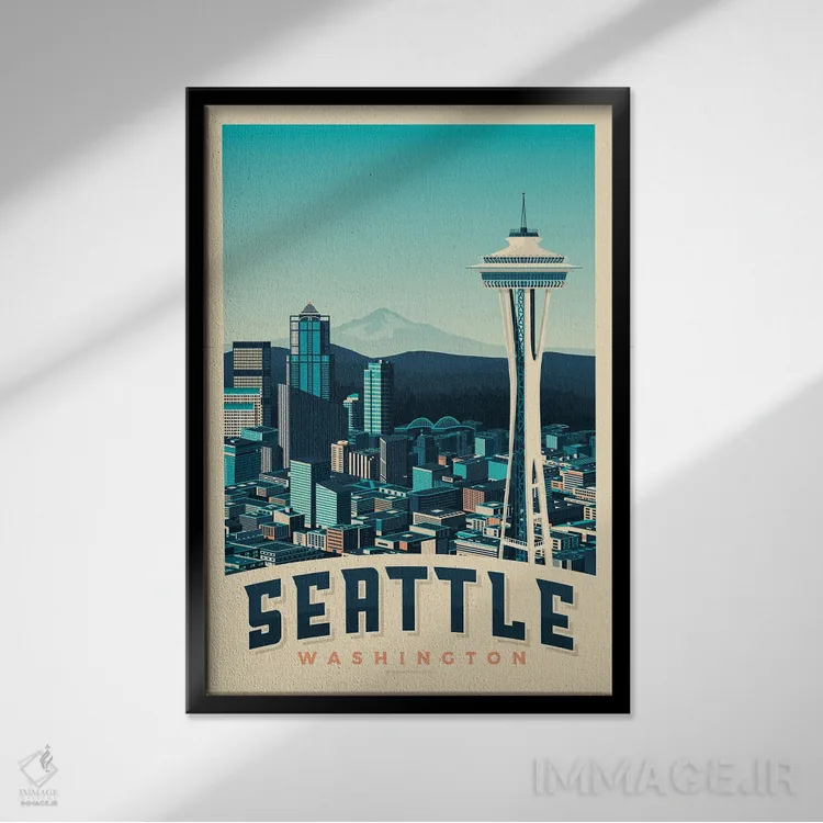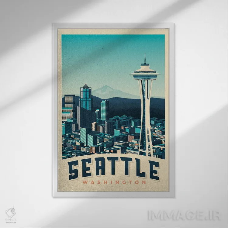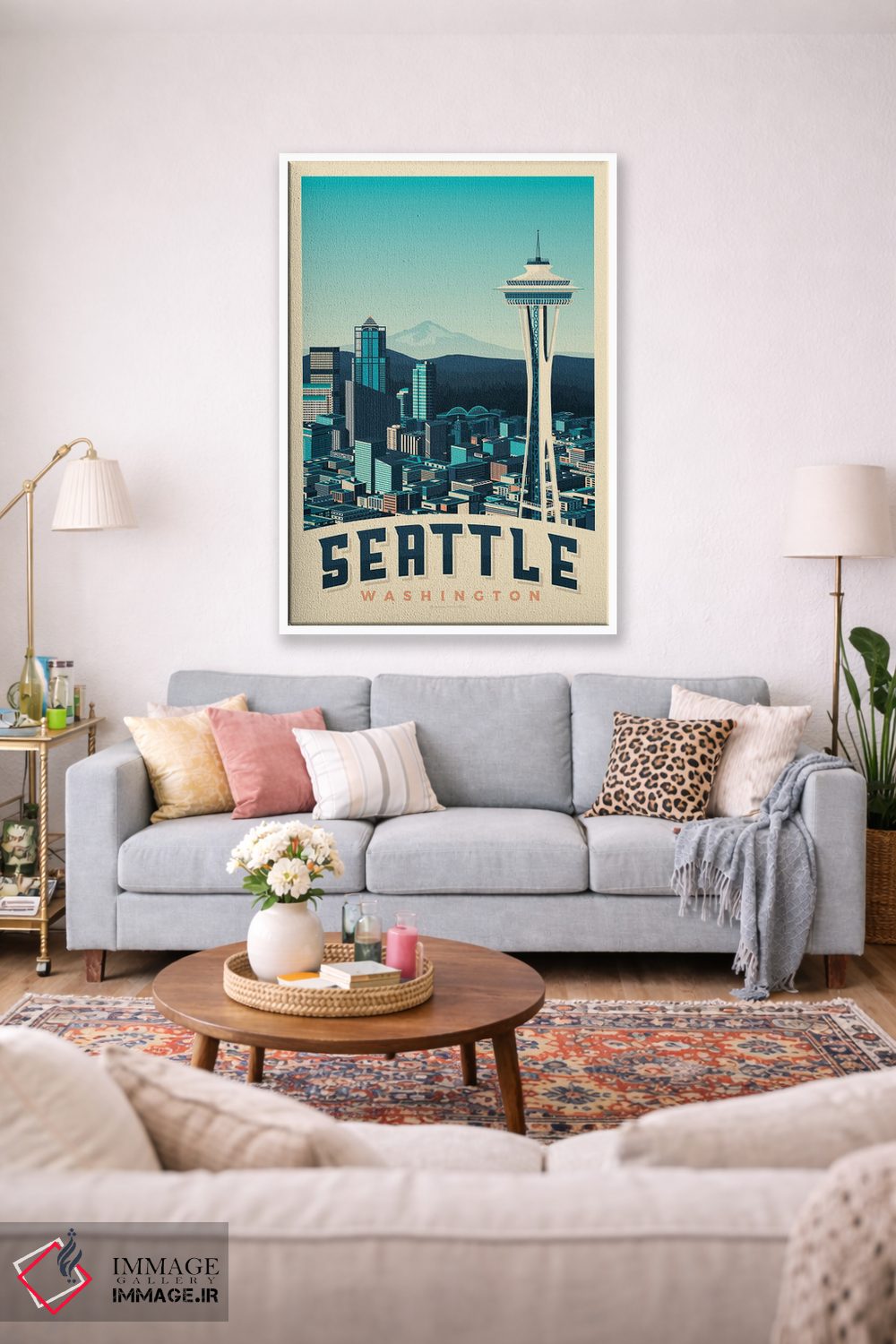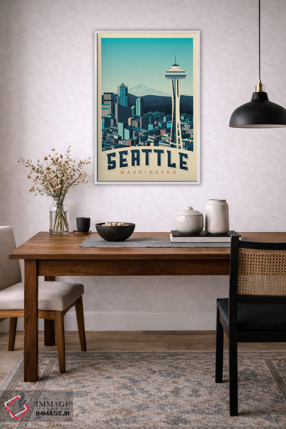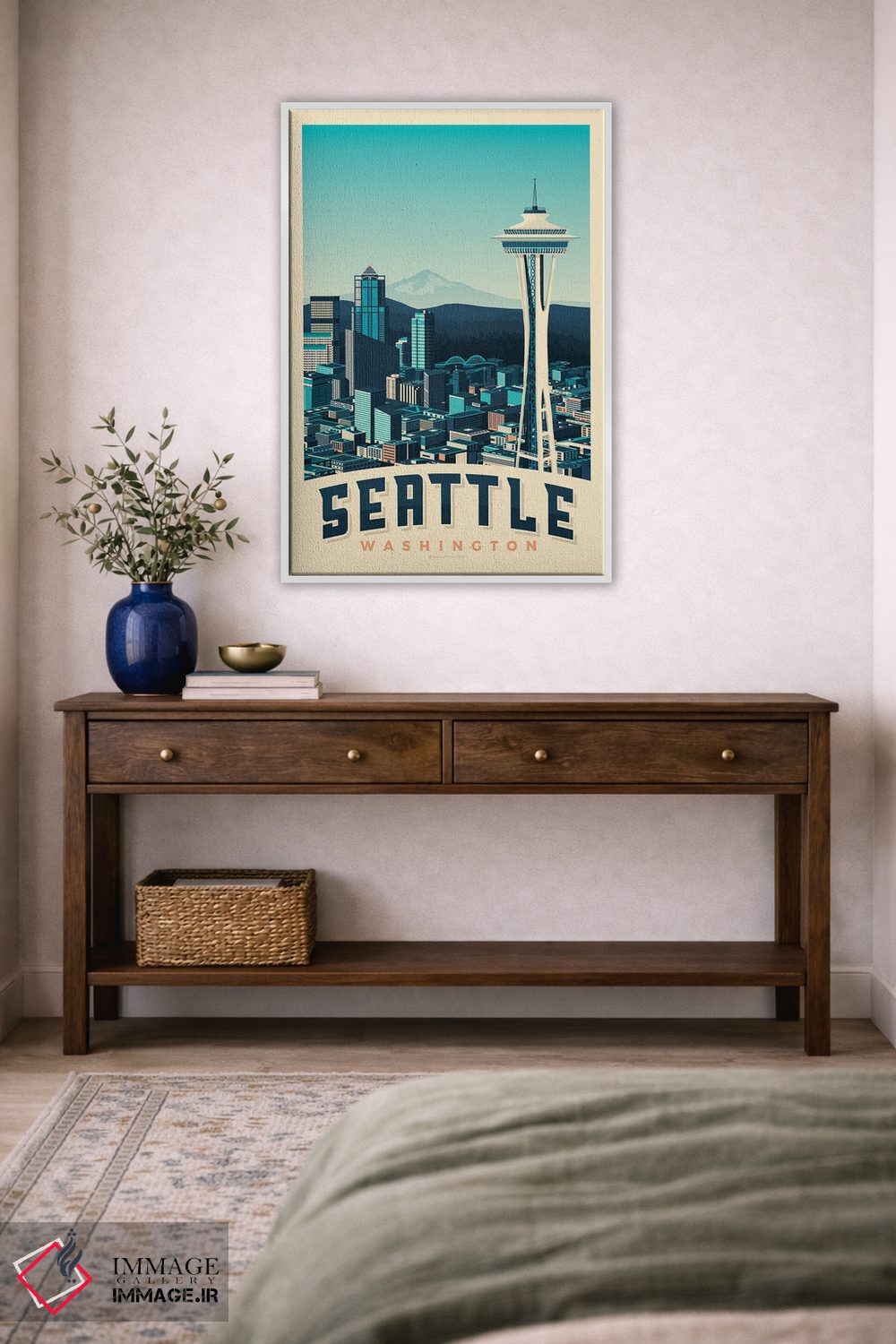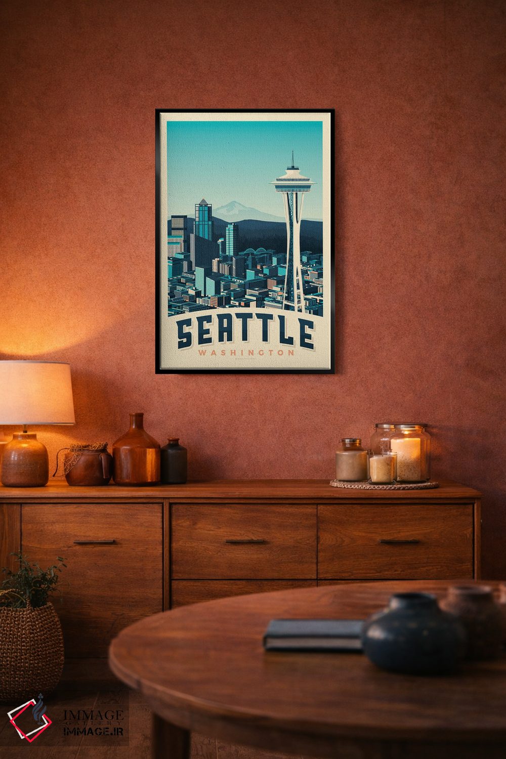 برای ترکیب با گلدانهای سبز، پارچههای ساده و نور گرم، «پوستر سفر به برج اسپیس نیدل سیاتل» اثرِ «اولا هوپ تراول پوسترز (پوسترهای مسافرتی؛ استودیو هنری)» با موضوعِ این اثر انتخابی هماهنگ است.