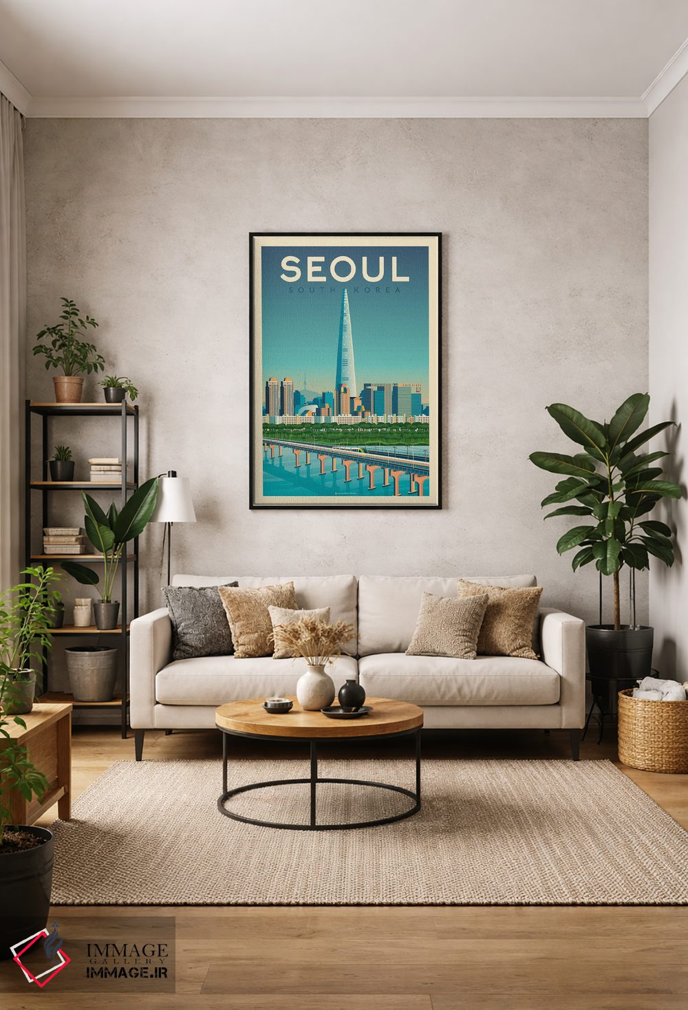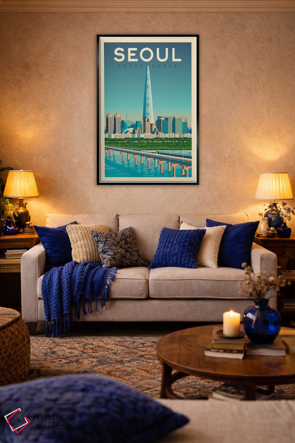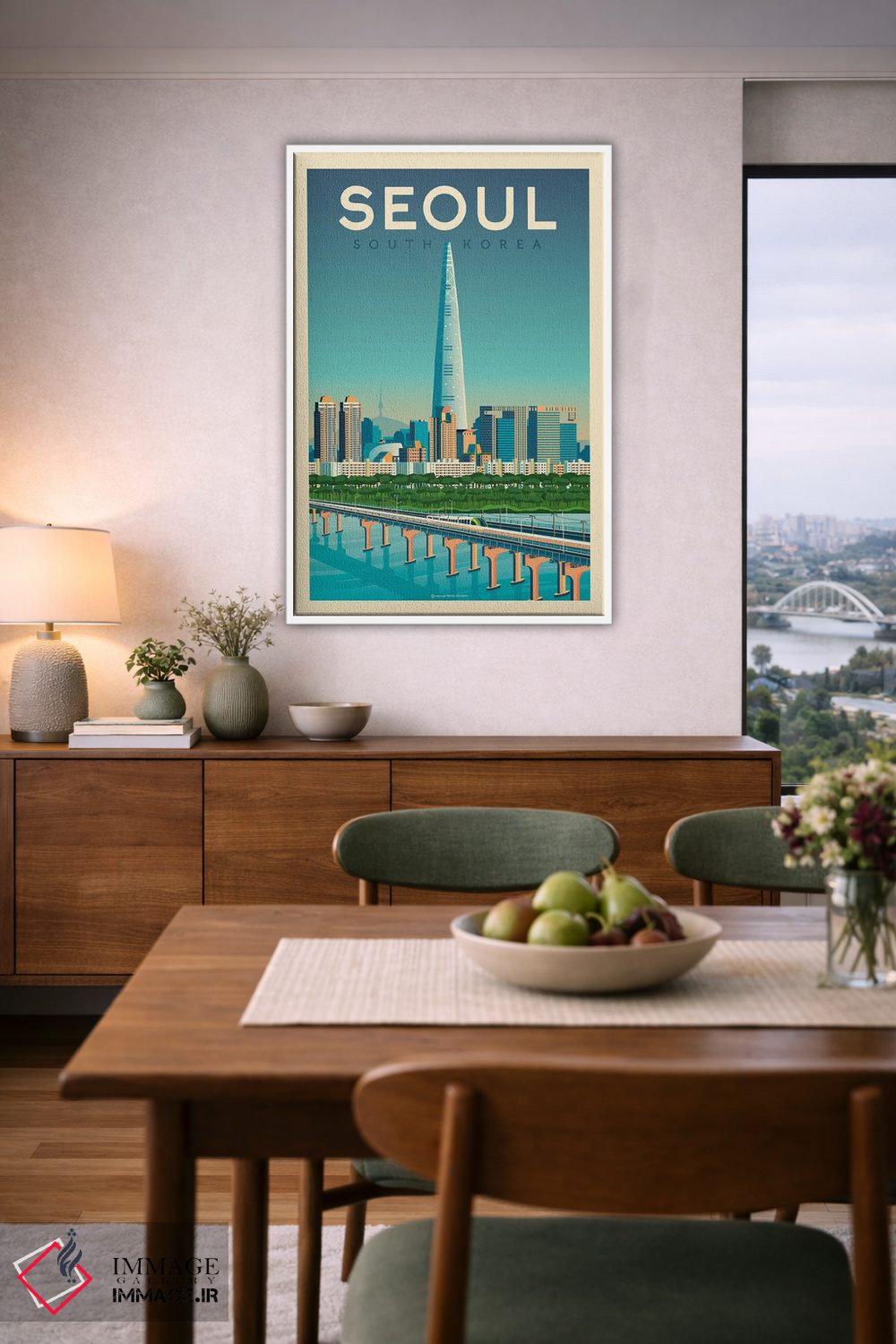 «پوستر سفر سئول کره جنوبی» اثرِ «اولا هوپ تراول پوسترز (پوسترهای مسافرتی؛ استودیو هنری)» از آن تابلوهاییست که هم لطیف است، هم دکورپذیر؛ مخصوصاًً با موضوعِ این اثر.