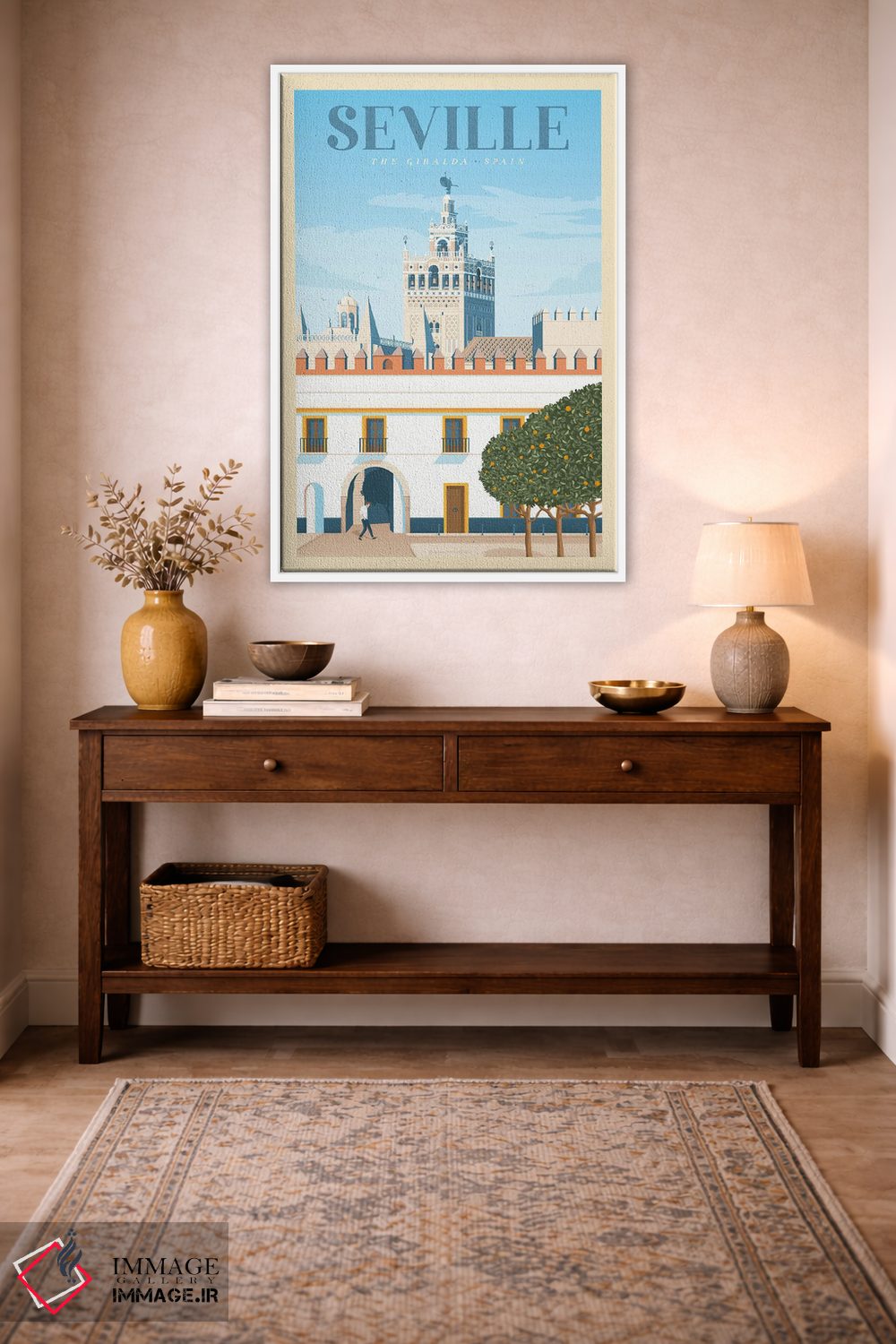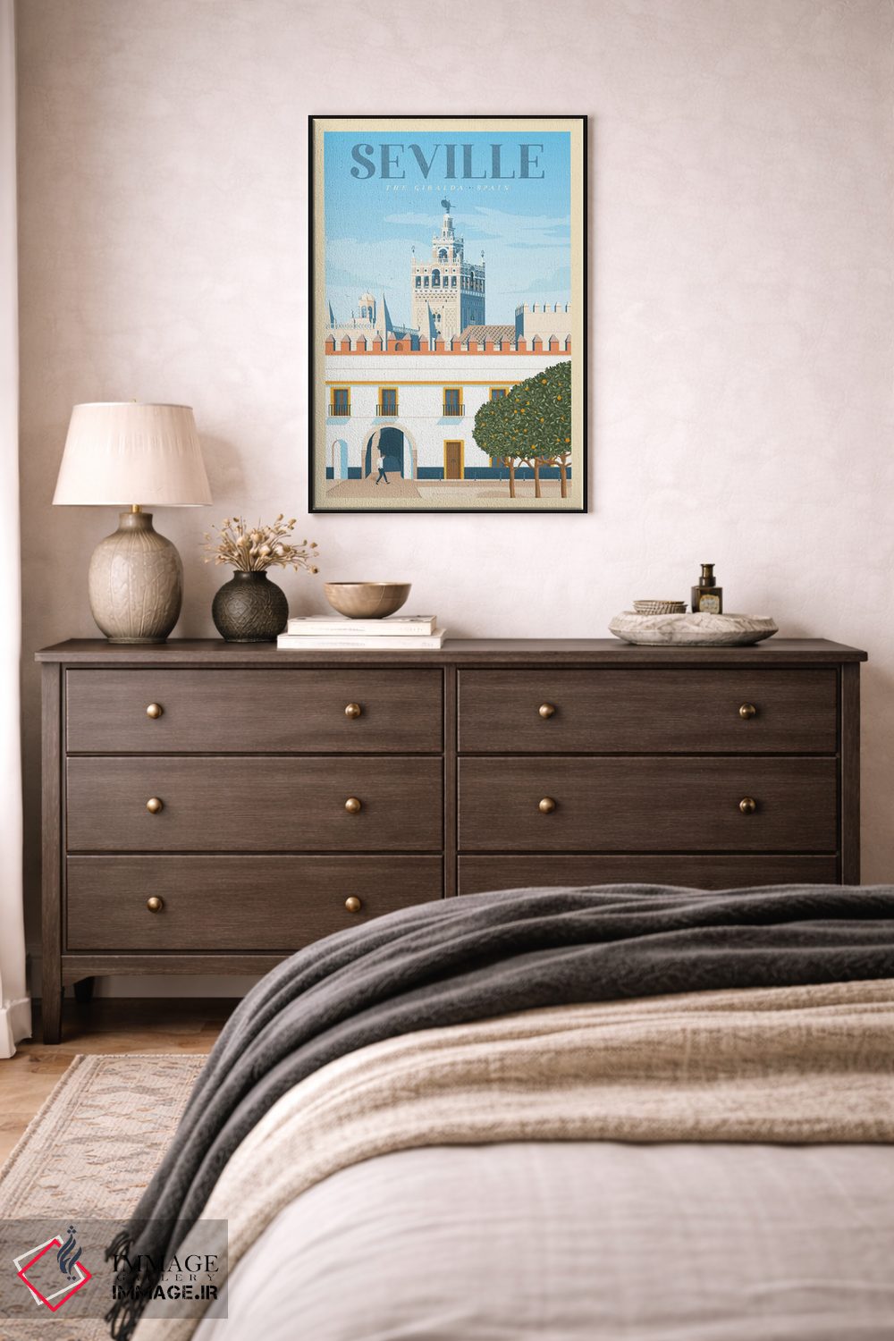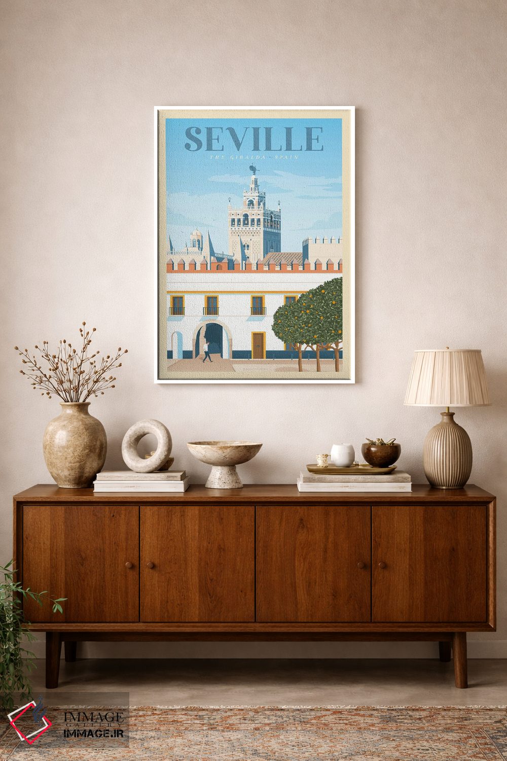 برای ترکیب با گلدانهای سبز، پارچههای ساده و نور گرم، «پوستر سفر سویل آندلسیا» اثرِ «اولا هوپ تراول پوسترز (پوسترهای مسافرتی؛ استودیو هنری)» با موضوعِ این اثر انتخابی هماهنگ است.