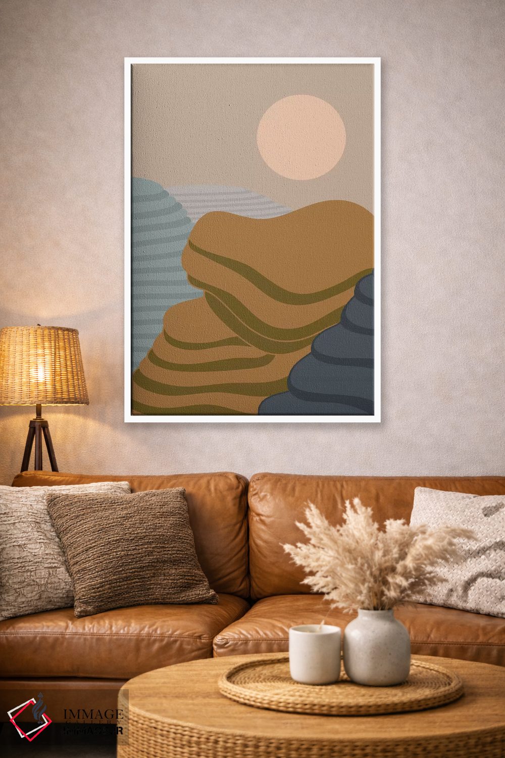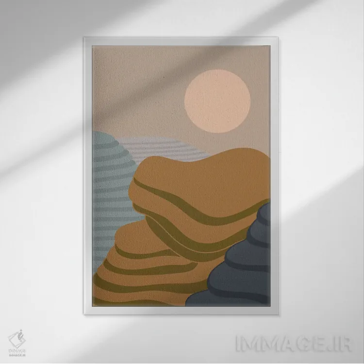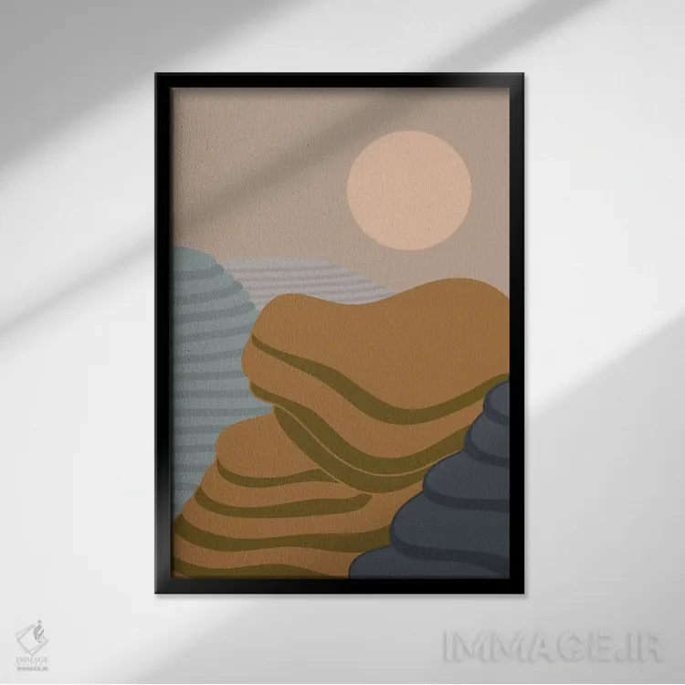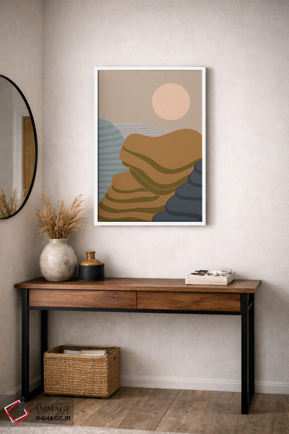 براساس پالت گرم اثر، قاب بلوط روشن (چوبی) پیشنهاد اول است و استخوانی ملایم مکمل. برای سفارشهای پروژهای با ابعاد و قابهای اختصاصی با ایماژ در تماس باشید.