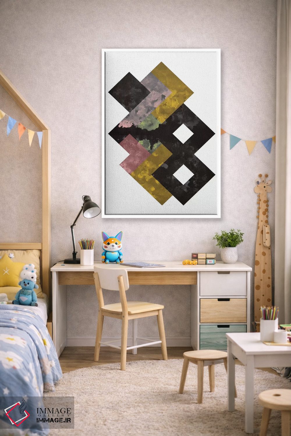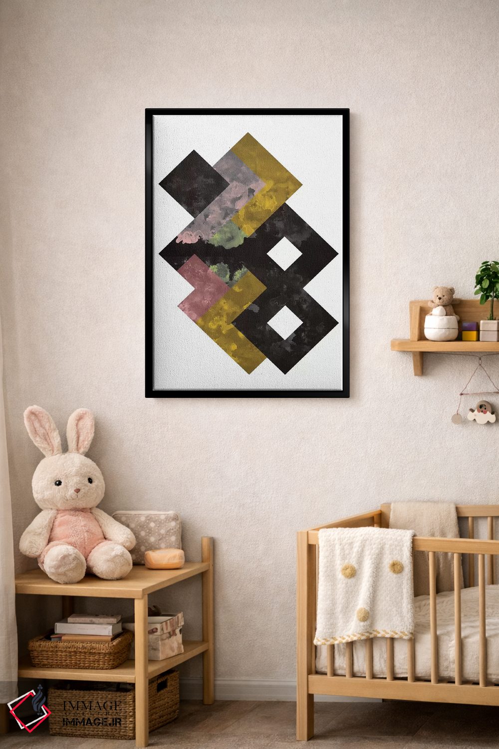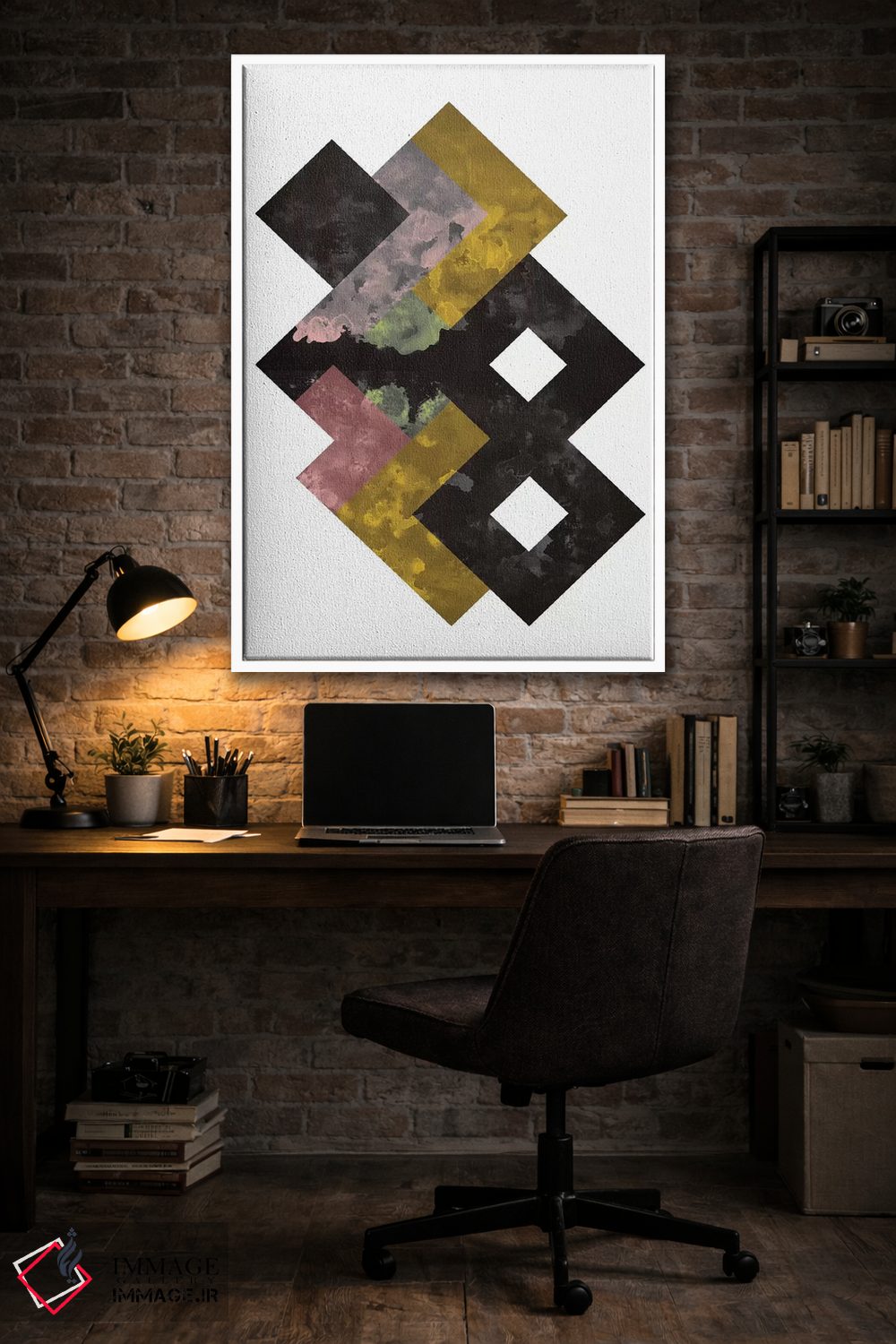 «"آبرنگ هندسی"» اثرِ «فلتاول (نام یا استودیوی هنری)» یک انتخاب مدرن است؛ سبک هنری کمک میکند چیدمان مرتب بماند و دیوار حرفهای دیده شود.