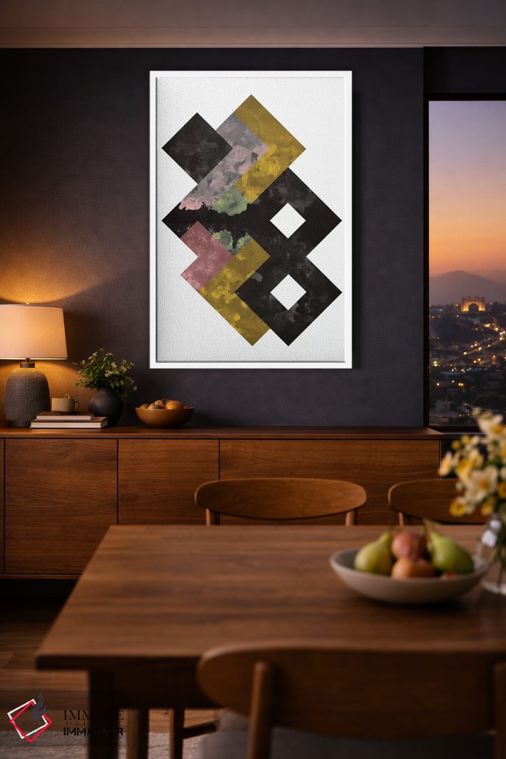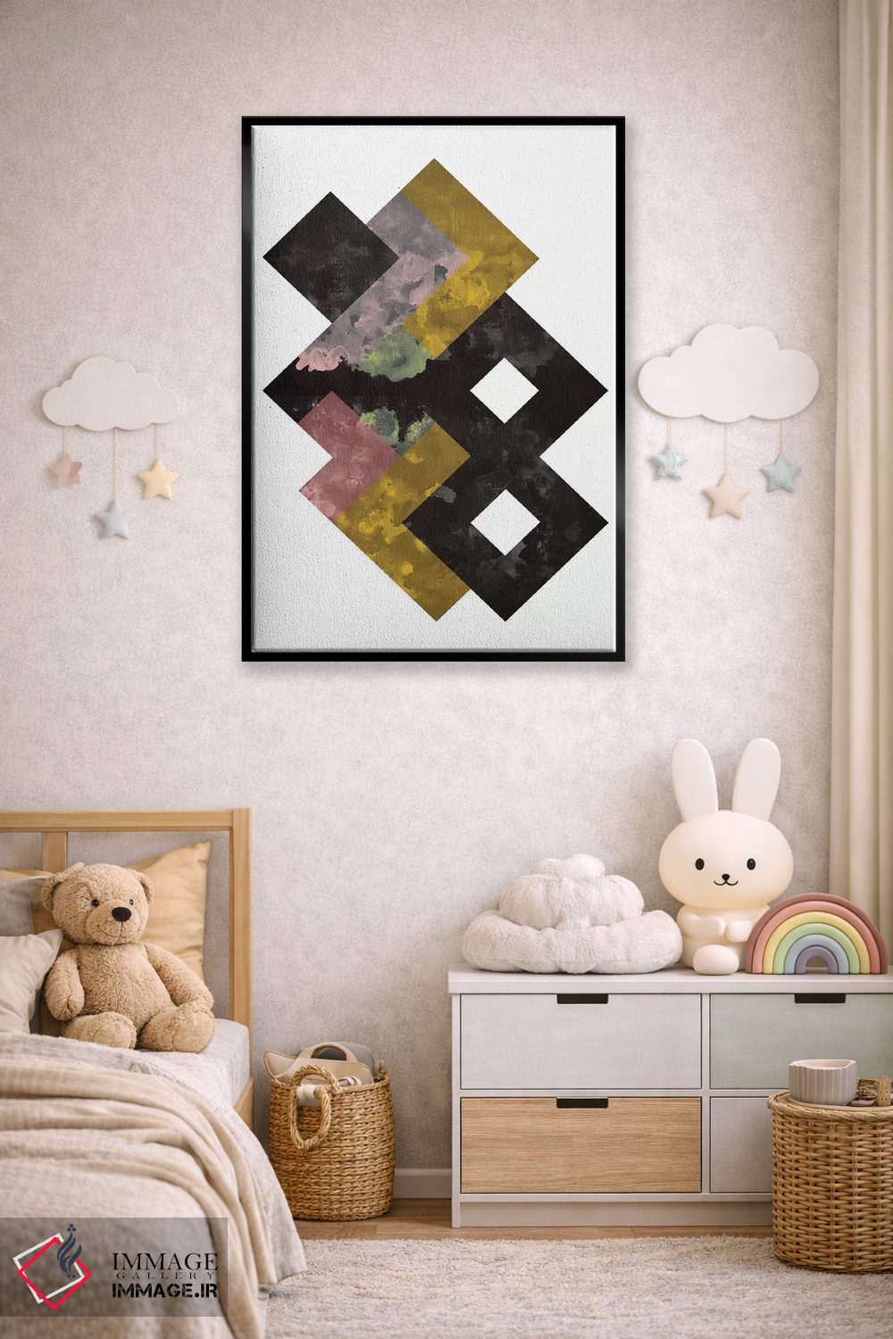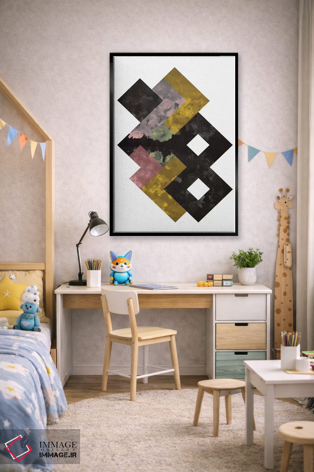 «"آبرنگ هندسی"» اثرِ «فلتاول (نام یا استودیوی هنری)» یک انتخاب مدرن است؛ سبک هنری کمک میکند چیدمان مرتب بماند و دیوار حرفهای دیده شود.