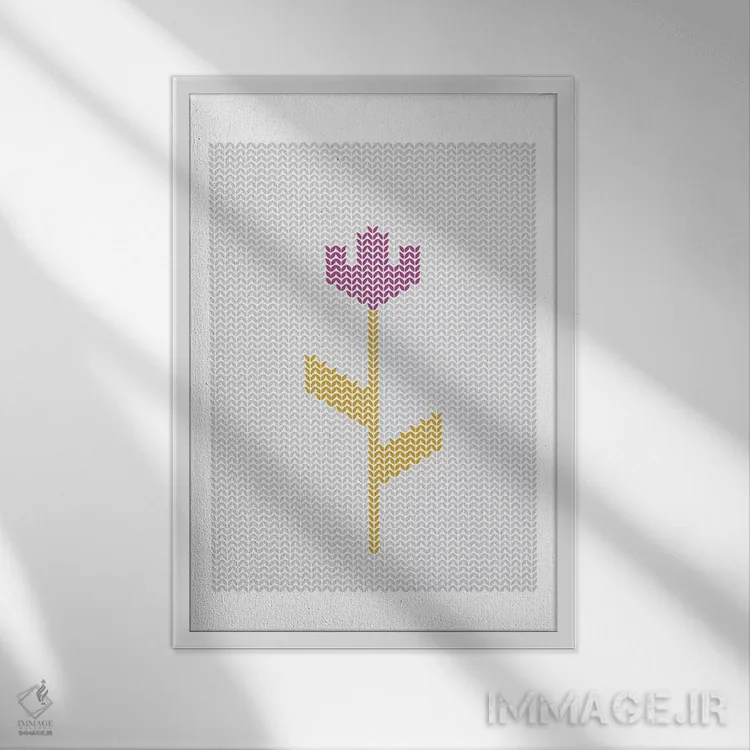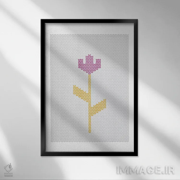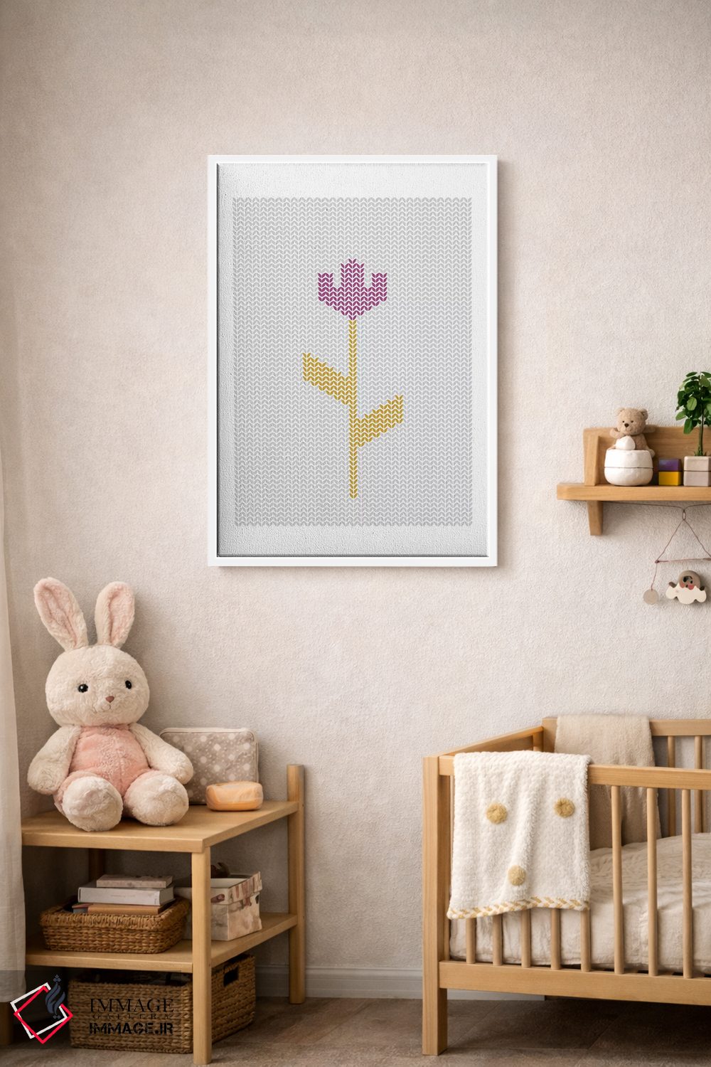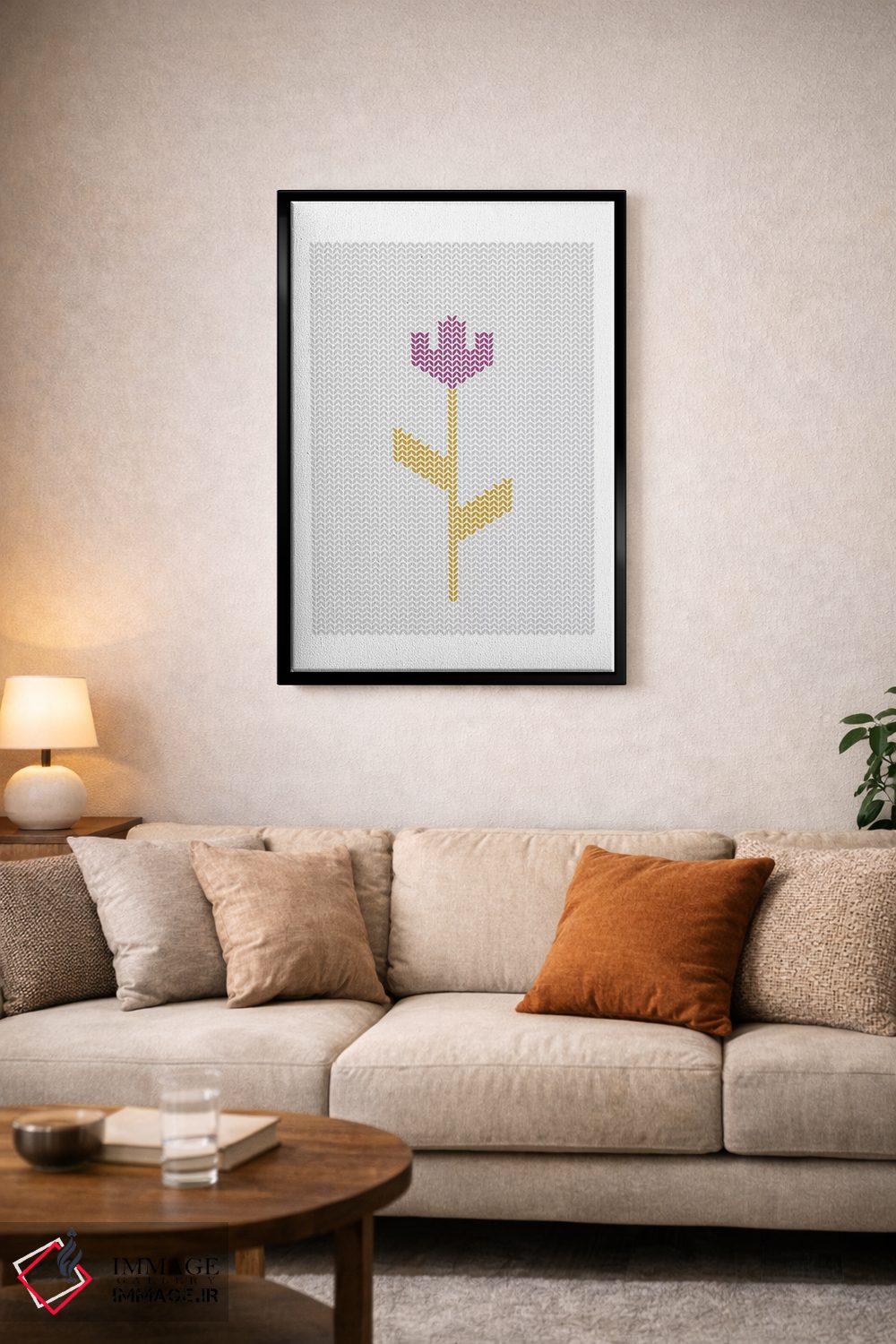 اگر دوست دارید دیوار روشنتر و آرامتر دیده شود، «"گل دوخته شده"» اثرِ «فلتاول (نام یا استودیوی هنری)» تعادل رنگیِ لطیفی به چیدمان میدهد، برای اتاق خواب گزینهٔ مناسبیست. با قاب روشن یا چوبی، حس طبیعیتری پیدا میکند.