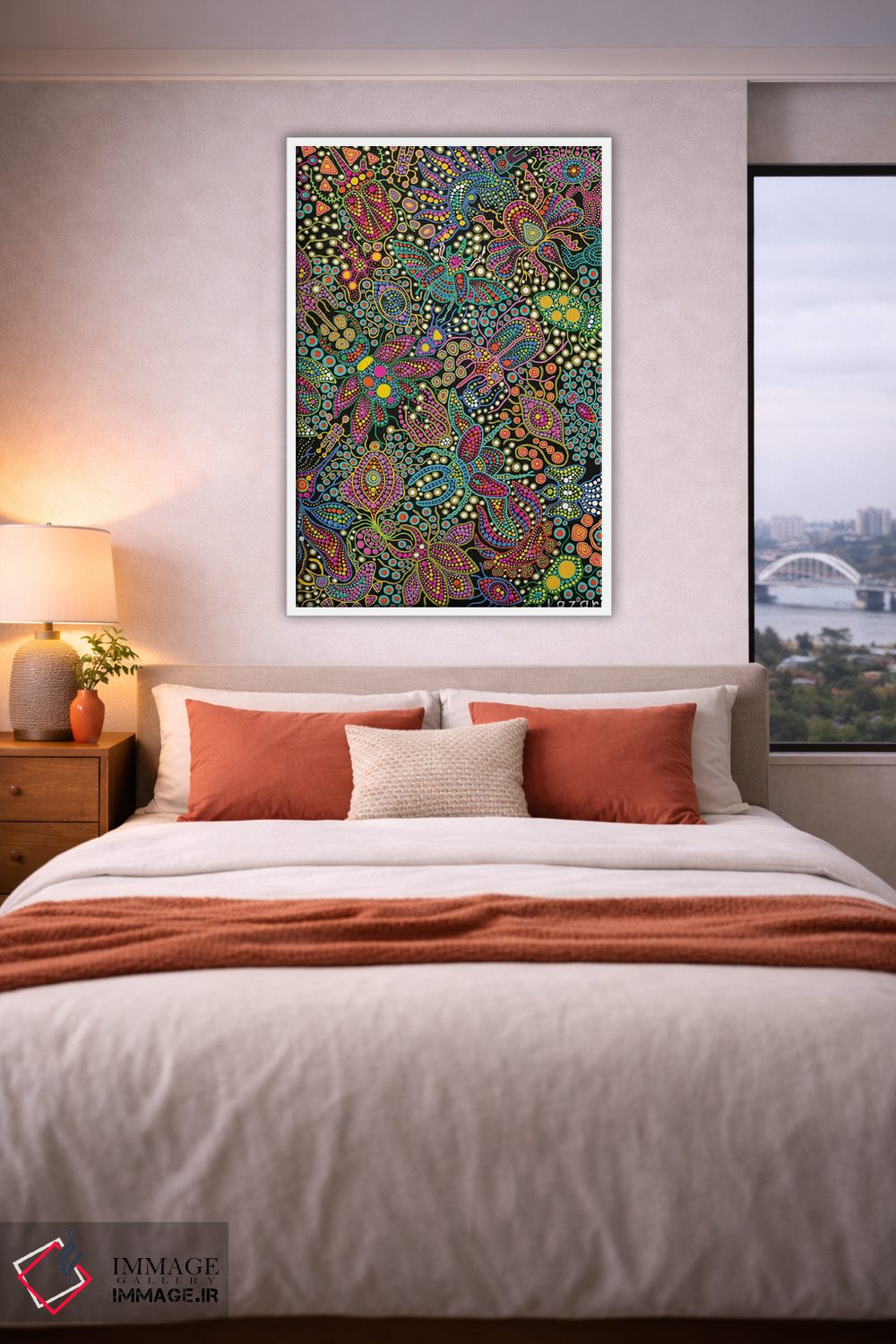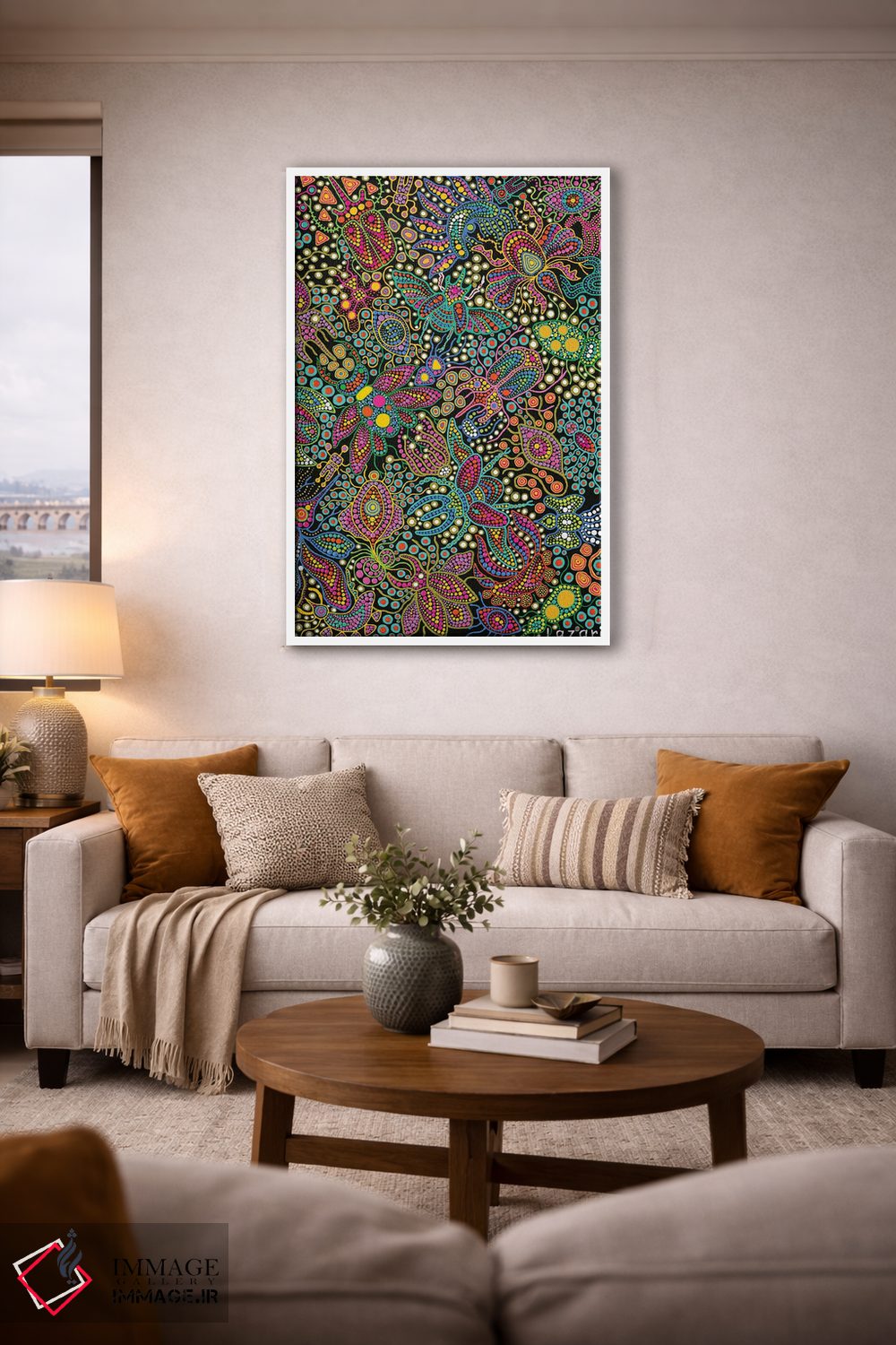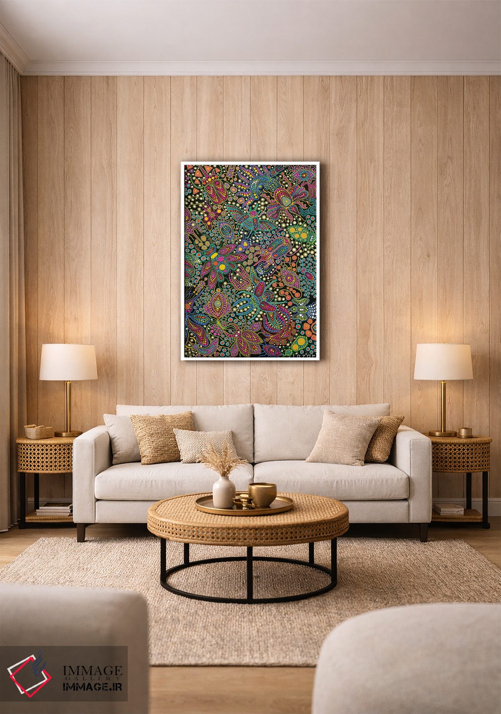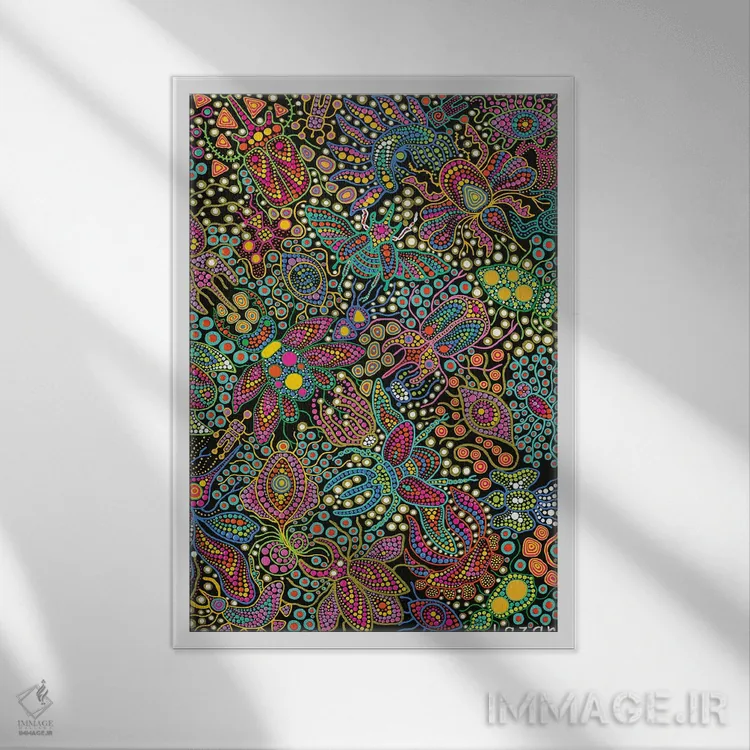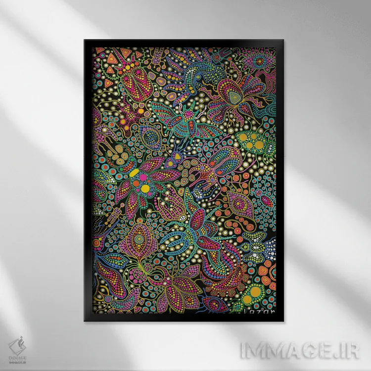 براساس پالت ترکیبی اثر، قاب تیک گرم (چوبی) پیشنهاد اول است و مشکی مات (فریم متوسط) مکمل. برای سفارشهای پروژهای با ابعاد و قابهای اختصاصی با ایماژ در تماس باشید.