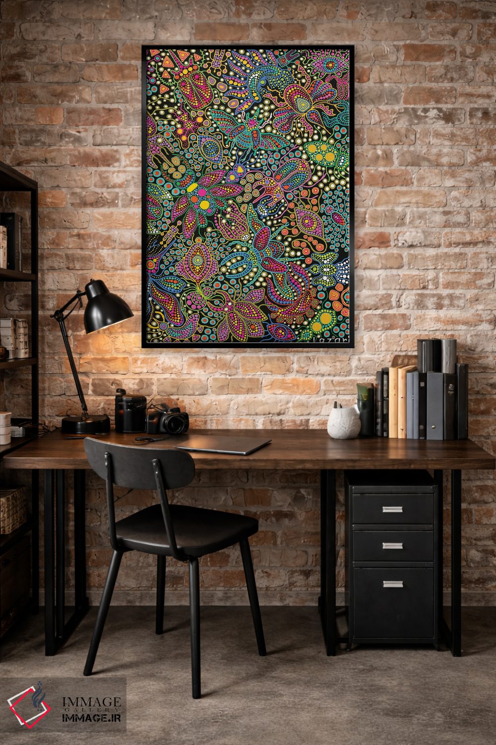 این اثر با عنوان «"حشرات"» اثرِ «اکسانا لازاری» به فضا، گرمیِ ملایم اضافه میکند؛ برای اتاق بازی یا گوشهٔ مطالعه انتخابی خوشسلیقه است. با قاب چوبی یا مشکی، حس مرتبتری پیدا میکند.