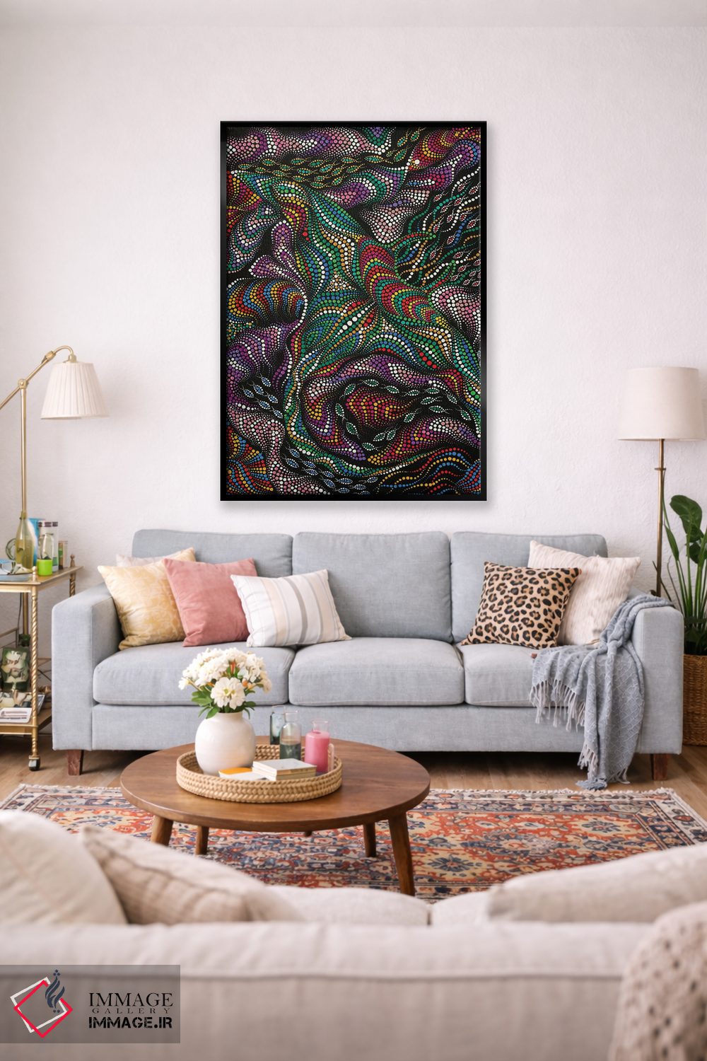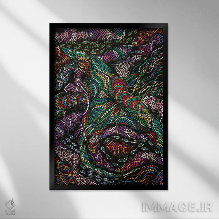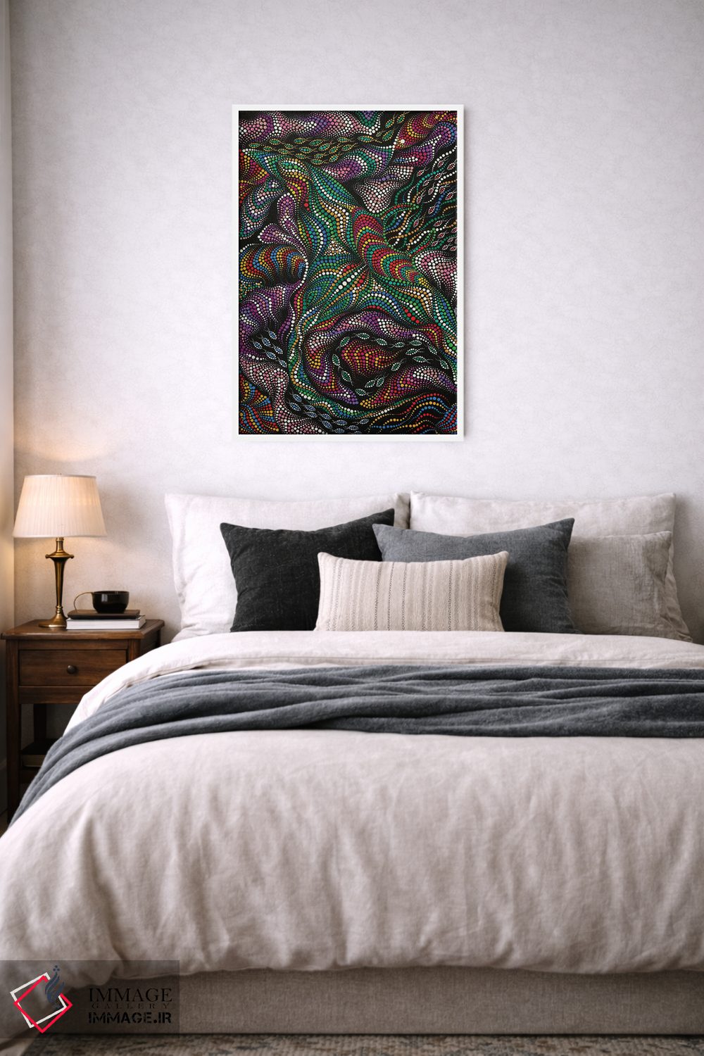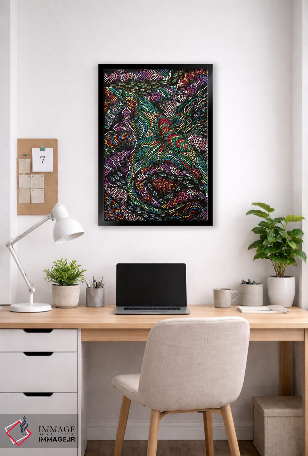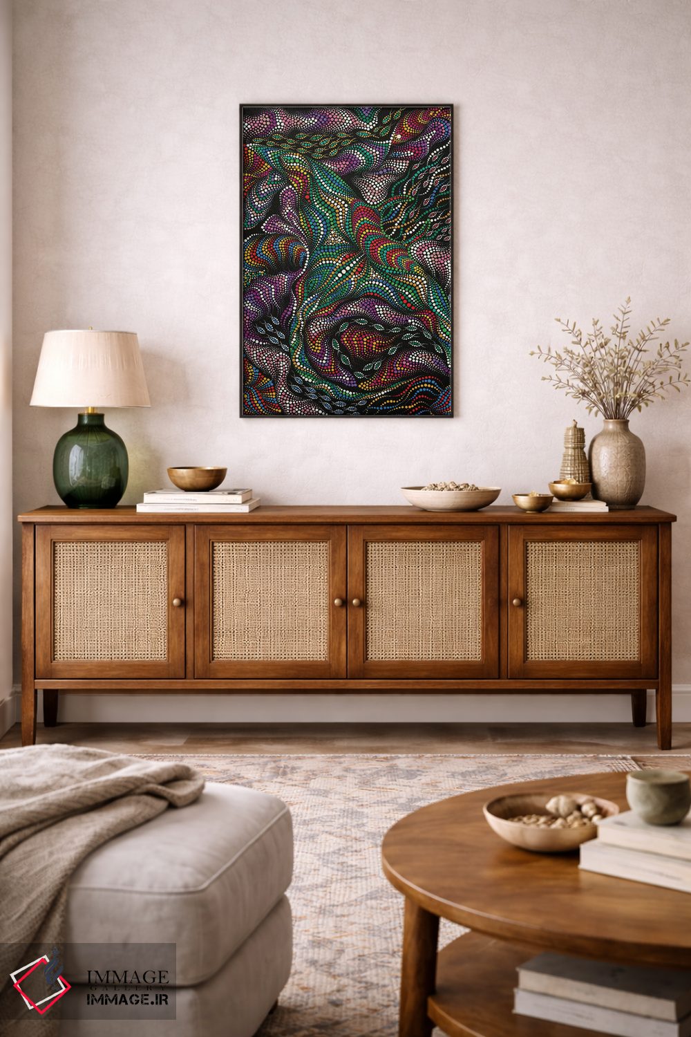 براساس پالت ترکیبی اثر، قاب تیک گرم (چوبی) پیشنهاد اول است و مشکی مات (فریم متوسط) مکمل. برای سفارشهای پروژهای با ابعاد و قابهای اختصاصی با ایماژ در تماس باشید.