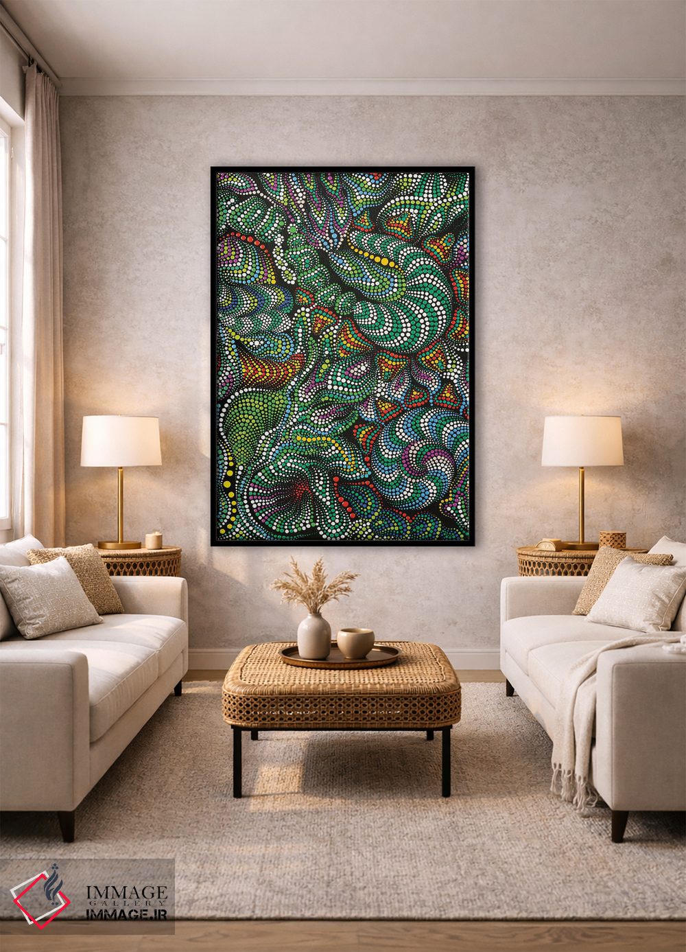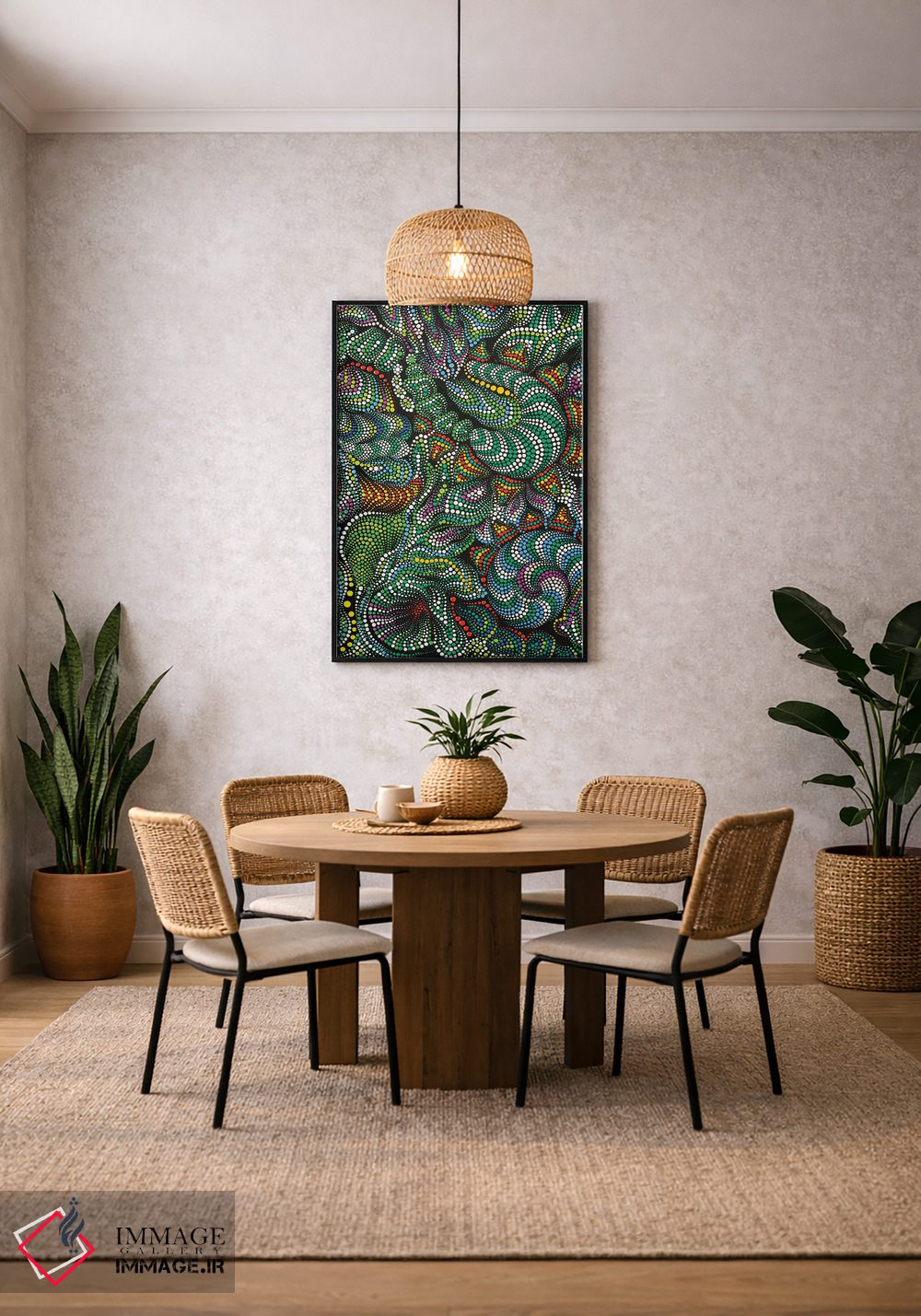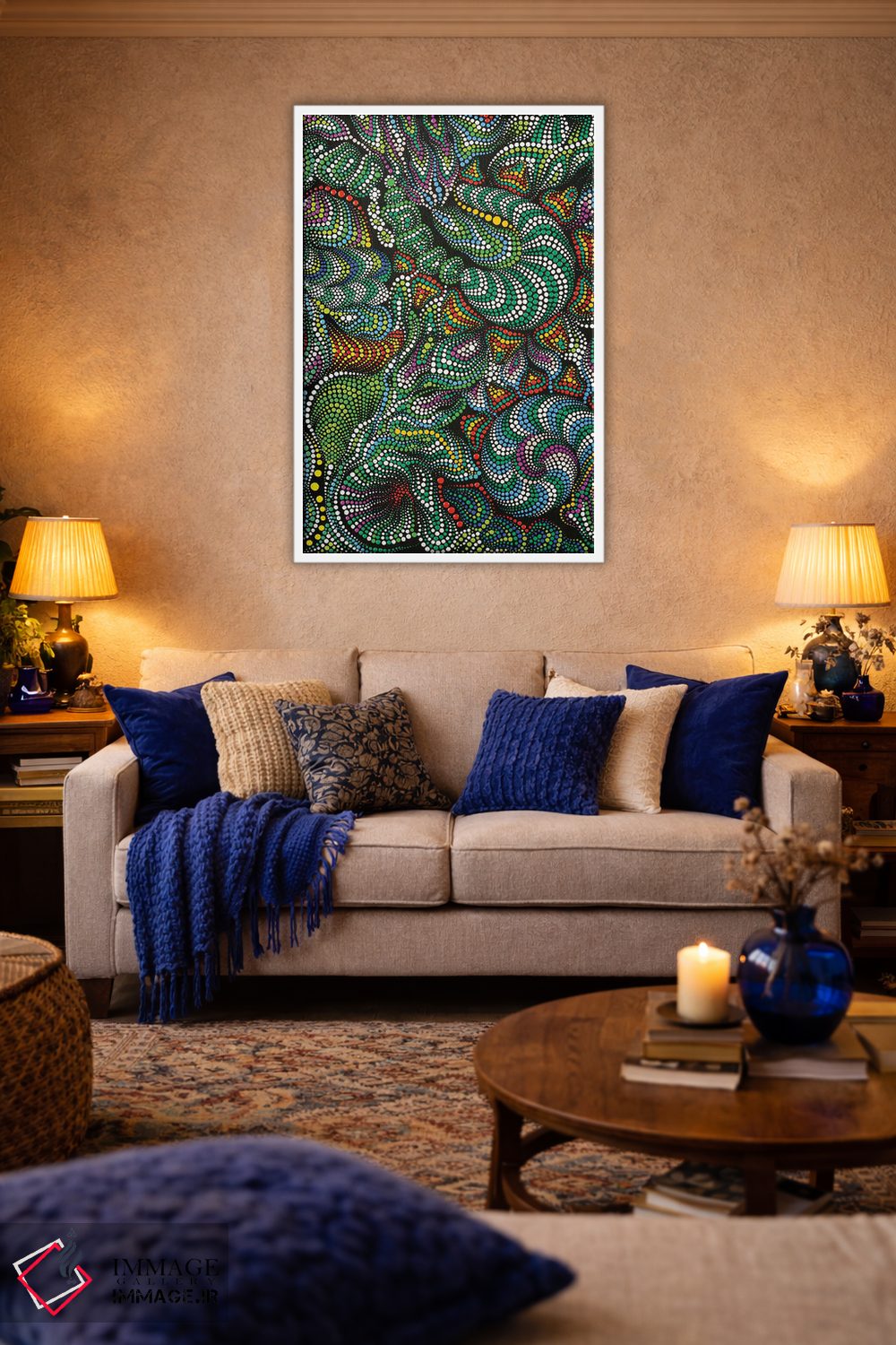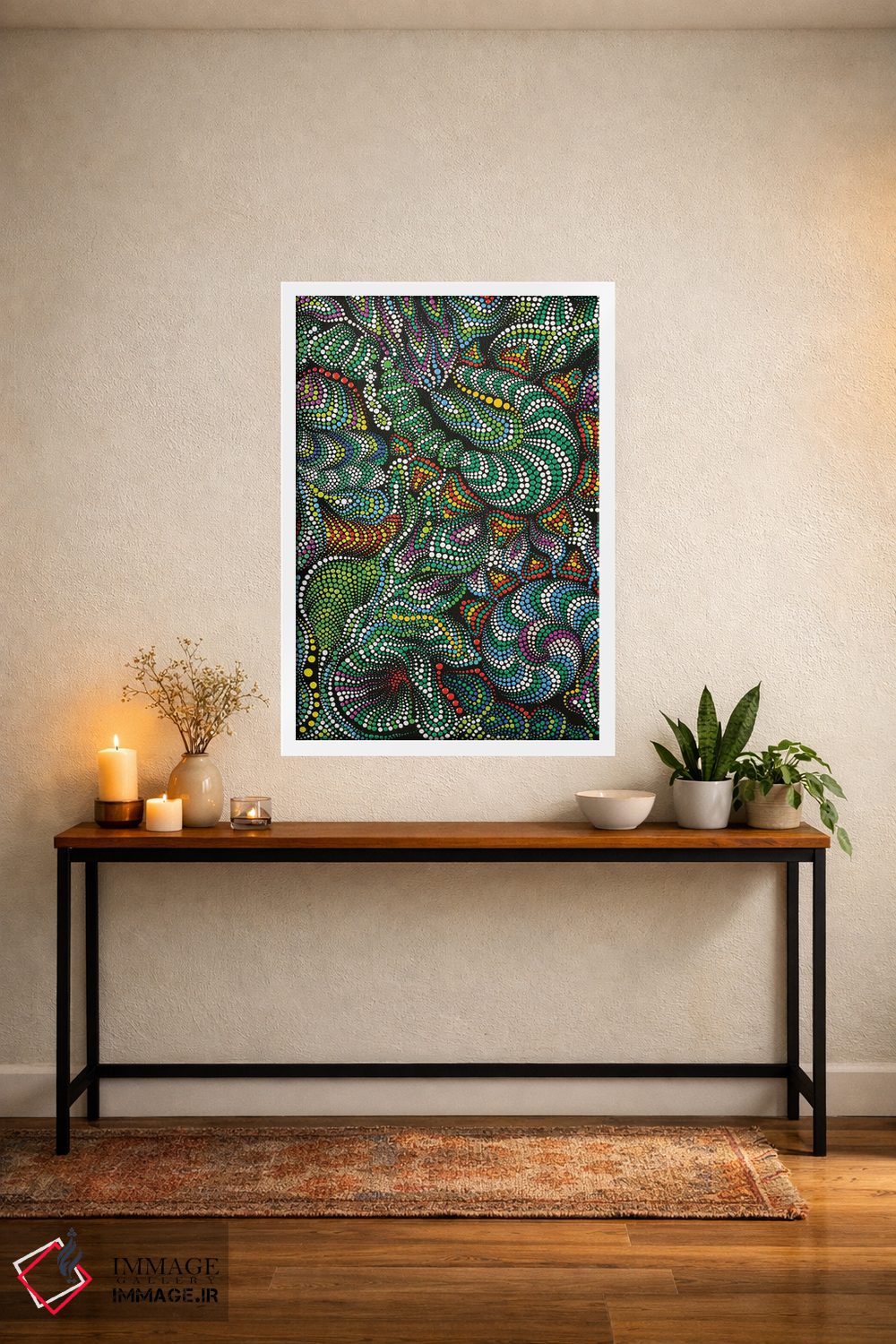 برای گالریوال و چیدمان چندقابی، پیشنهاد دقیقتری میگیرید تا هماهنگی محیط کاملتر شود. برای اینکه اثر در فضا «آرام و خنثی» دیده شود، نور موضعی ملایم نتیجه را بهتر نشان میدهد و نتیجه را مرتبتر و تمیزتر میکند.