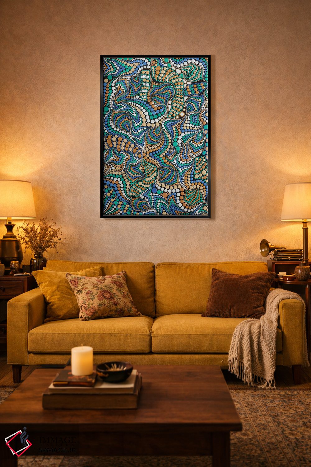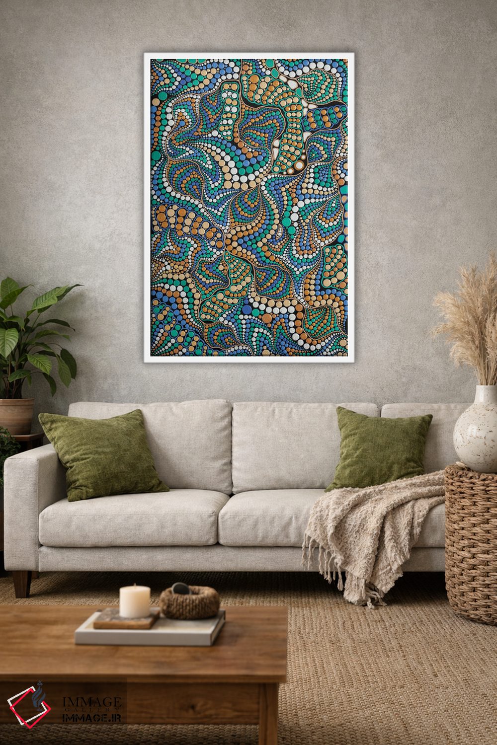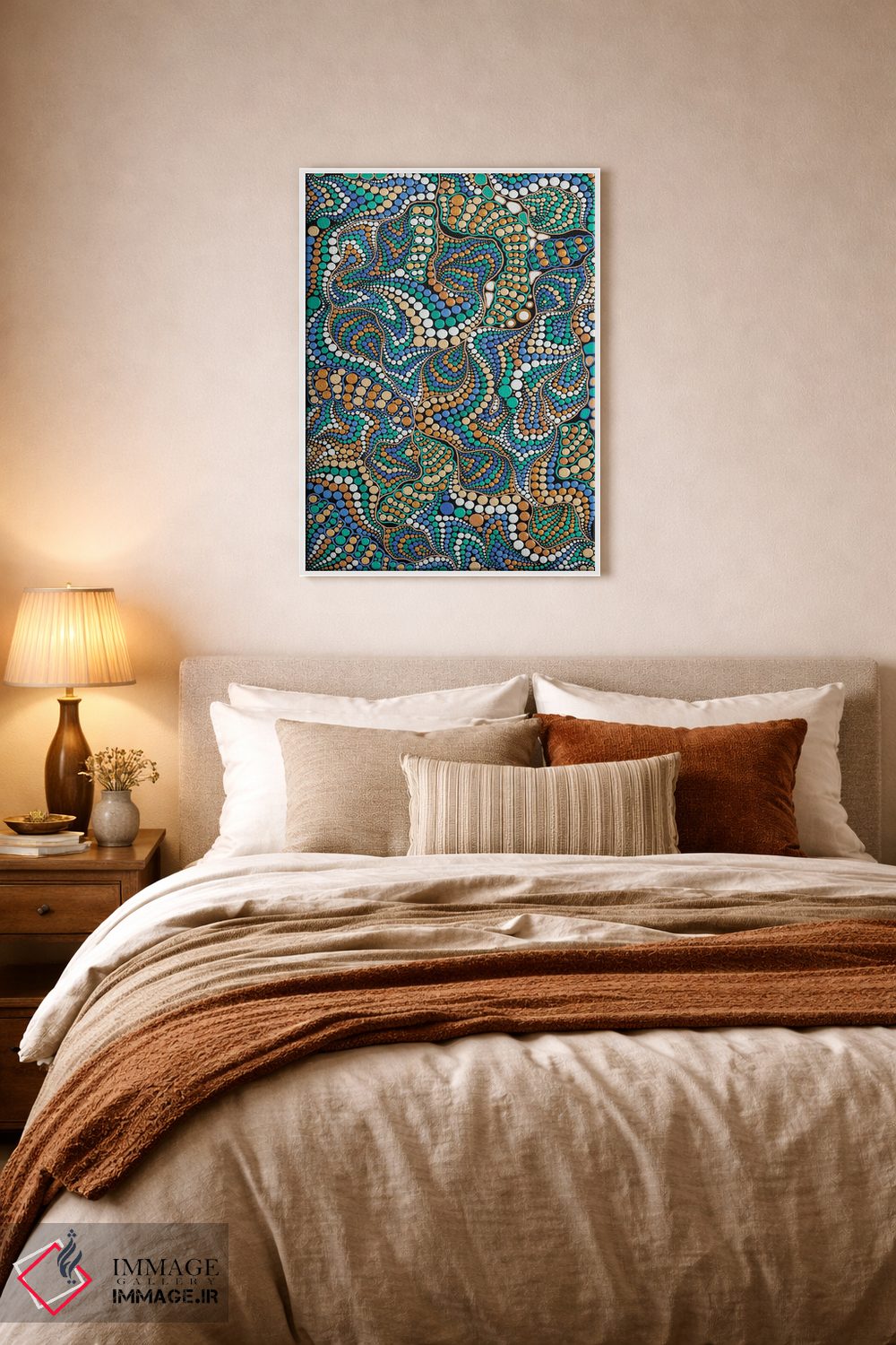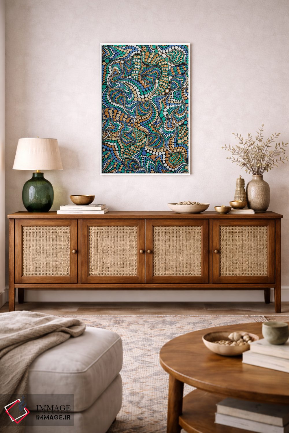 براساس پالت ترکیبی اثر، قاب تیک گرم (چوبی) پیشنهاد اول است و مشکی مات (فریم متوسط) مکمل. برای سفارشهای پروژهای با ابعاد و قابهای اختصاصی با ایماژ در تماس باشید.