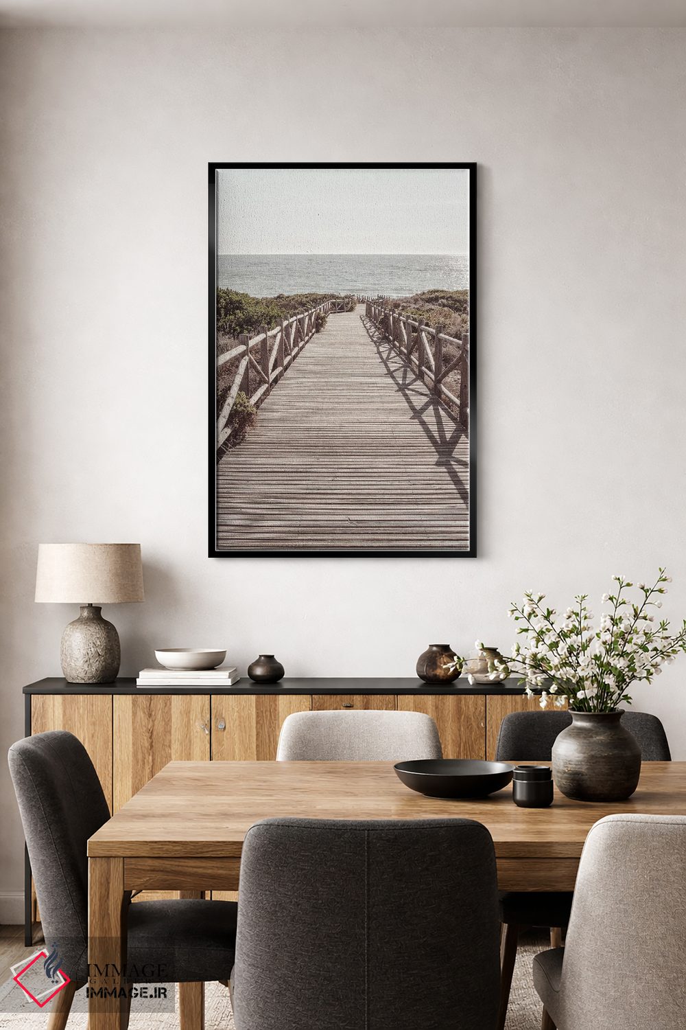 براساس پالت گرم اثر، قاب بلوط روشن (چوبی) پیشنهاد اول است و استخوانی ملایم مکمل. برای سفارشهای پروژهای با ابعاد و قابهای اختصاصی با ایماژ در تماس باشید.