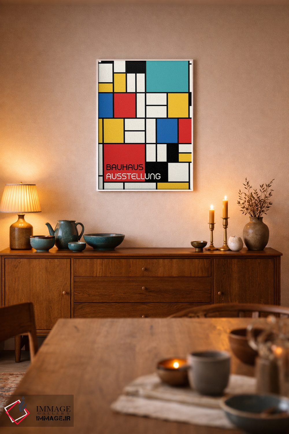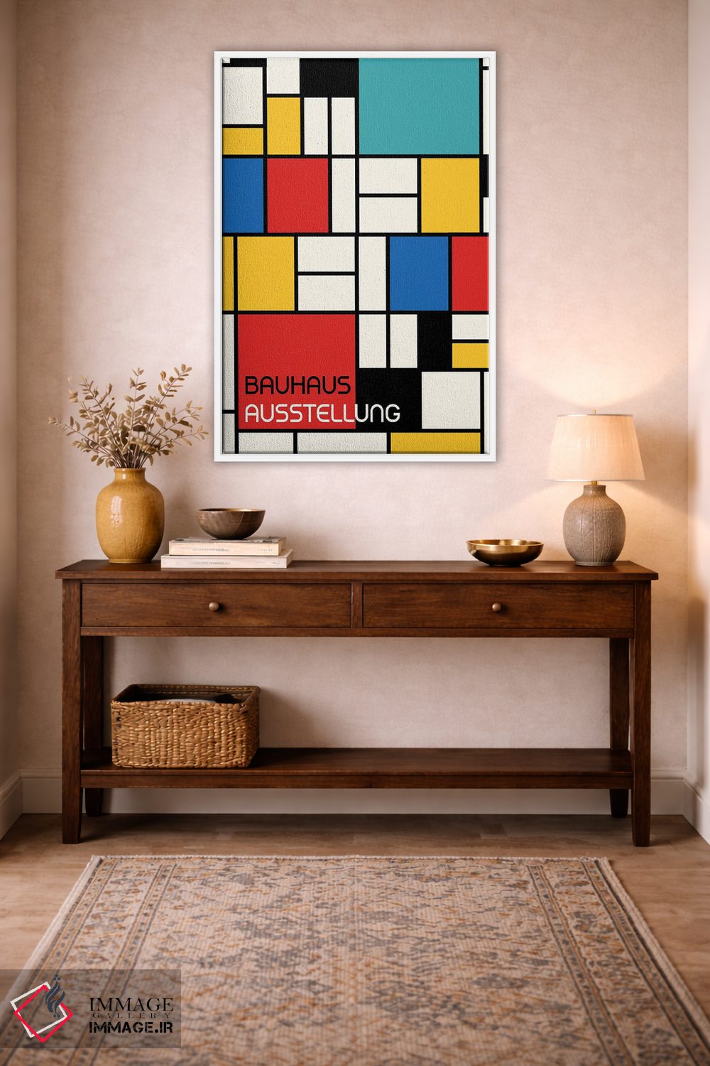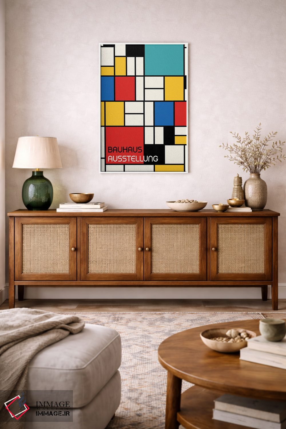 در «طرح هندسی باوهاوس رترو IV» اثرِ «رتردروم»، رنگ و فرم نقش اصلی را دارند؛ انتخابی خوب برای فضاهای امروزی و دیوارهای مینیمال.