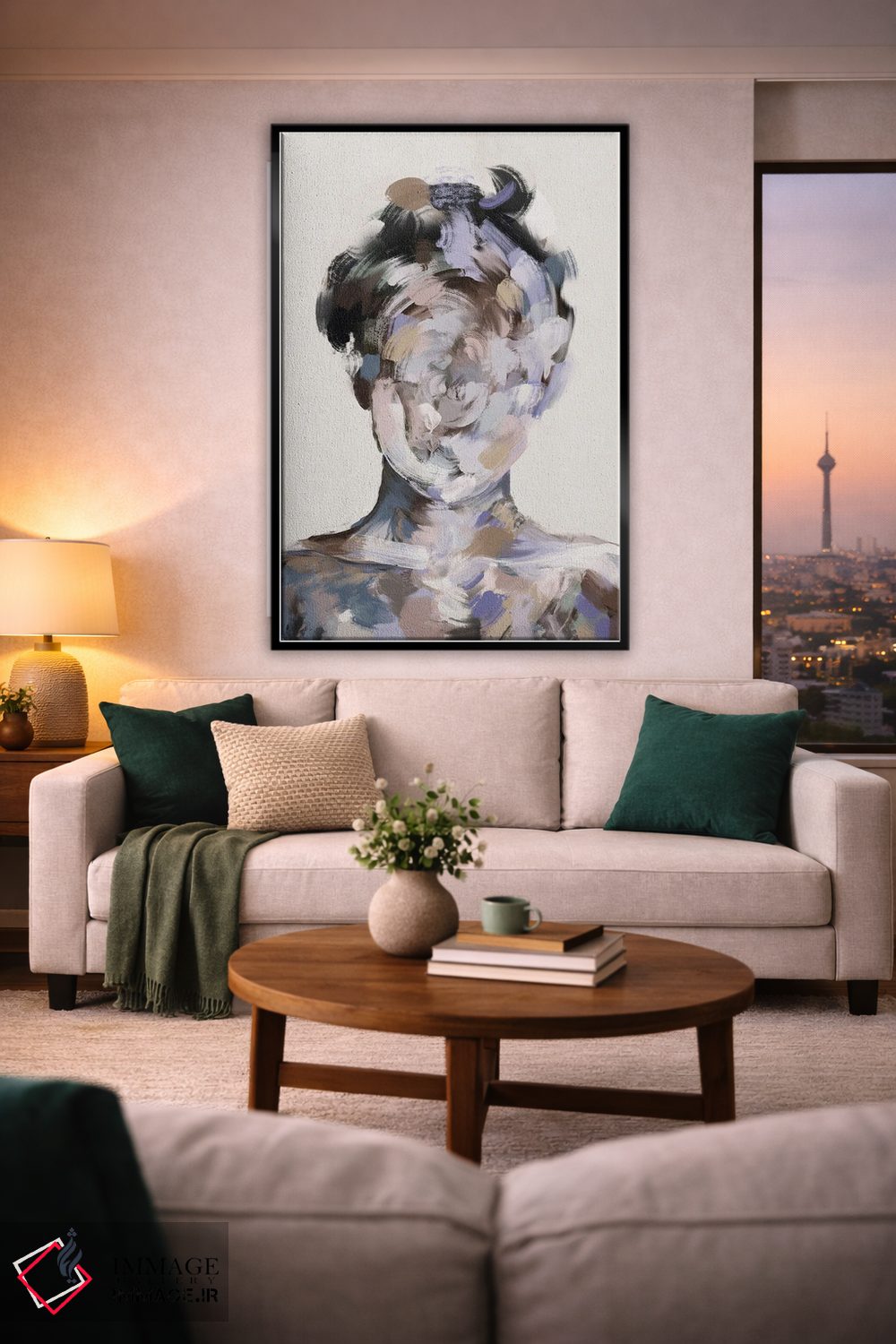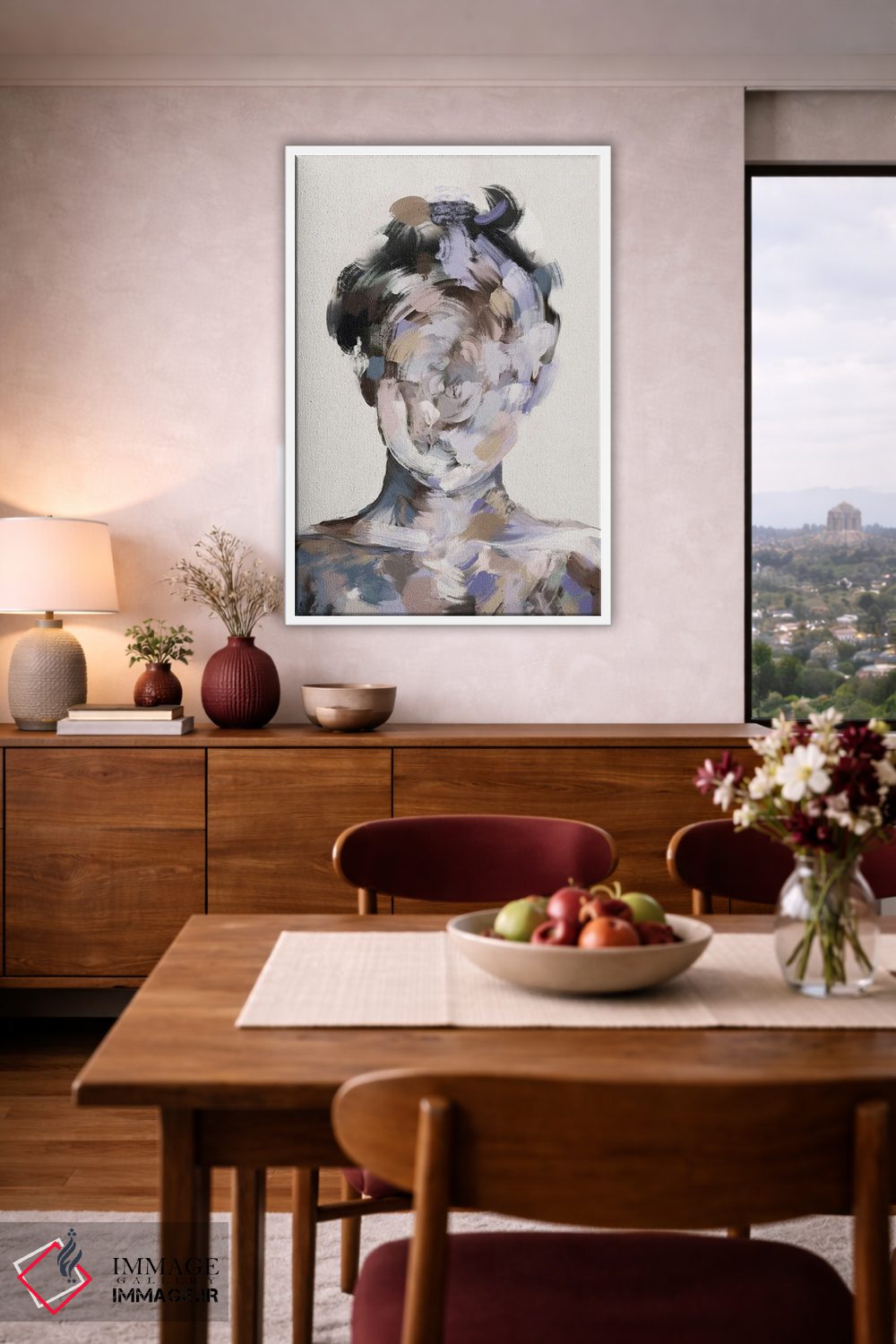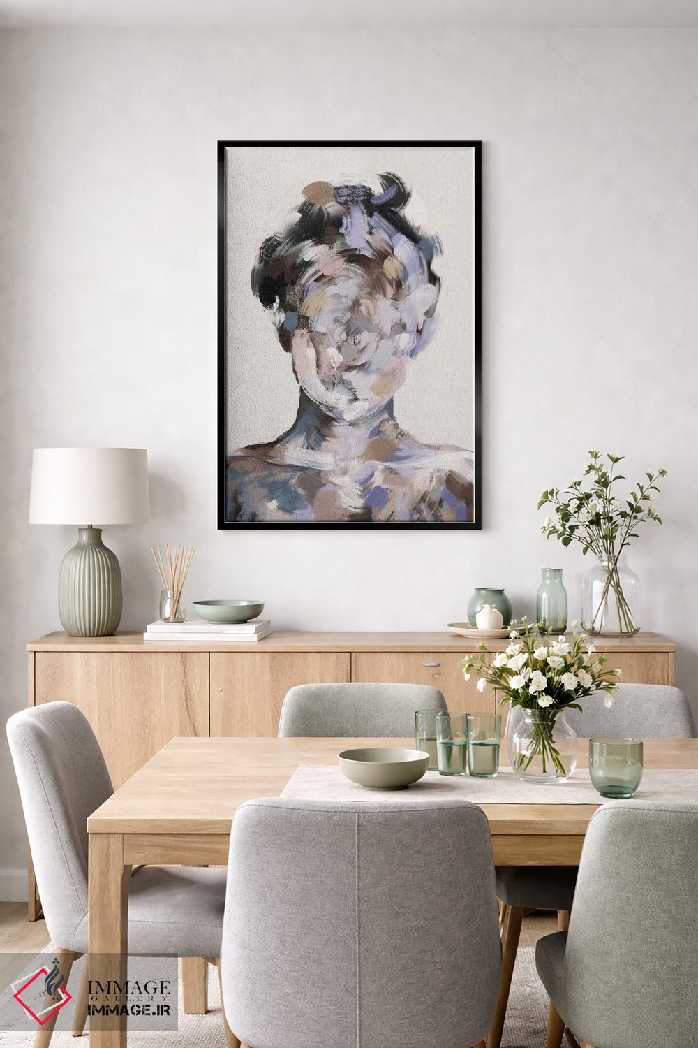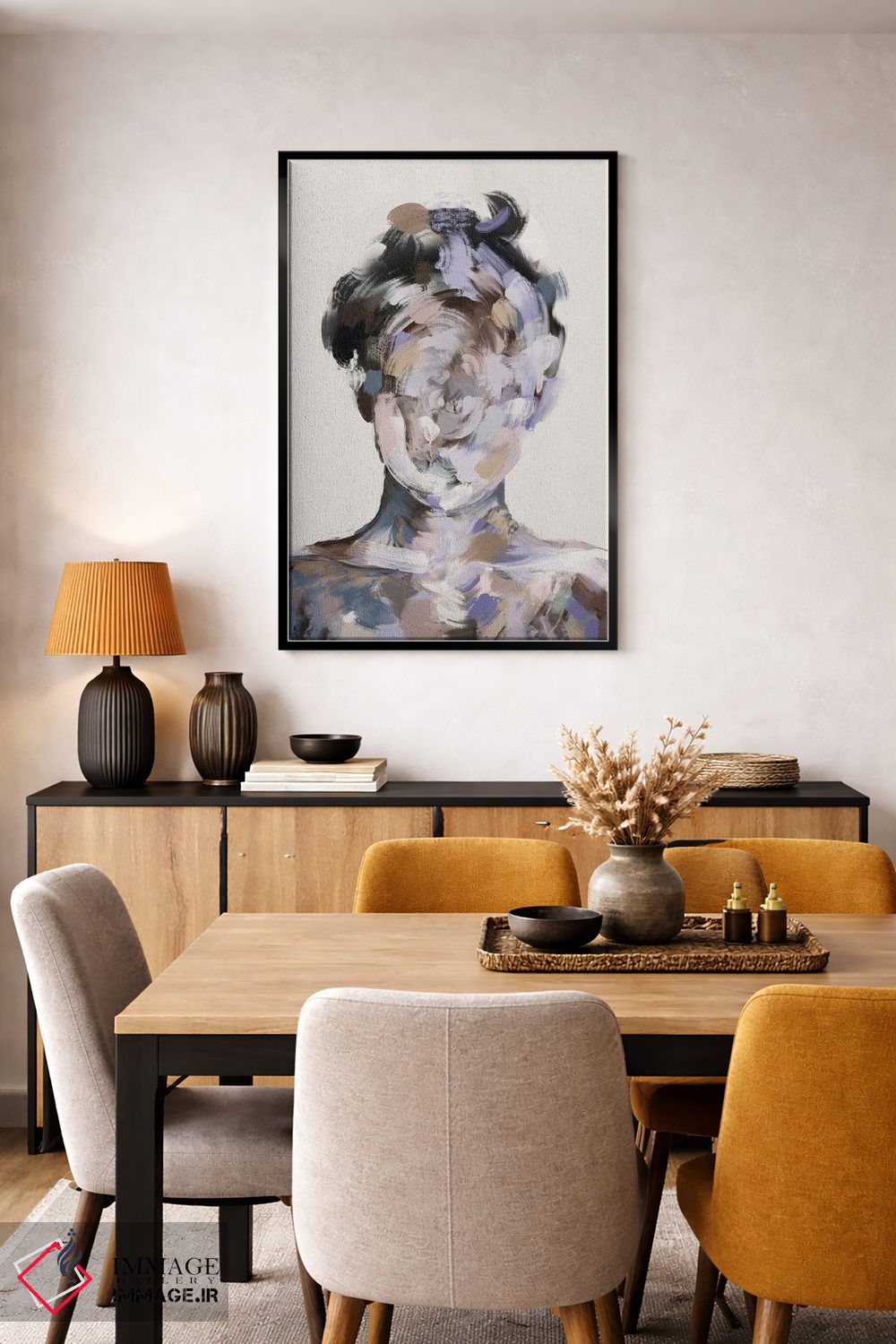 برای یک چیدمان تمیز، صورتی را در رومیزی یا شمعها برگردانید تا نگاه به سمت اثر هدایت شود. اغراق لازم نیست.