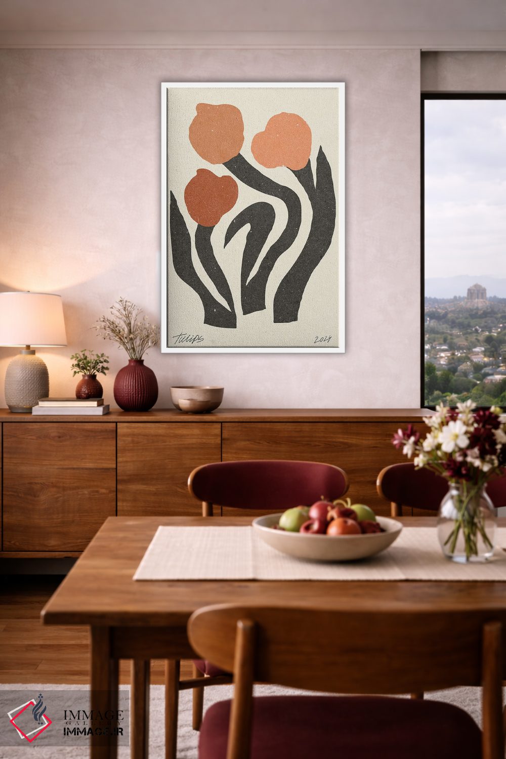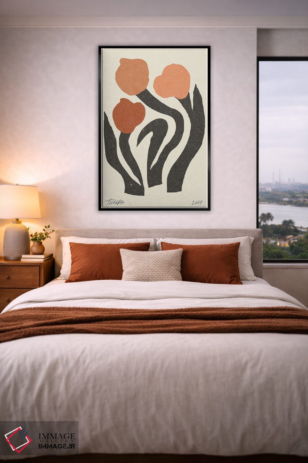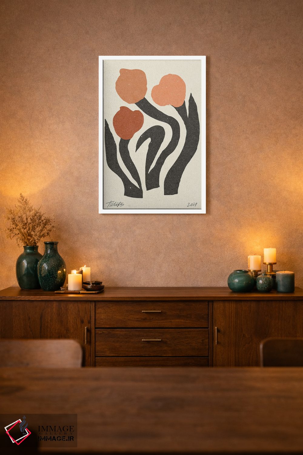 براساس پالت گرم اثر، قاب تیک گرم (چوبی) پیشنهاد اول است و مشکی مات (فریم متوسط) مکمل. برای سفارشهای پروژهای با ابعاد و قابهای اختصاصی با ایماژ در تماس باشید.