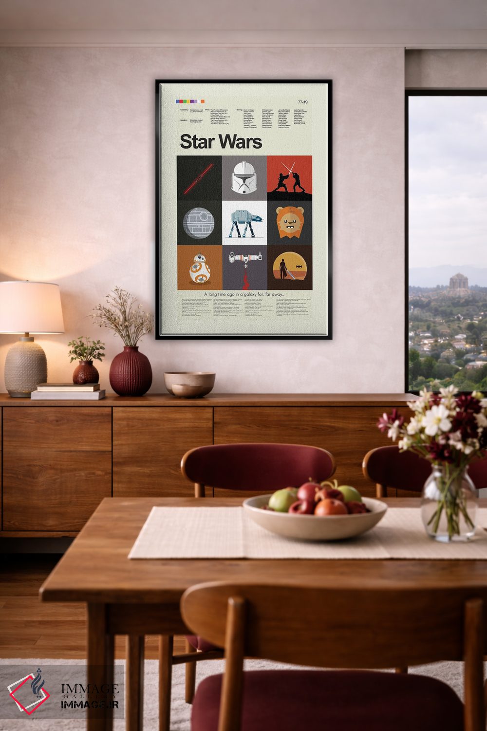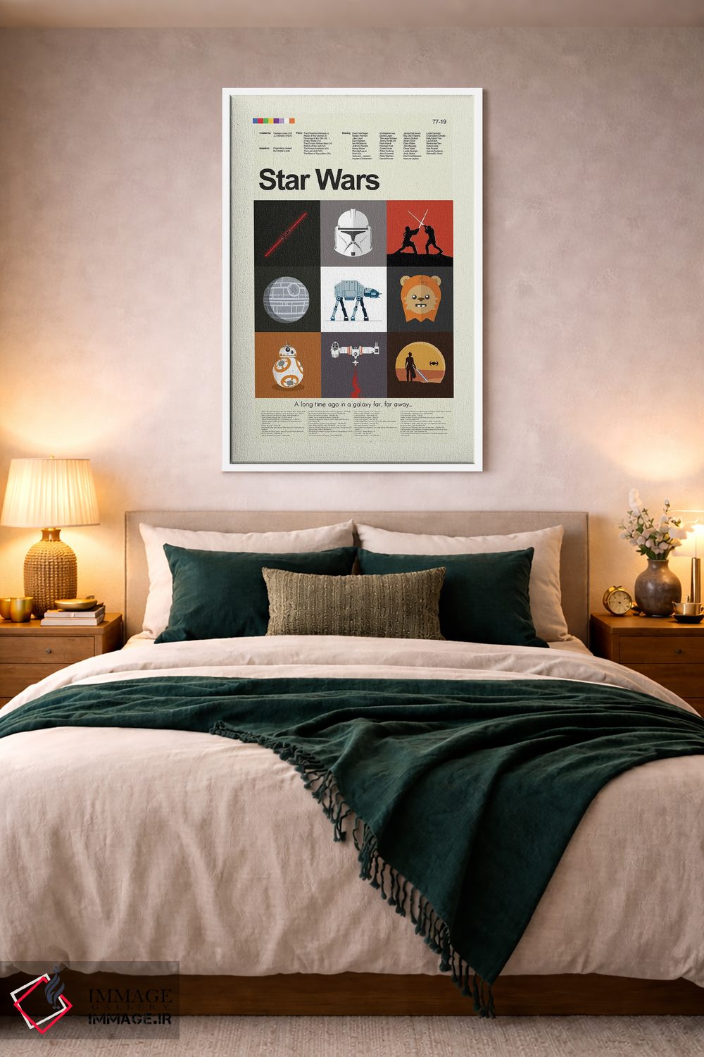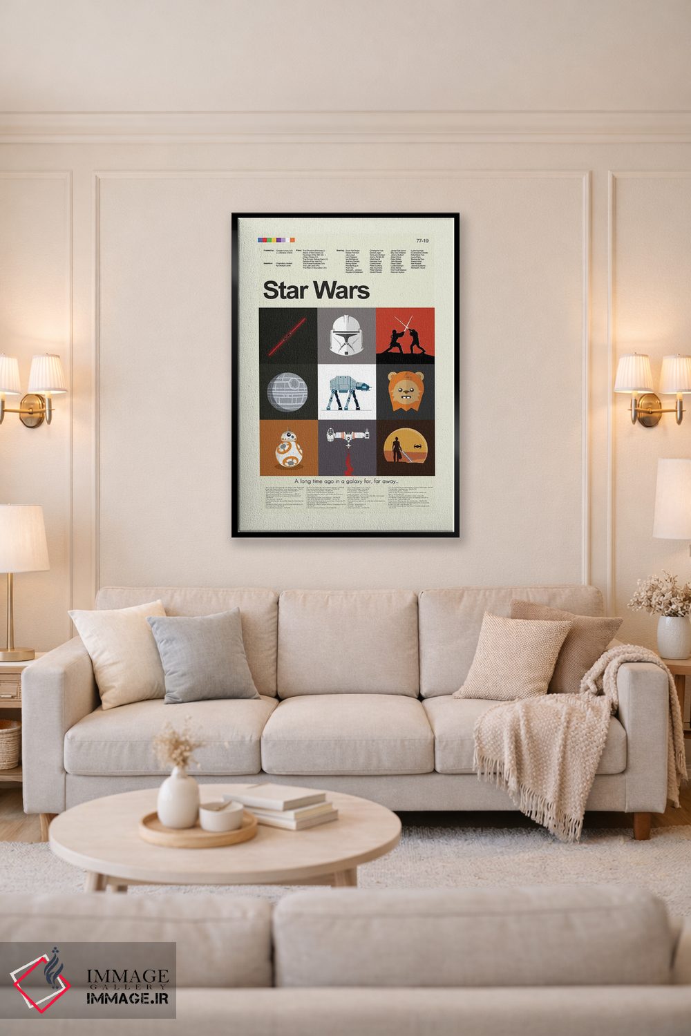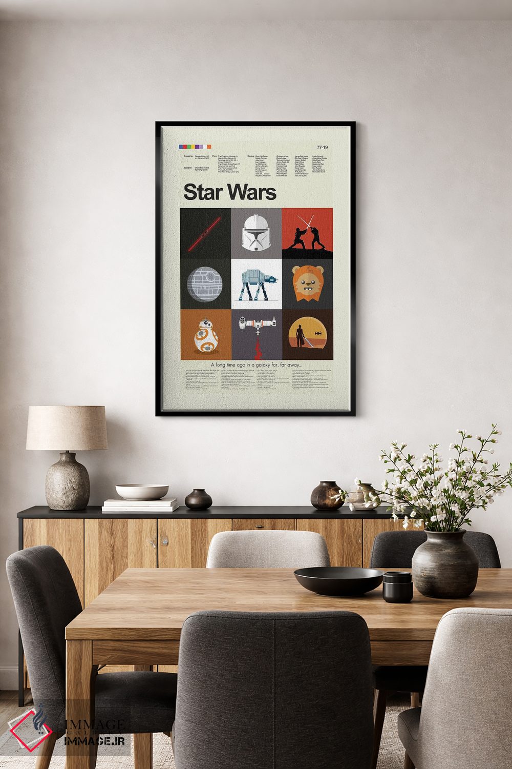 وقتی چیدمان را با دقت میچینید، «جنگ ستارگان قسمتهای ۱ تا ۹» اثرِ «پرینتس اند گیگلز اثر اَرین هیگرمن» تضادهای رنگی را خوشقوارهتر میکند؛ برای دکورهایی که بافت و جزئیات در آن مهم است پیشنهاد میشود. اگر میخواهید یک اثر همیشه «بهروز» بماند، انتخاب خوبیست.