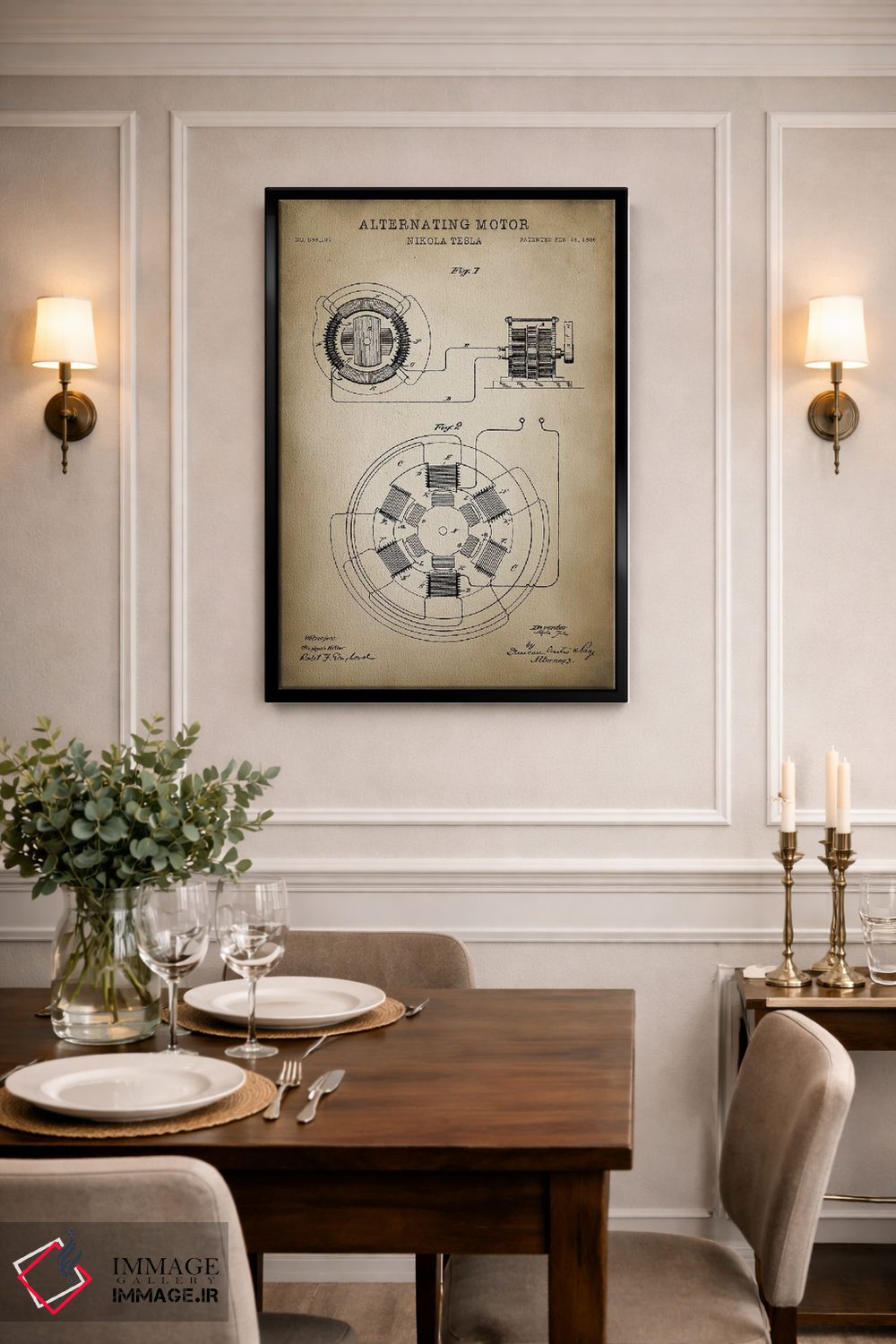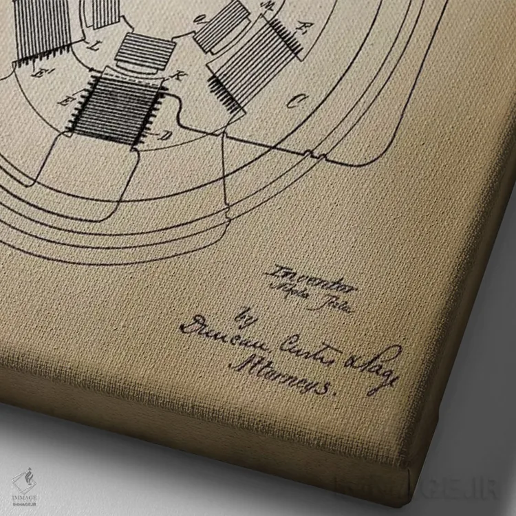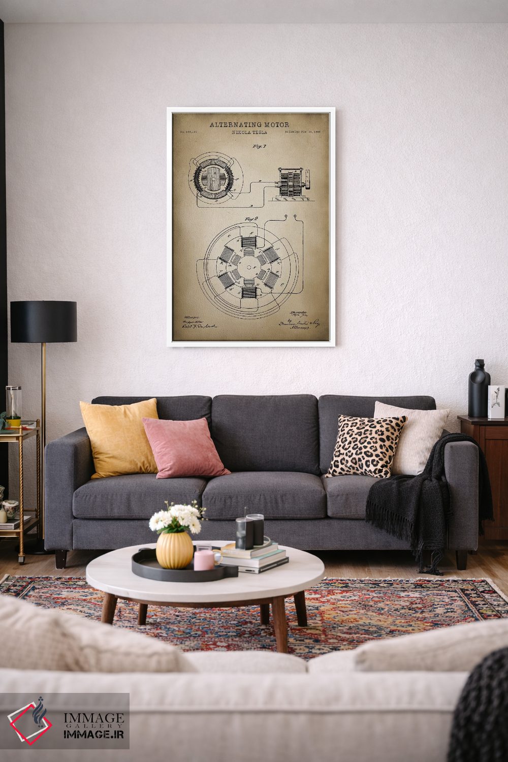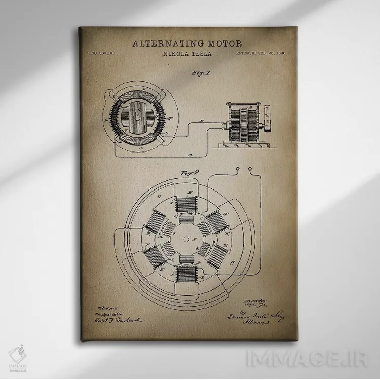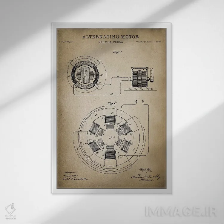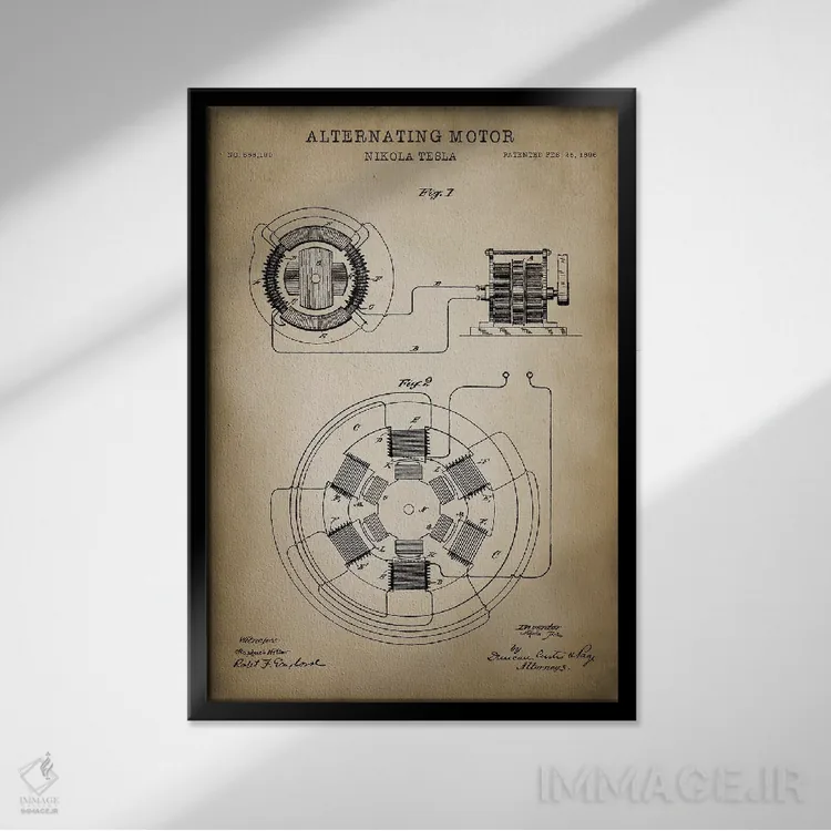«موتور متناوب تسلا» اثرِ «پتنت پرینت استور (فروشگاه چاپ هنری)» با حالوهوای تزئینیِ این اثر، فضا را روشن و مرتب میکند؛ مناسب نشیمنهای روشن و چیدمانهای مدرن.