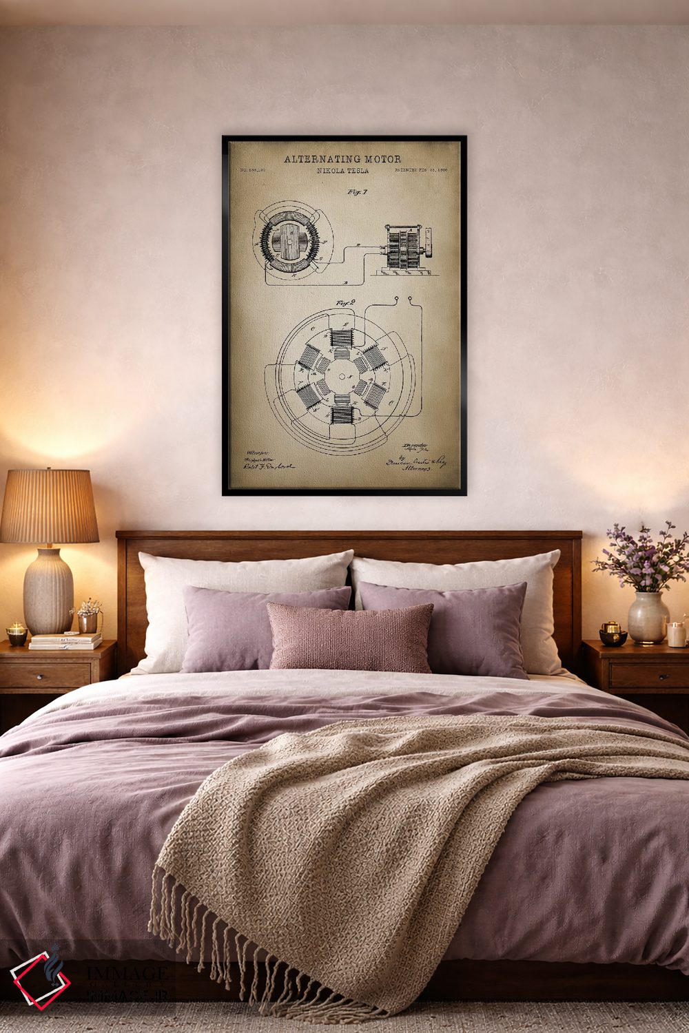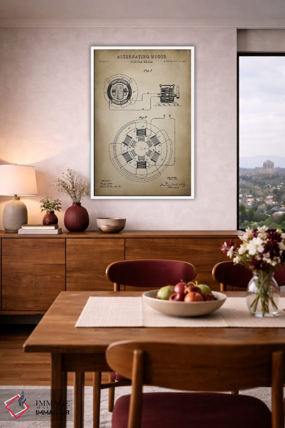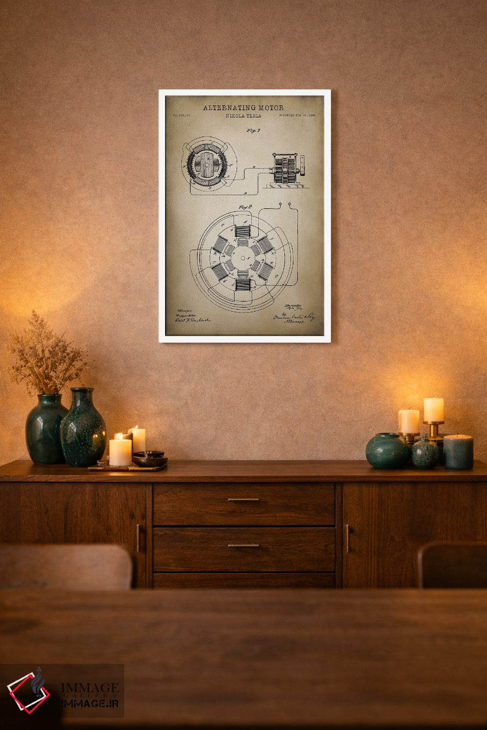 «موتور متناوب تسلا» اثرِ «پتنت پرینت استور (فروشگاه چاپ هنری)» با حالوهوای تزئینیِ این اثر، فضا را روشن و مرتب میکند؛ مناسب نشیمنهای روشن و چیدمانهای مدرن.