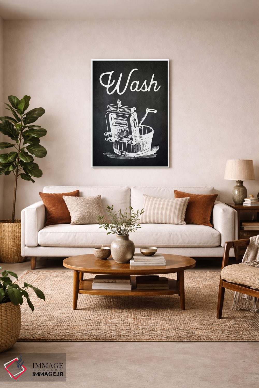 «شستشو» اثرِ «پتنت پرینت استور (فروشگاه چاپ هنری)» با حالوهوای دکور روستایی و موضوعِ این اثر، کنار چوب و بافتهای طبیعی بسیار خوشنشین است.