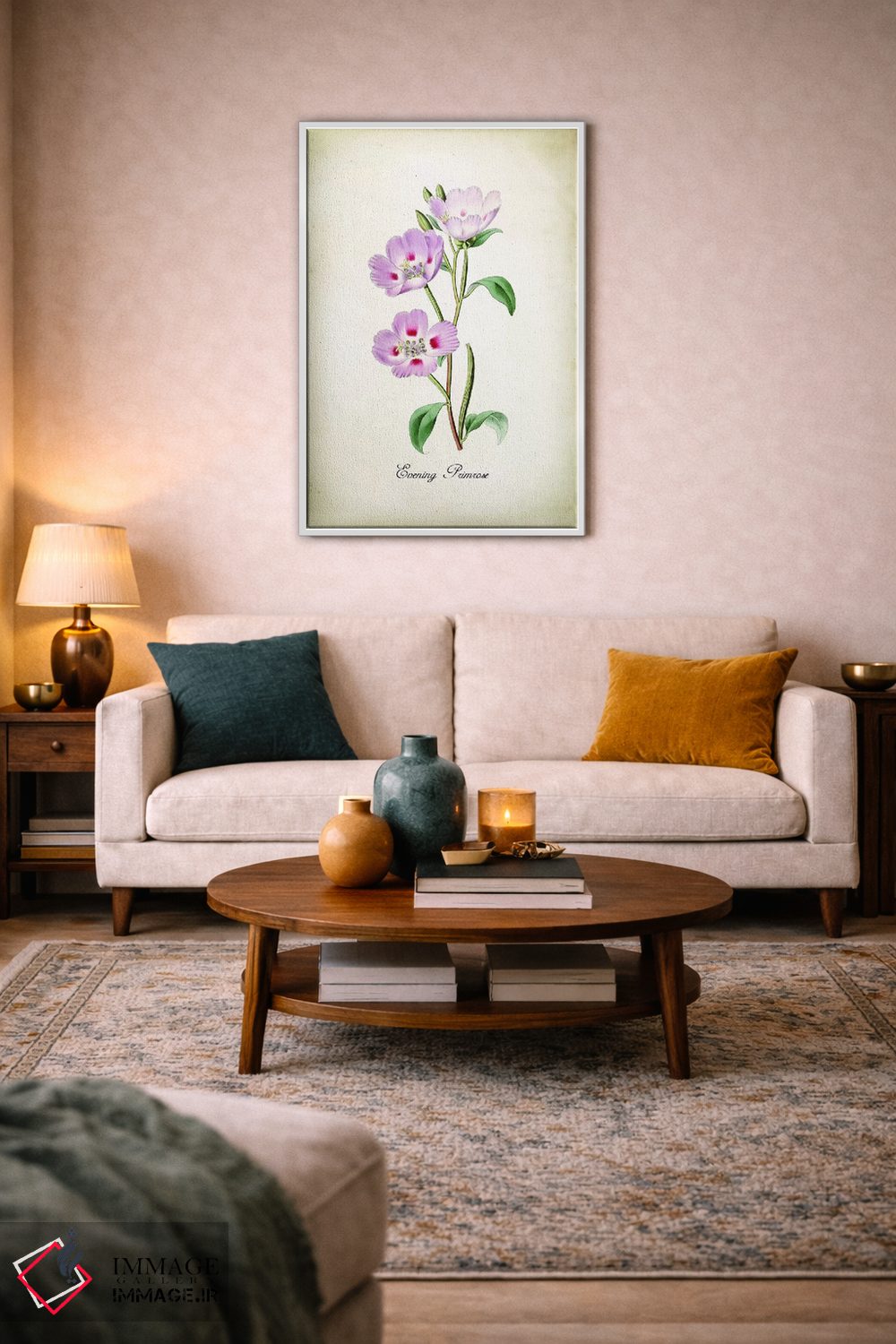 براساس پالت ترکیبی اثر، قاب بلوط روشن (چوبی) پیشنهاد اول است و استخوانی ملایم مکمل. برای سفارشهای پروژهای با ابعاد و قابهای اختصاصی با ایماژ در تماس باشید.
