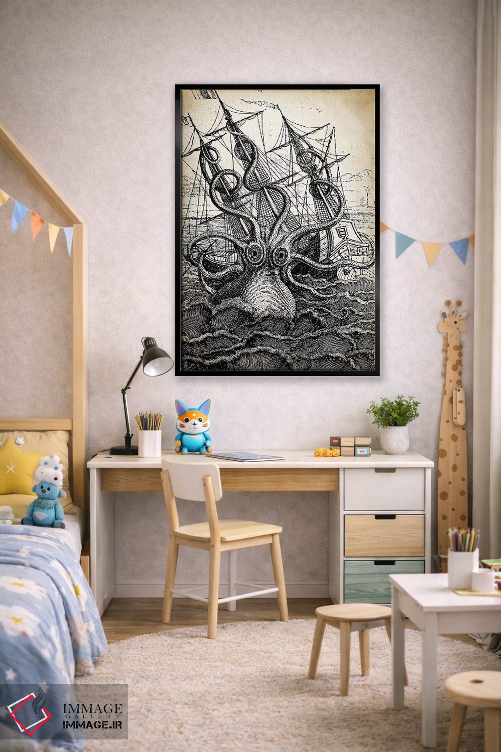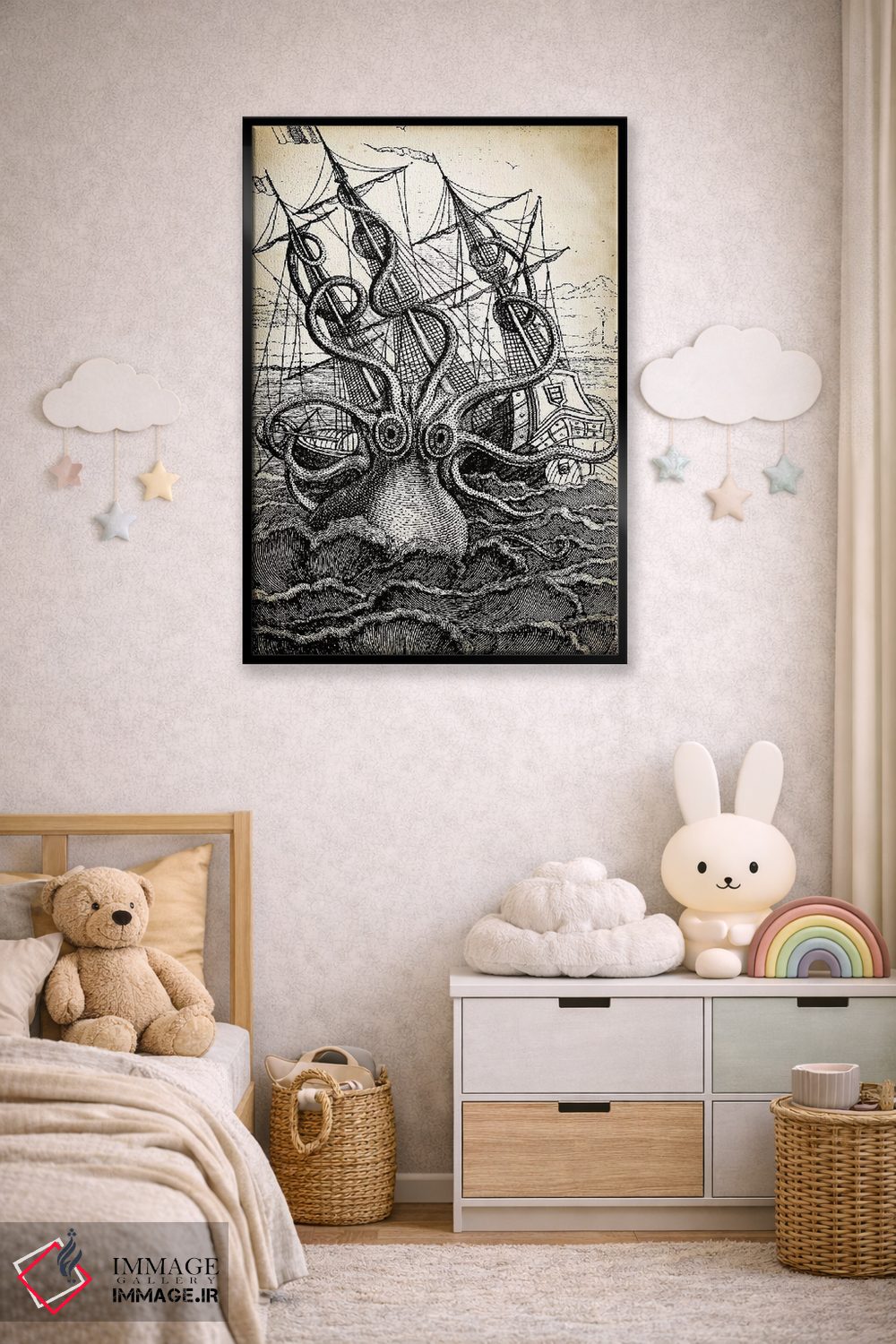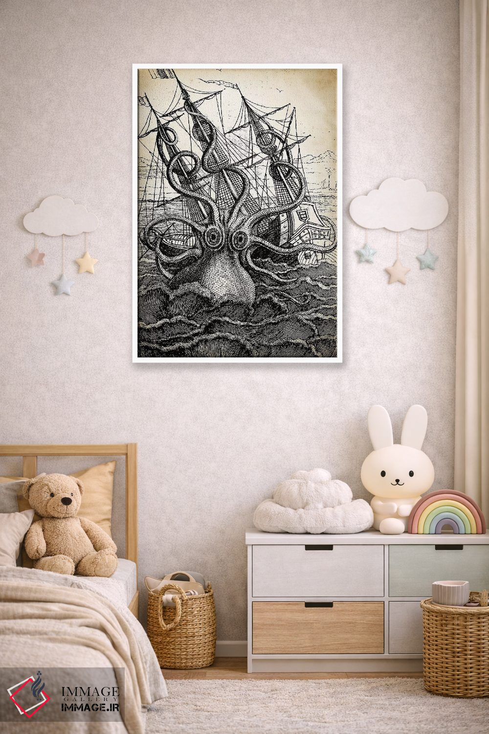 تابلو دکوراتیو کراکن اثر پتنت پرینت استور - نمای روبه‌رو روی دیوار