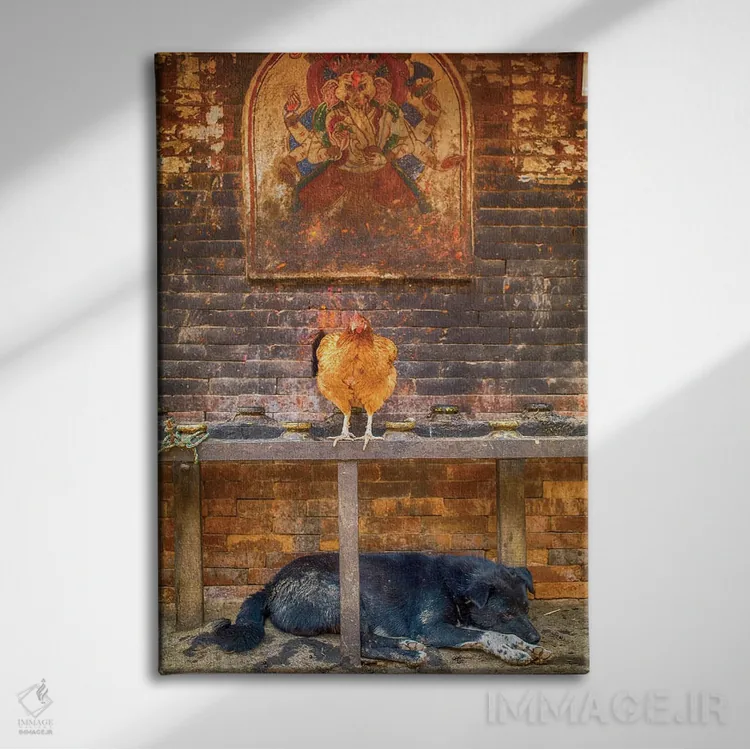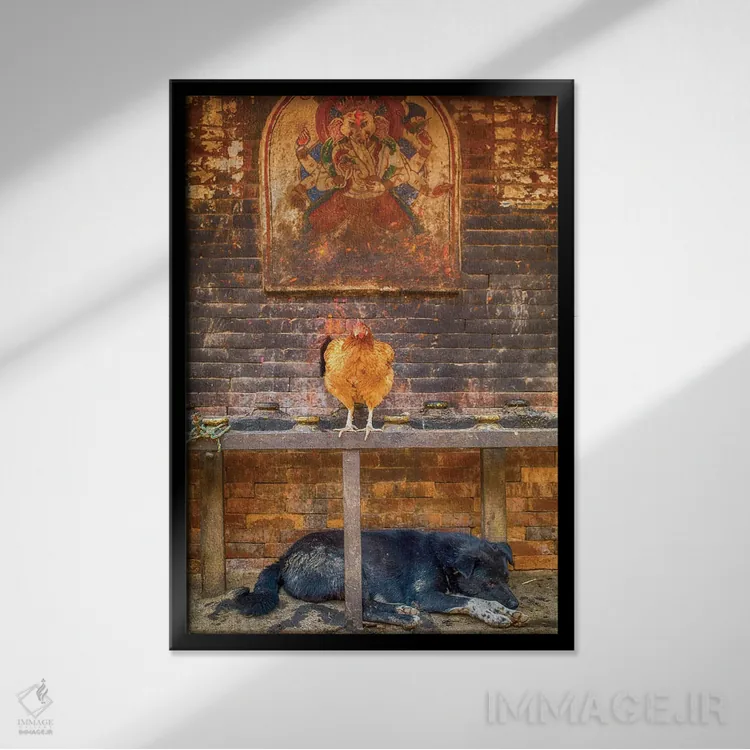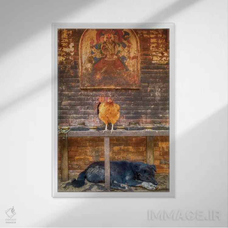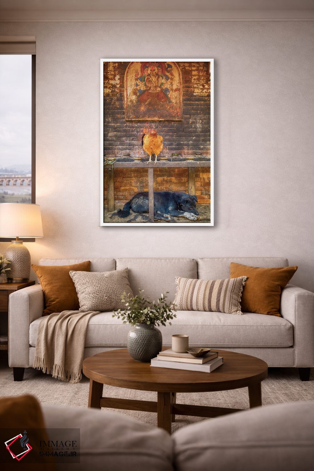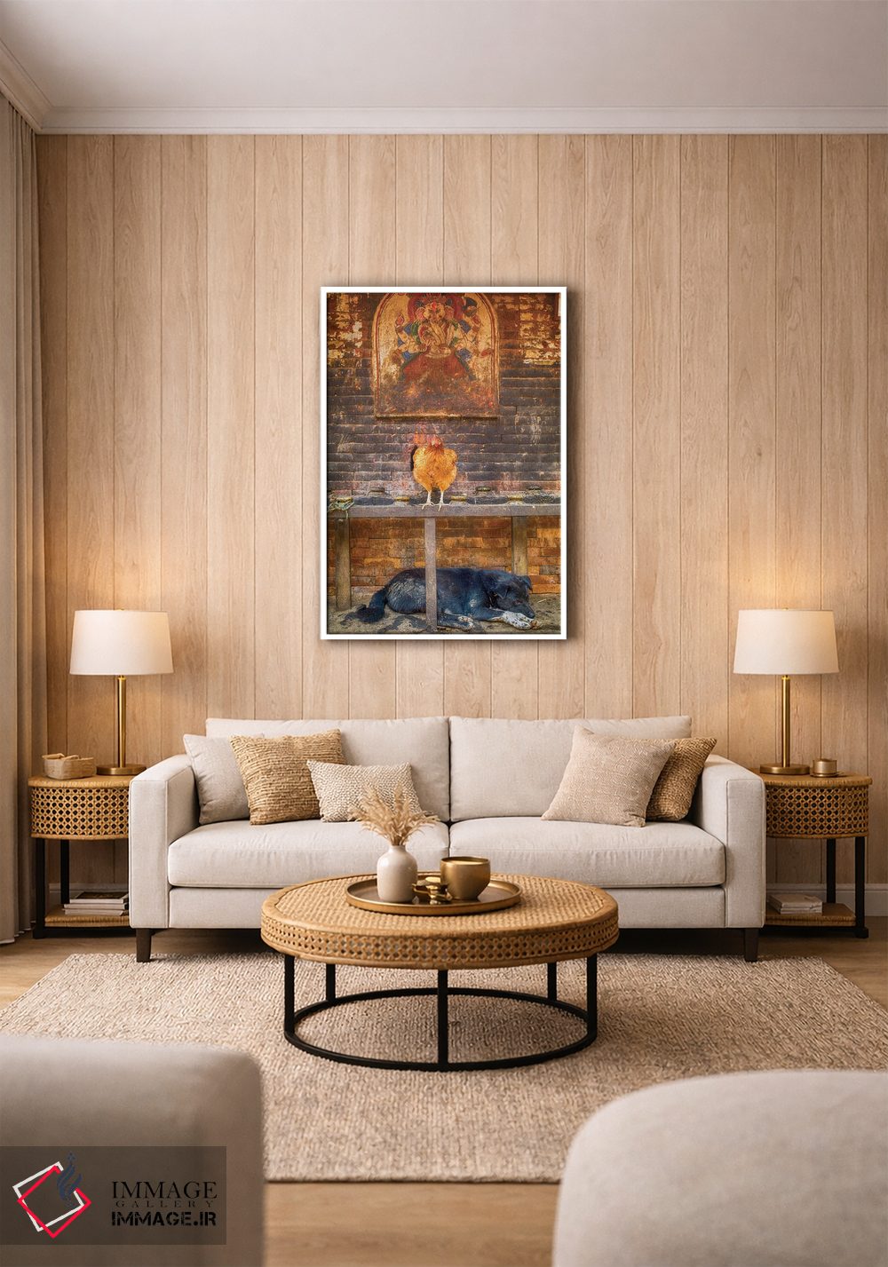 «بهاکتاپور نپال، گانش، مرغ و سگ خوابیده» اثرِ «مارک پائولدا» با حالوهوای آسیایی، کنار نور ملایم و متریالهای طبیعی (چوب/سنگ) بسیار خوشفرم دیده میشود.