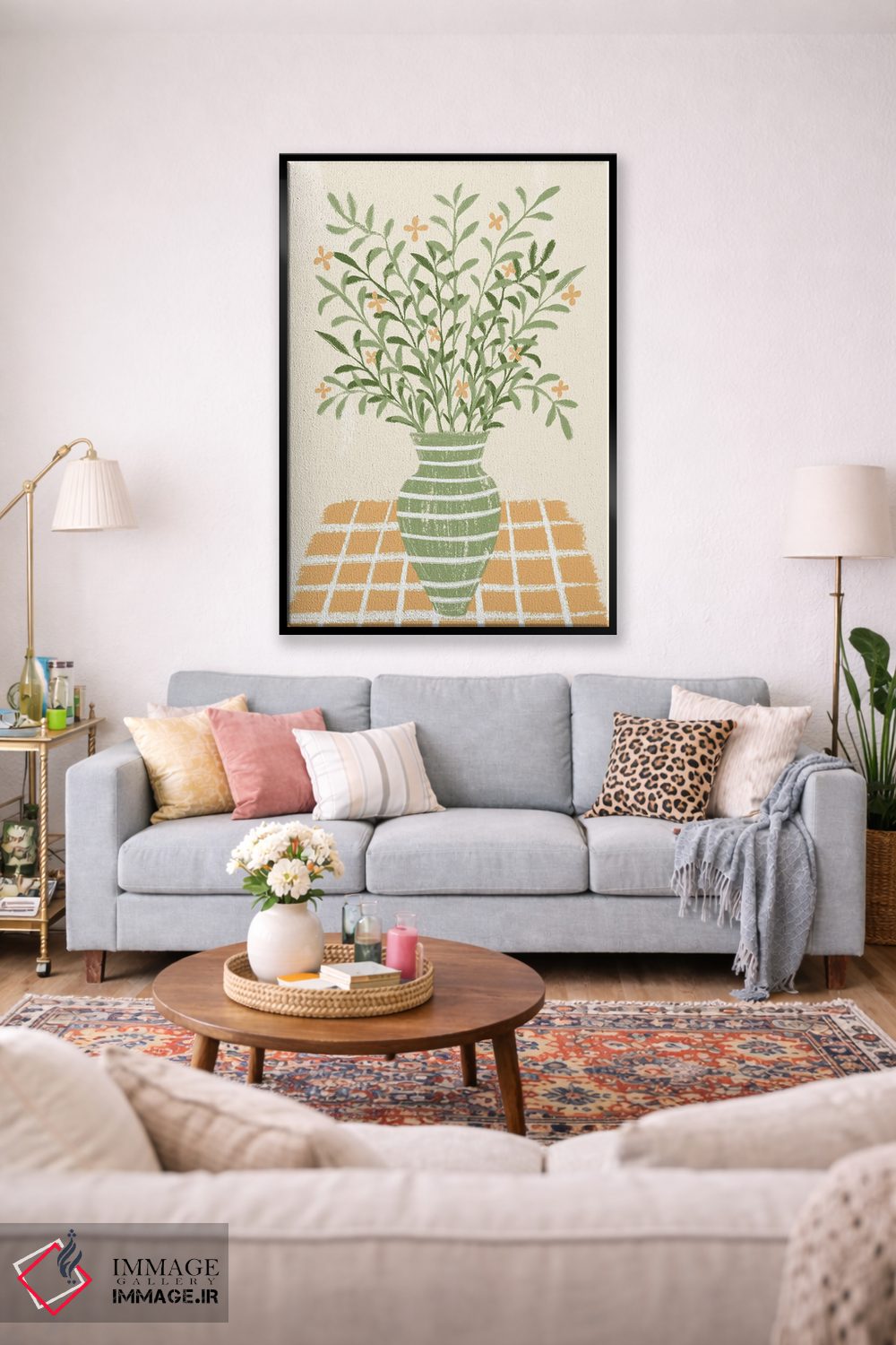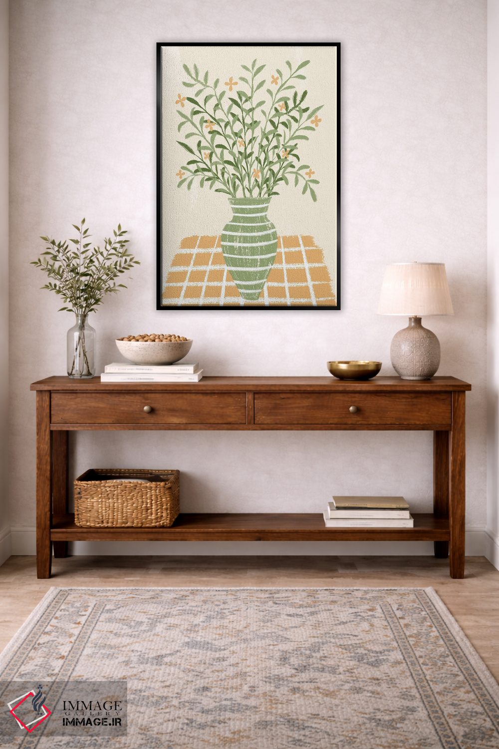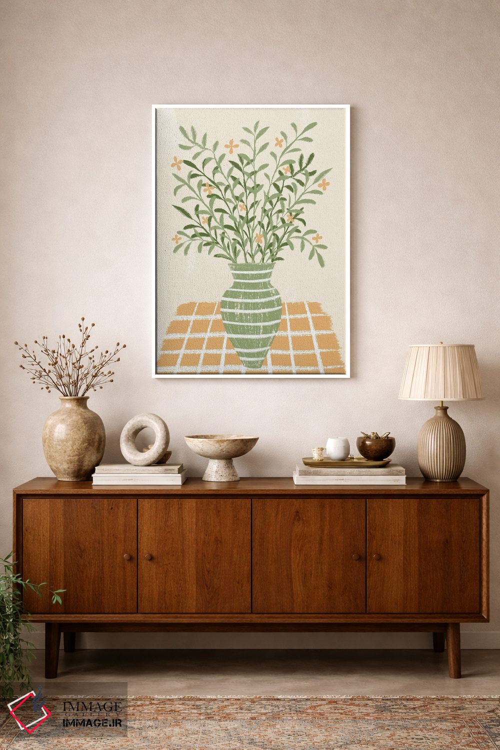 براساس پالت ترکیبی اثر، قاب بلوط روشن (چوبی) پیشنهاد اول است و استخوانی ملایم مکمل. برای سفارشهای پروژهای با ابعاد و قابهای اختصاصی با ایماژ در تماس باشید.