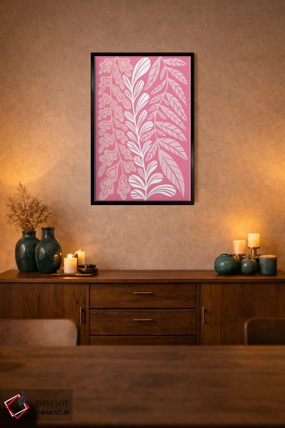 برای یک چیدمان تمیز، صورتی را در رومیزی یا شمعها بهکار ببرید تا رنگها طبیعیتر در فضا پخش شوند. انتخاب قاب هم میتواند این اکسنت را تقویت کند.