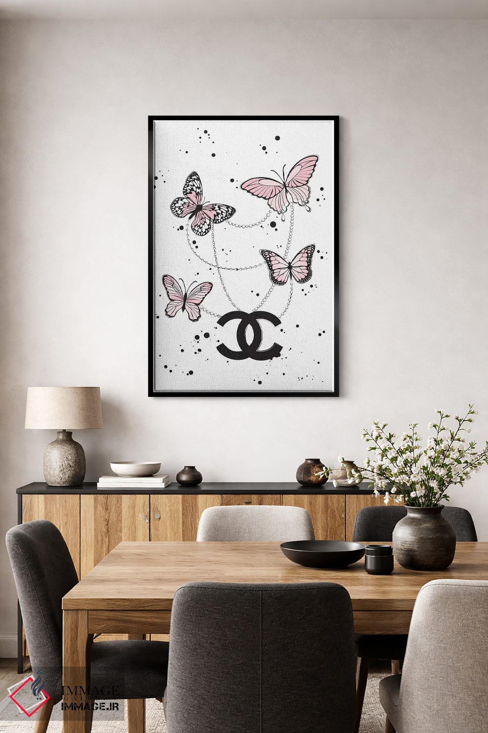 در چیدمانهای مدرن، سفید را در دستهگل خشک جا بدهید تا محیط حرفهایتر به نظر برسد. انتخاب قاب هم میتواند این اکسنت را تقویت کند.