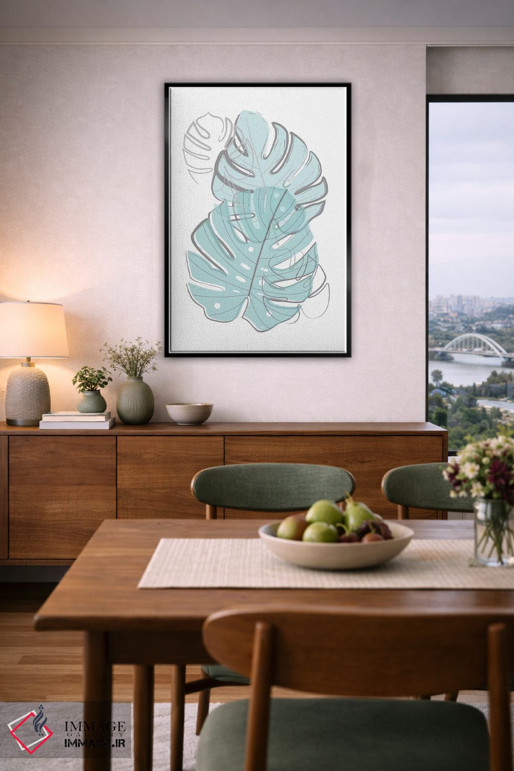 اگر دوست دارید دیوار روشنتر و آرامتر دیده شود، «برگهای آبی» اثرِ «مارتینا پاولوا» به دیوار، روشناییِ ملایم و دلنشین میدهد، برای فضای غذاخوری گزینهٔ مناسبیست. در کنار گیاهان آپارتمانی، هماهنگتر هم میشود.