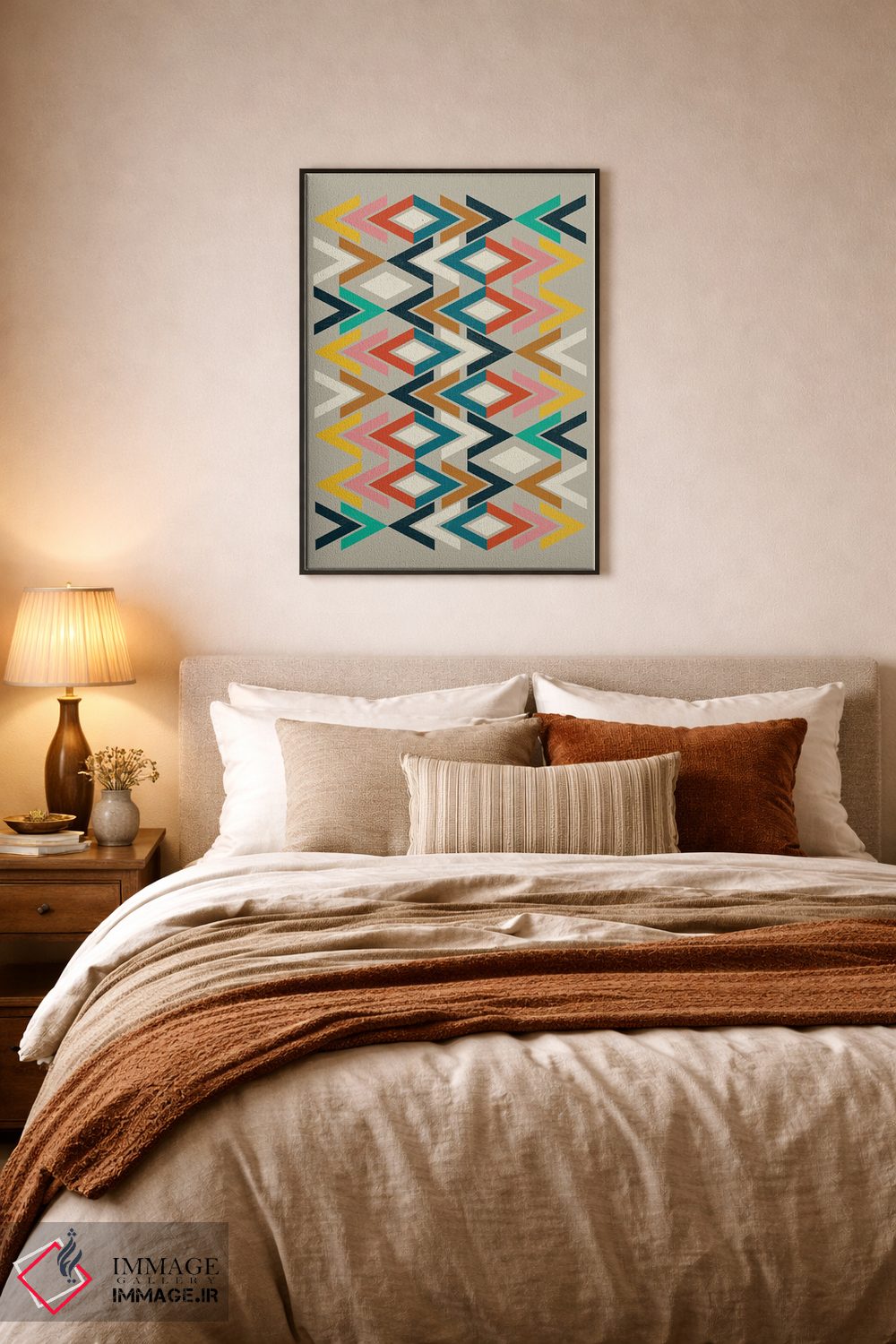 براساس پالت ترکیبی اثر، قاب تیک گرم (چوبی) پیشنهاد اول است و مشکی مات (فریم متوسط) مکمل. برای سفارشهای پروژهای با ابعاد و قابهای اختصاصی با ایماژ در تماس باشید.