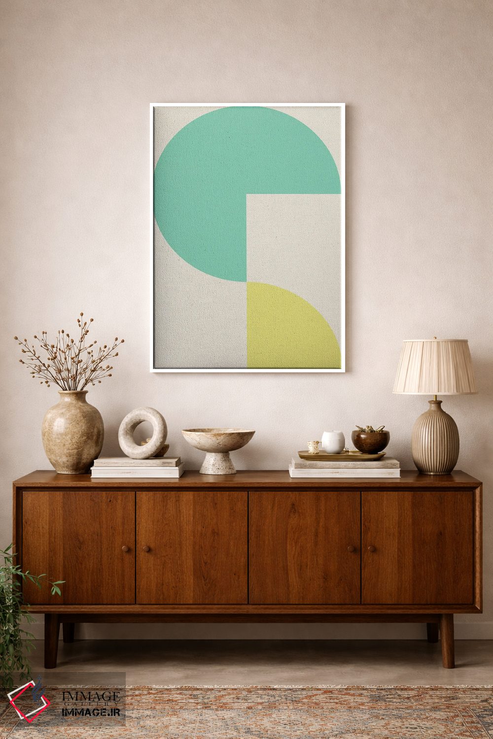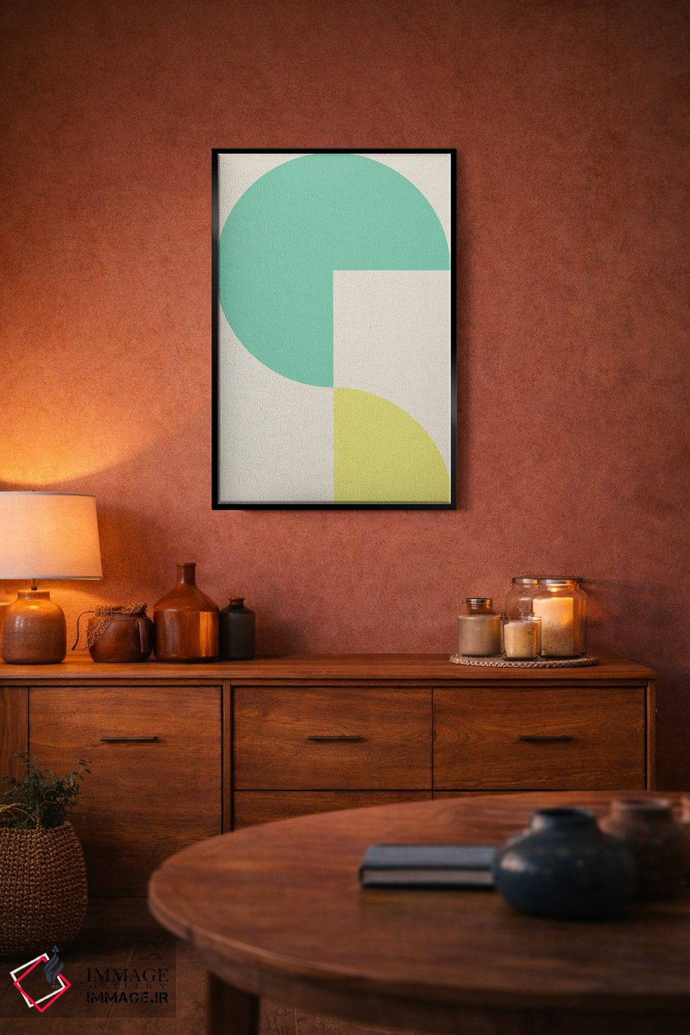 براساس پالت ترکیبی اثر، قاب تیک گرم (چوبی) پیشنهاد اول است و مشکی مات (فریم متوسط) مکمل. برای سفارشهای پروژهای با ابعاد و قابهای اختصاصی با ایماژ در تماس باشید.