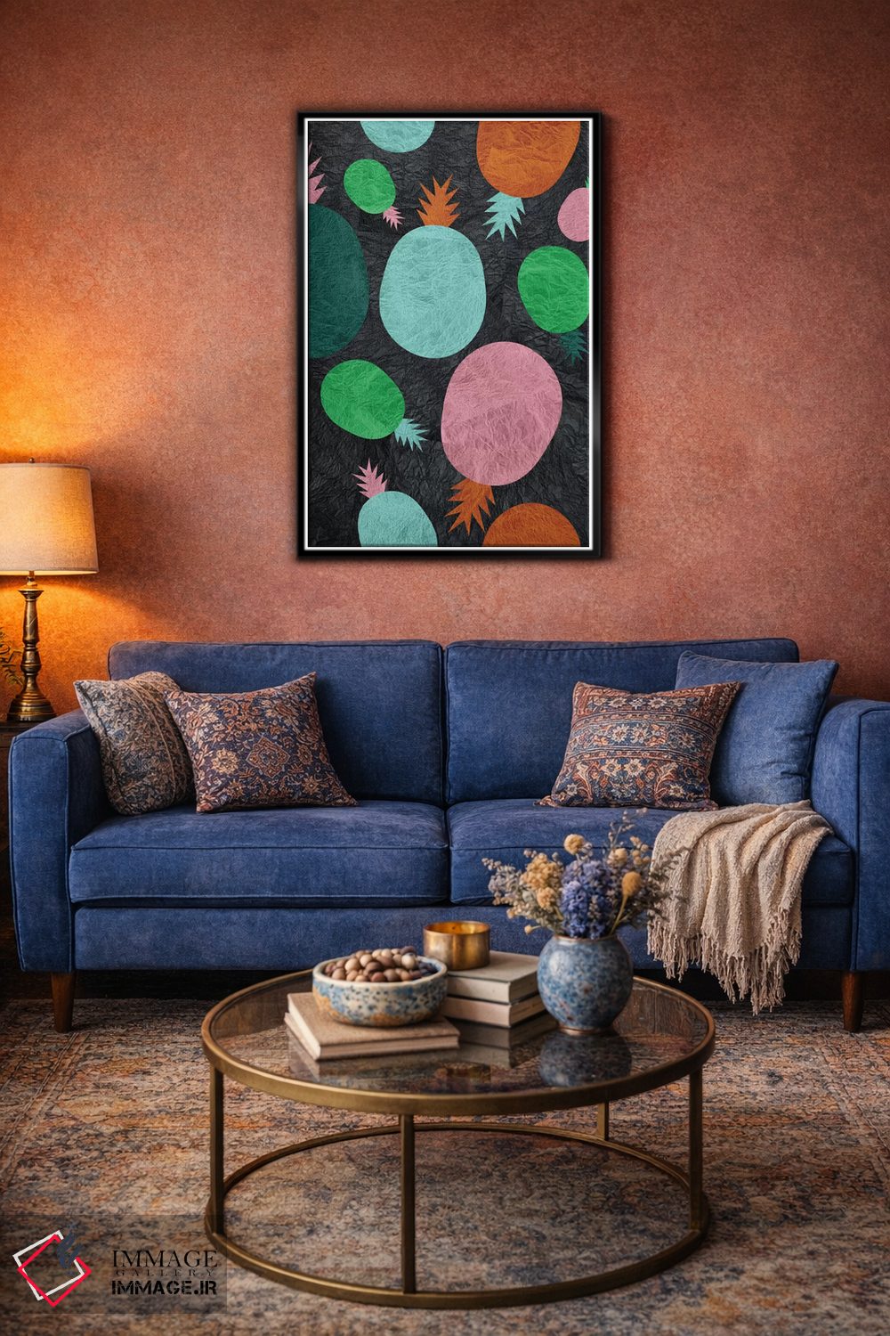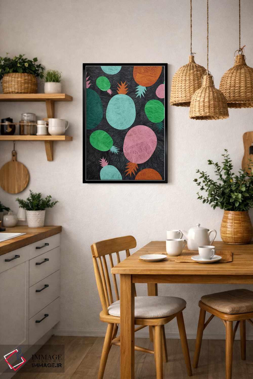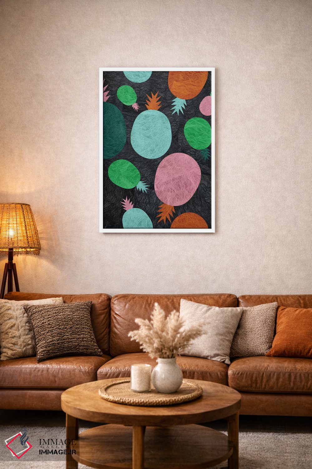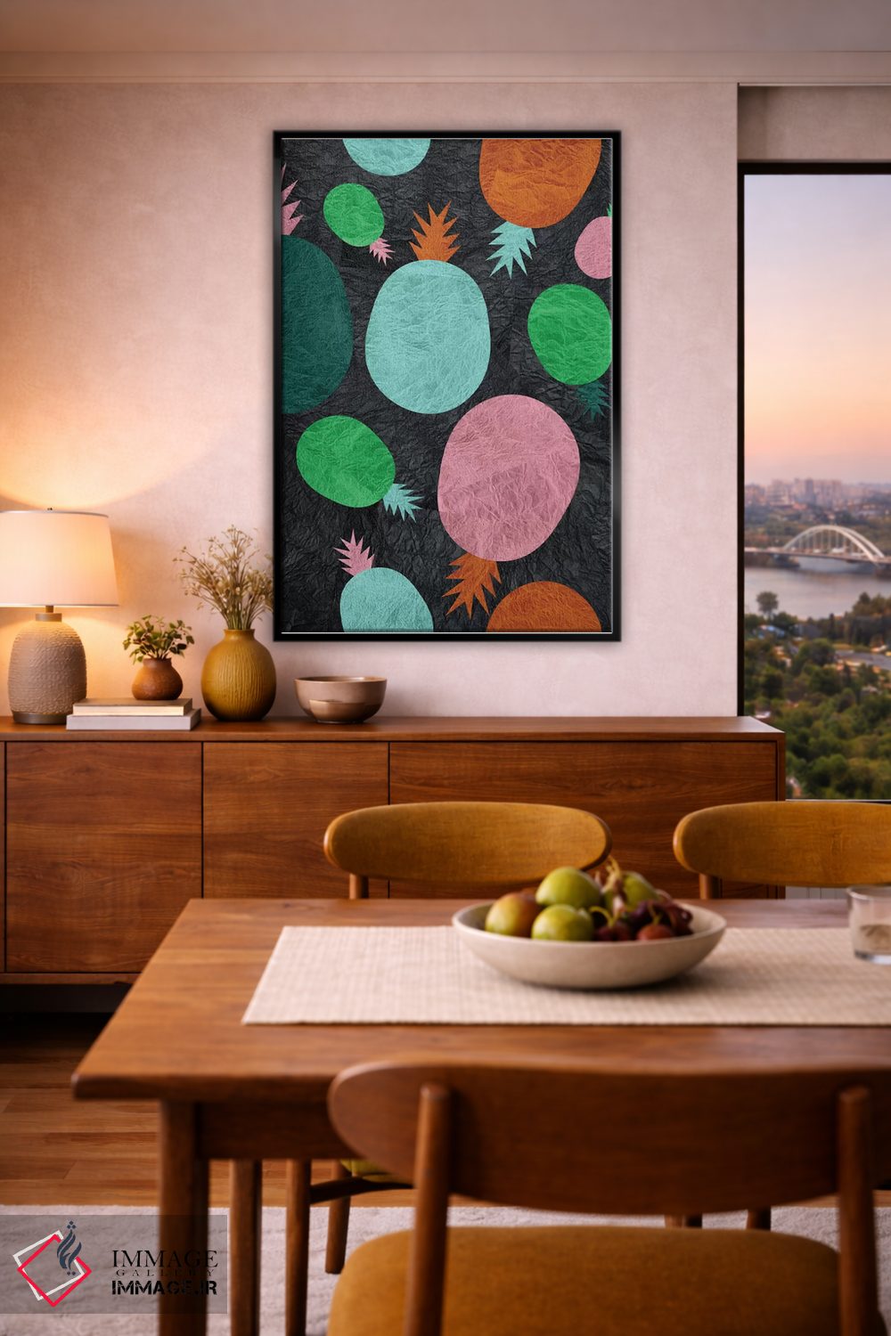 براساس پالت ترکیبی اثر، قاب تیک گرم (چوبی) پیشنهاد اول است و مشکی مات (فریم متوسط) مکمل. برای سفارشهای پروژهای با ابعاد و قابهای اختصاصی با ایماژ در تماس باشید.