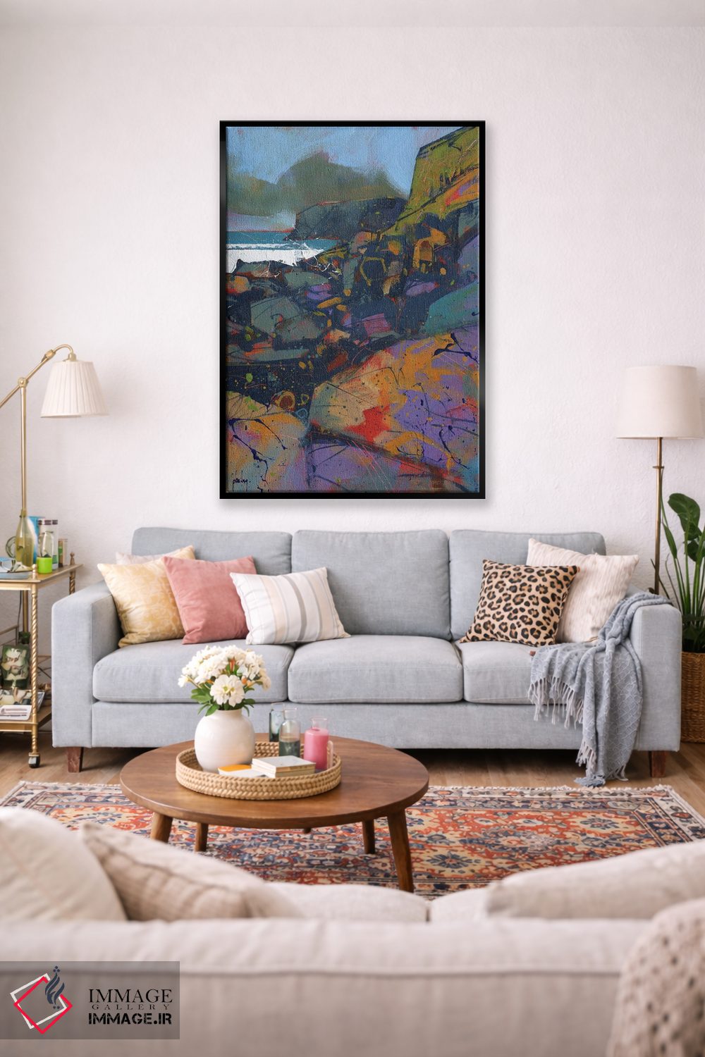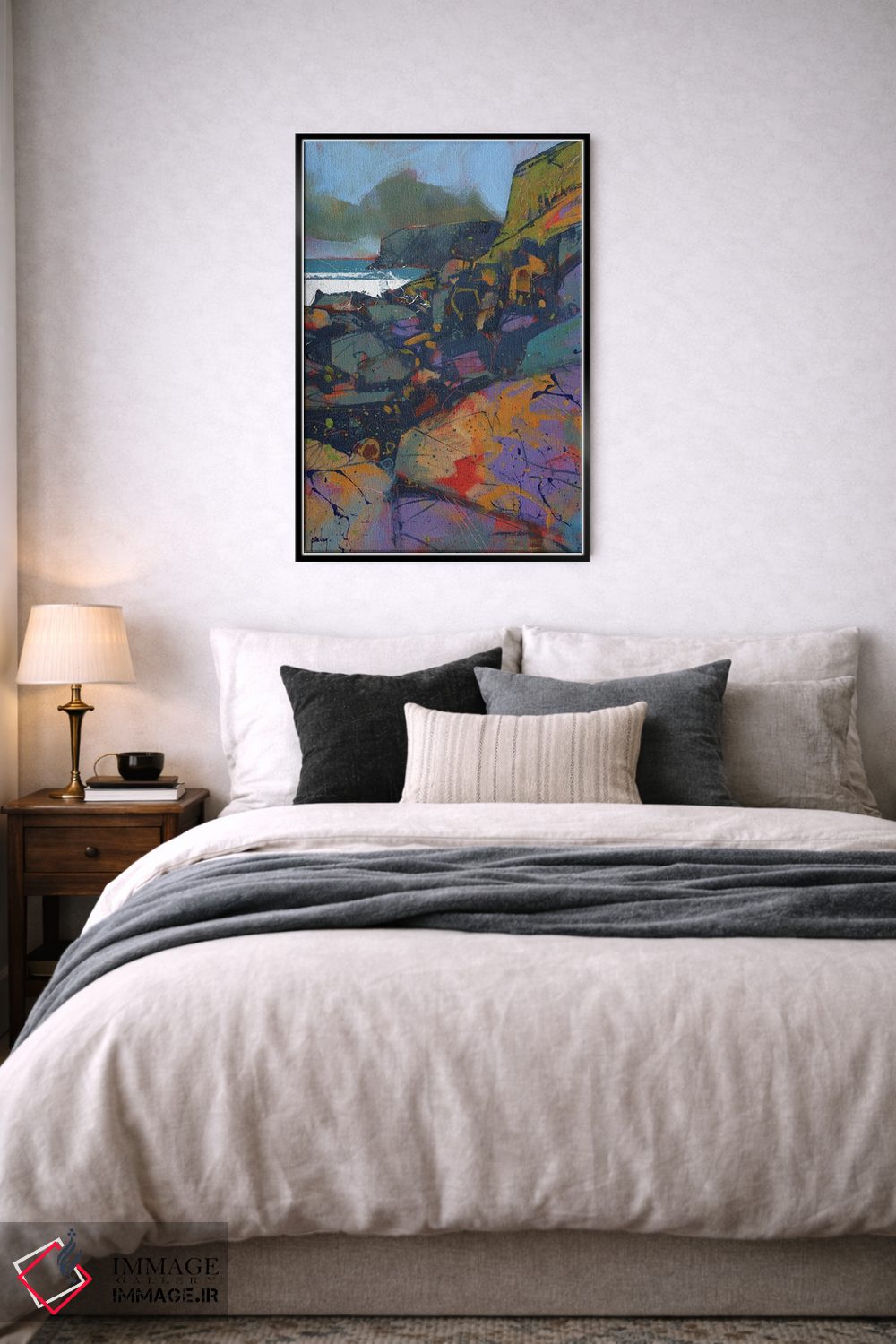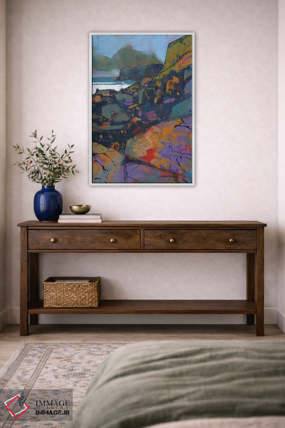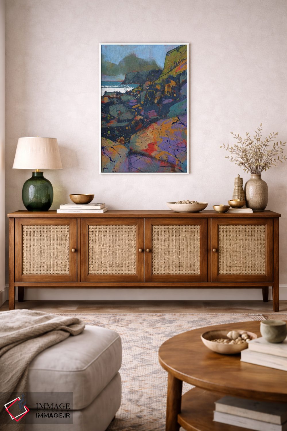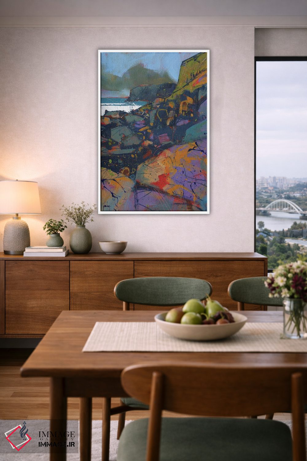 براساس پالت ترکیبی اثر، قاب تیک گرم (چوبی) پیشنهاد اول است و مشکی مات (فریم متوسط) مکمل. برای سفارشهای پروژهای با ابعاد و قابهای اختصاصی با ایماژ در تماس باشید.